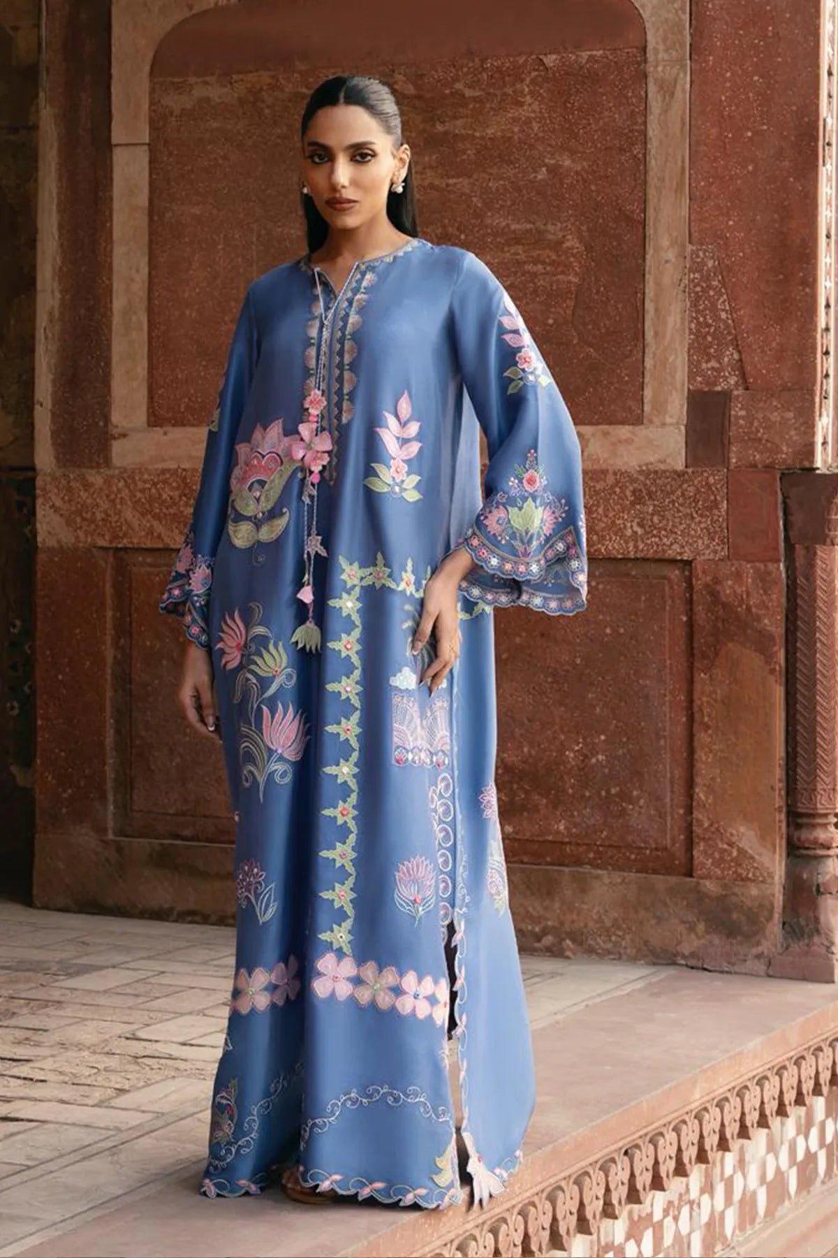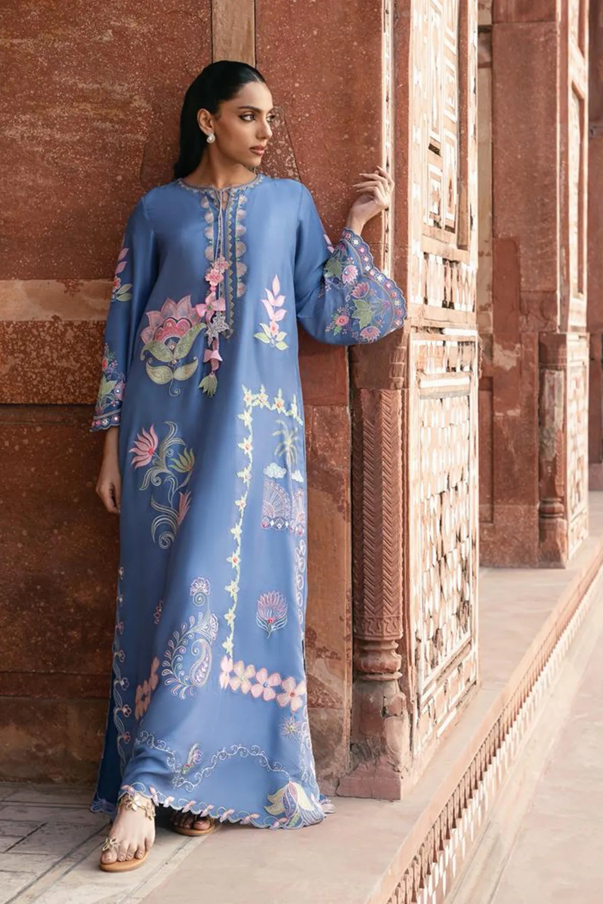 Our Cornflower Blue MAHEEN made from pure raw silk 80gm ,This Kaftan will slot perfectly into your Eid wardrobe. It features fine single Aari embroidery in the perfect hues inspired by Mughal motifs..