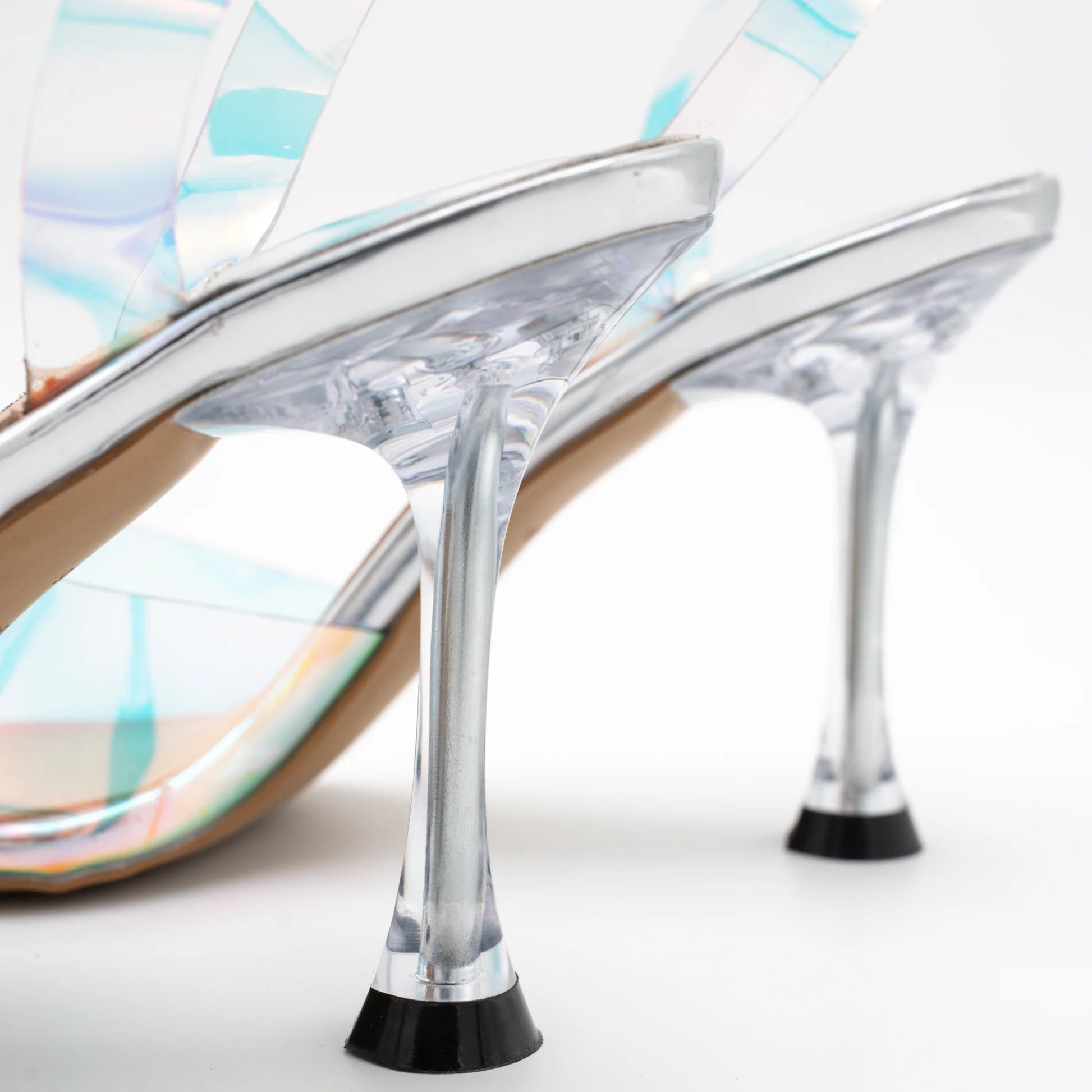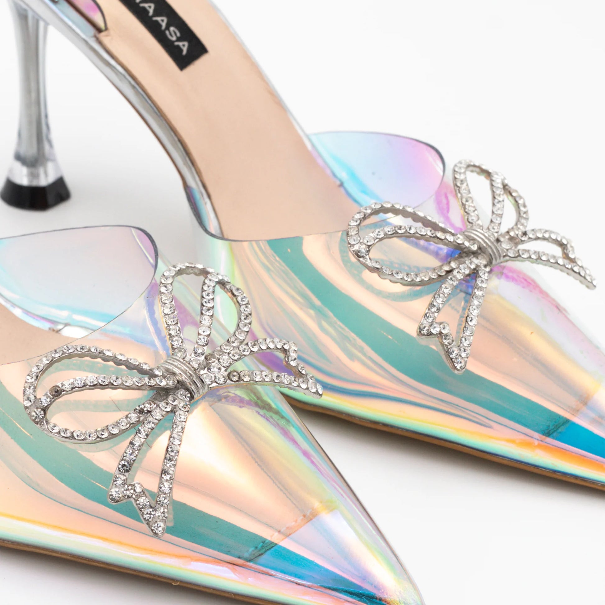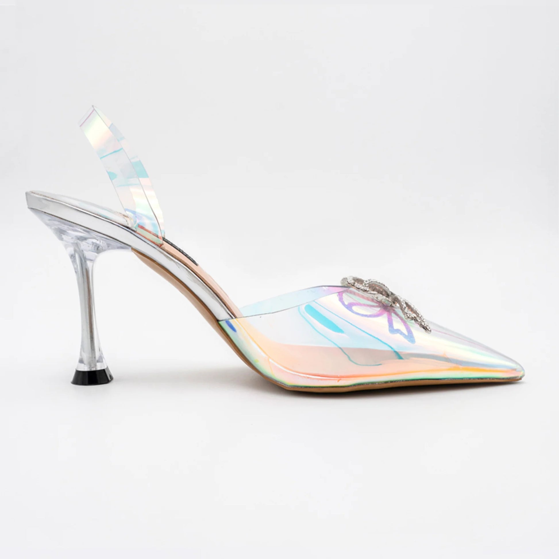 A striking heel featuring a holographic pointed silhouette, clear strap, and a crystal-studded bow detail. Designed to bring a modern, standout finish, this pair is perfect for evenings that call for glamour with a playful edge.