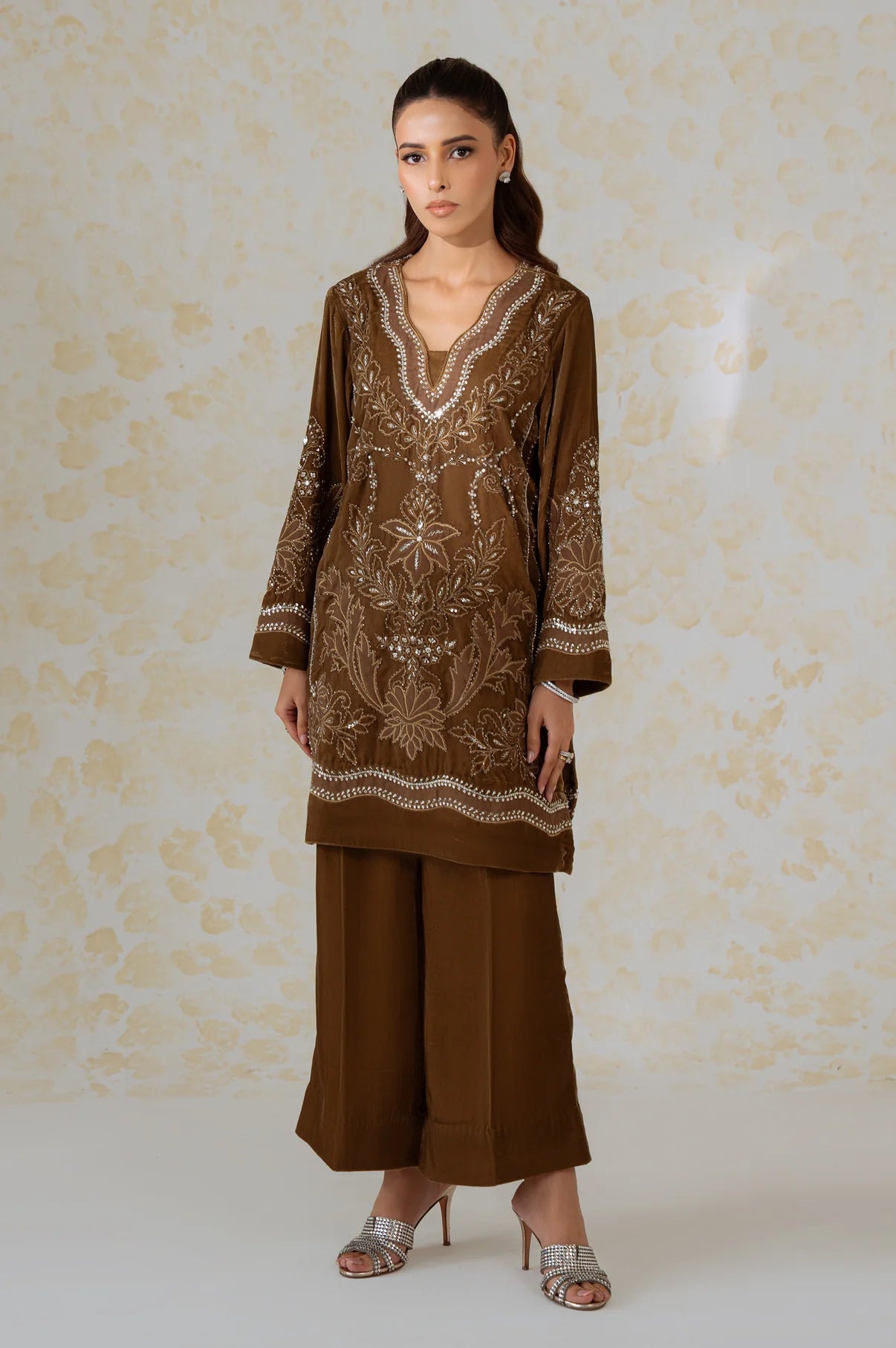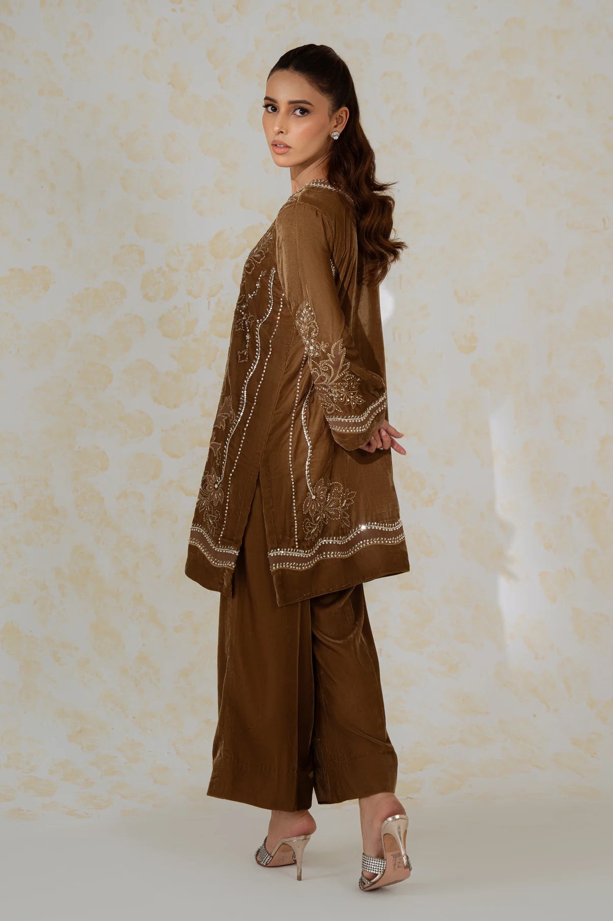 A coffee brown two-piece co-ord featuring a straight kurta crafted from luxe velvet, adorned with intricate applique patterns and embellished with delicate zardozi handwork. The kurta showcases a gracefully curved V-neckline and ornate detailing along the front and sleeves. Paired with matching wide-leg velvet trousers, this look blends timeless elegance with a touch of festive sophistication.