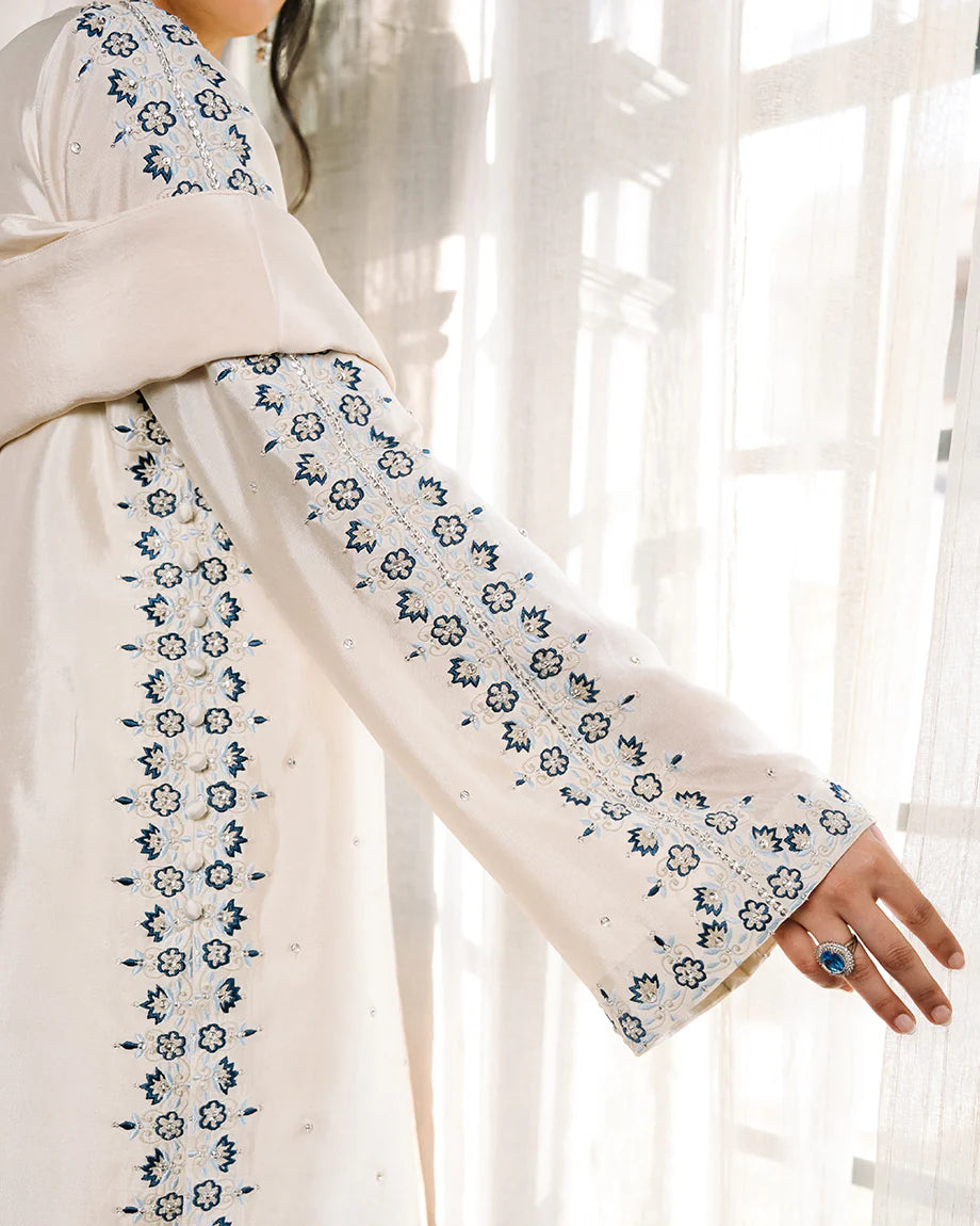 An off-white 3-piece set featuring a sheesha silk shirt and trousers with inner lining, paired with a soft silk dupatta with tie-dye detailing. Embellished with resham handwork and button accents on the shirt, designed for a flowing yet structured fit with subtle artistry.