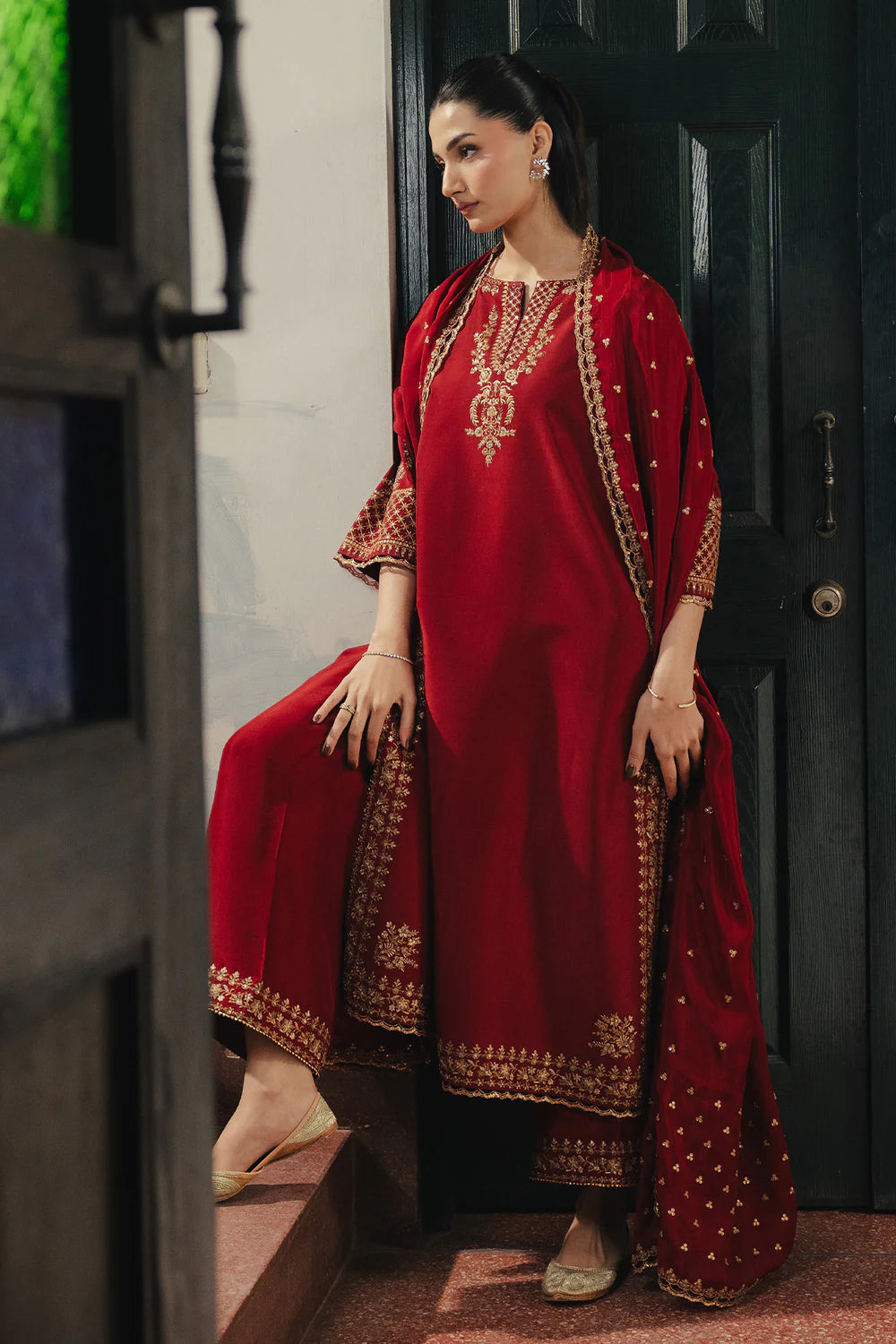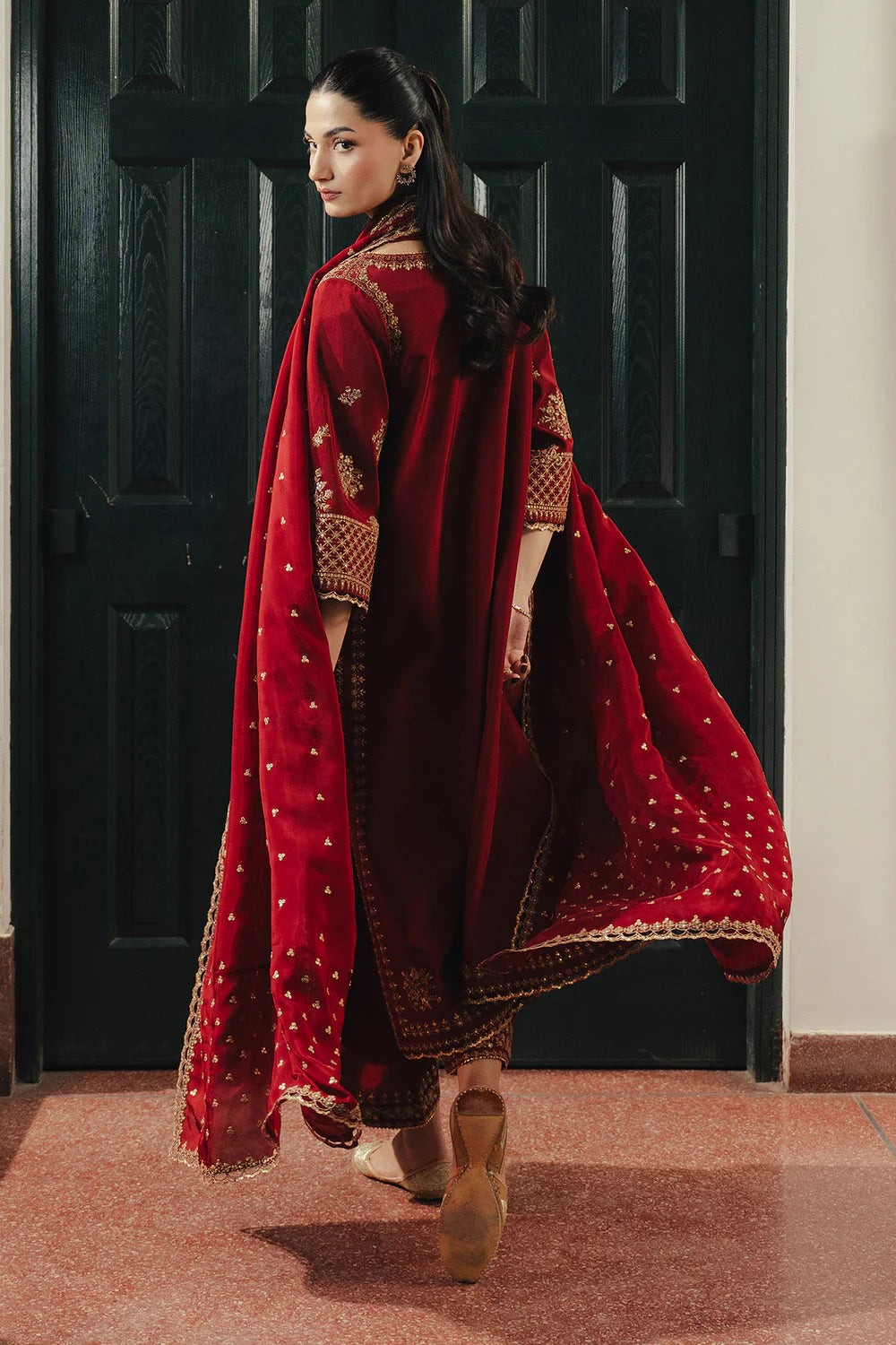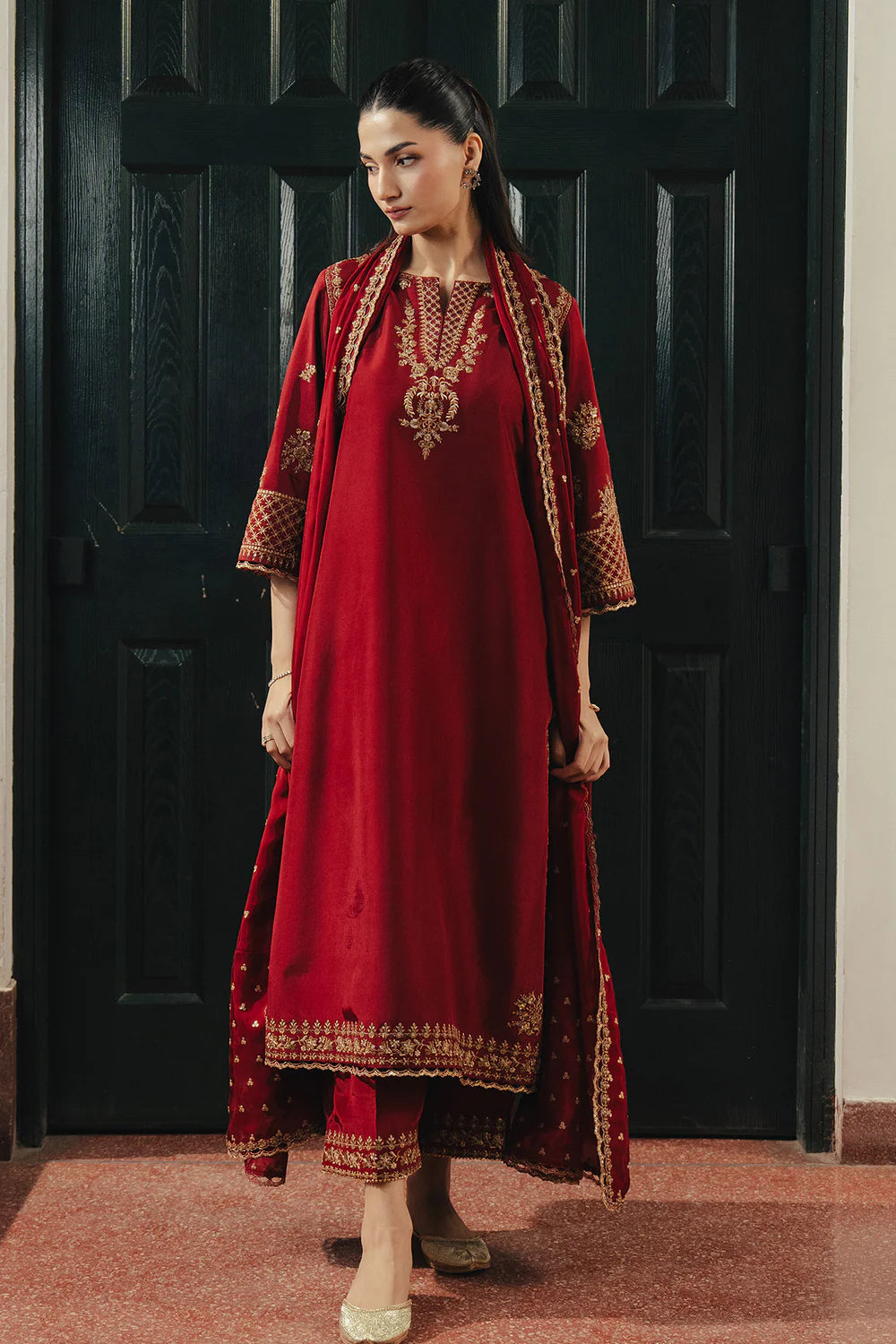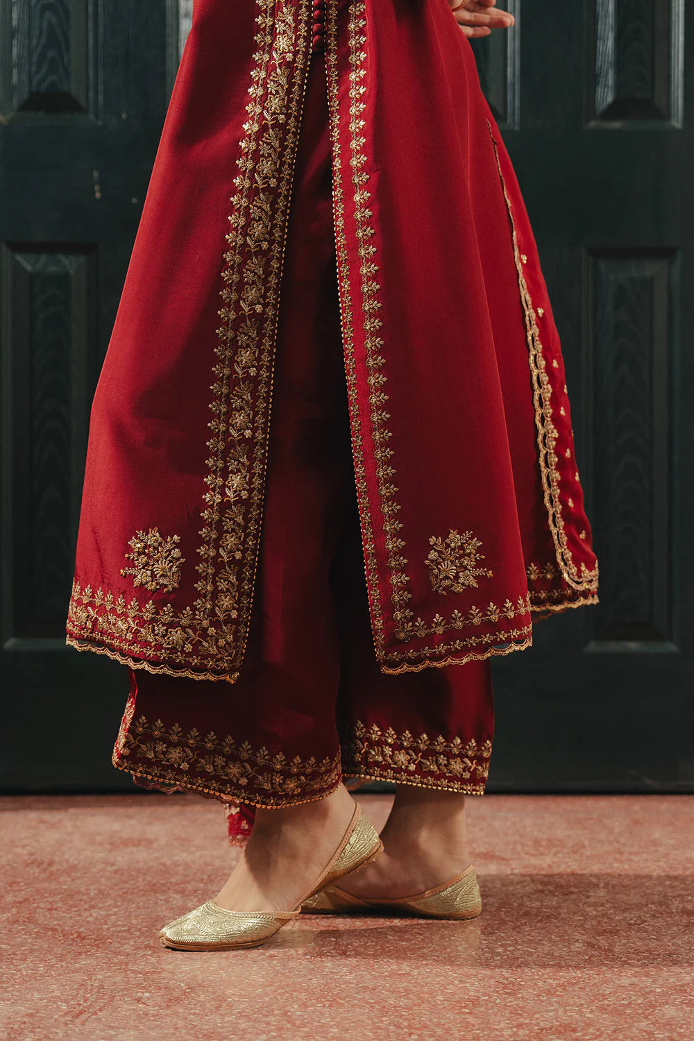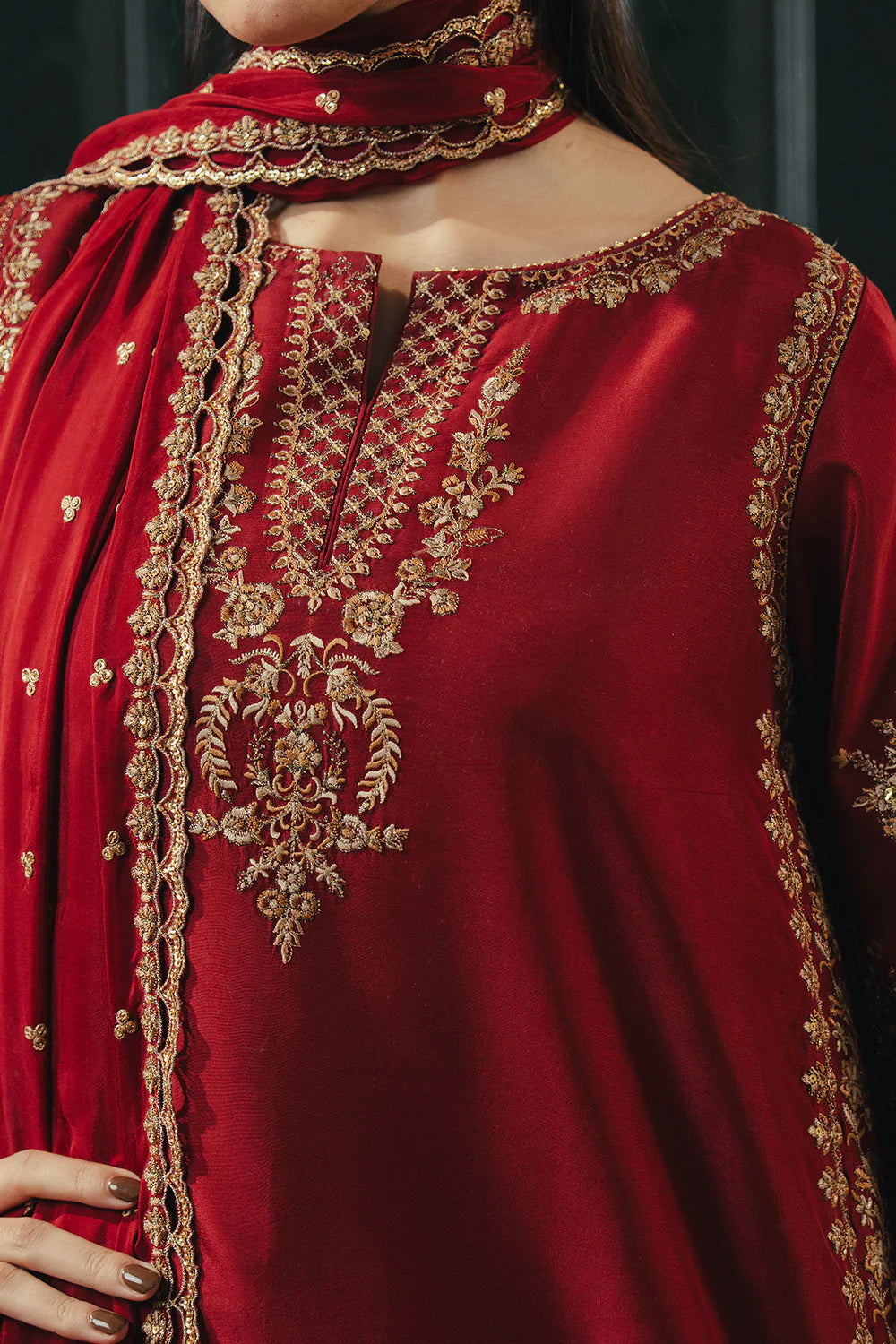 A pomegranate red ensemble adorned with floral embroidery and subtle side detailing, paired with embroidered culottes and an embroidered dupatta.