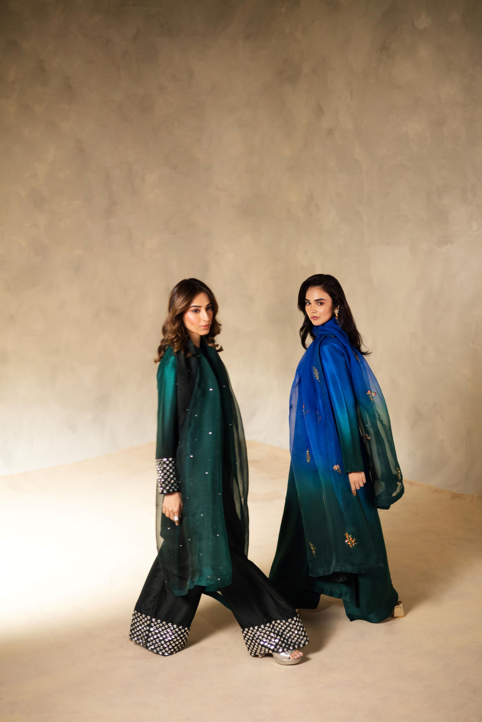 Effortlessly chic, 'Diana' our Rawsilk ombre ensemble is the epitome of festive elegance. Rich textures blend seamlessly with shimmering details, creating a look that is both luxurious and understated. The exquisite threadwork and subtle sequin accents add a touch of glamour, making it perfect for any celebratory occasion.