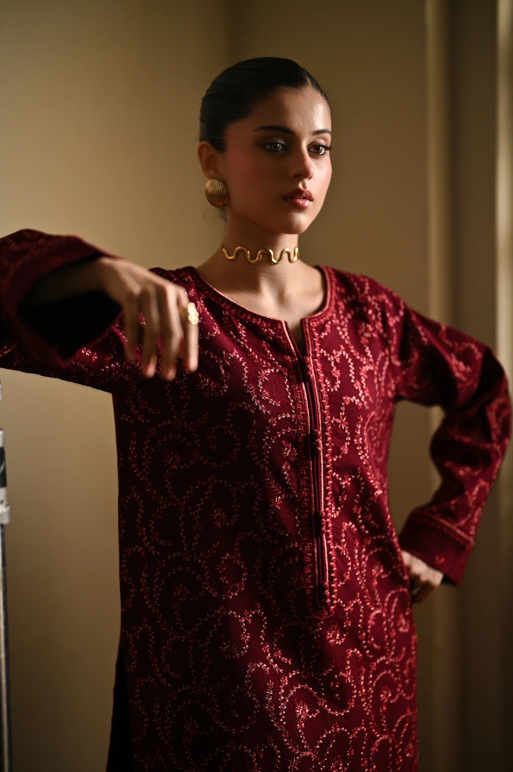 This refined 2-piece Rice Karandi article comes in a rich maroon tone, beautifully enhanced with intricate all-over embroidery in a contrasting thread for a sophisticated winter look. The shirt features a straight-cut silhouette with a round neckline and a subtle slit, finished with delicate detailing on the placket and sleeves. Crafted from premium rice karandi fabric, it offers a soft, warm, and slightly textured feel—perfect for the winter season. Paired with a straight trouser to complete the elegant ensemble, this outfit is ideal for casual gatherings, everyday wear, and semi-formal occasions, combining comfort, grace, and timeless charm.