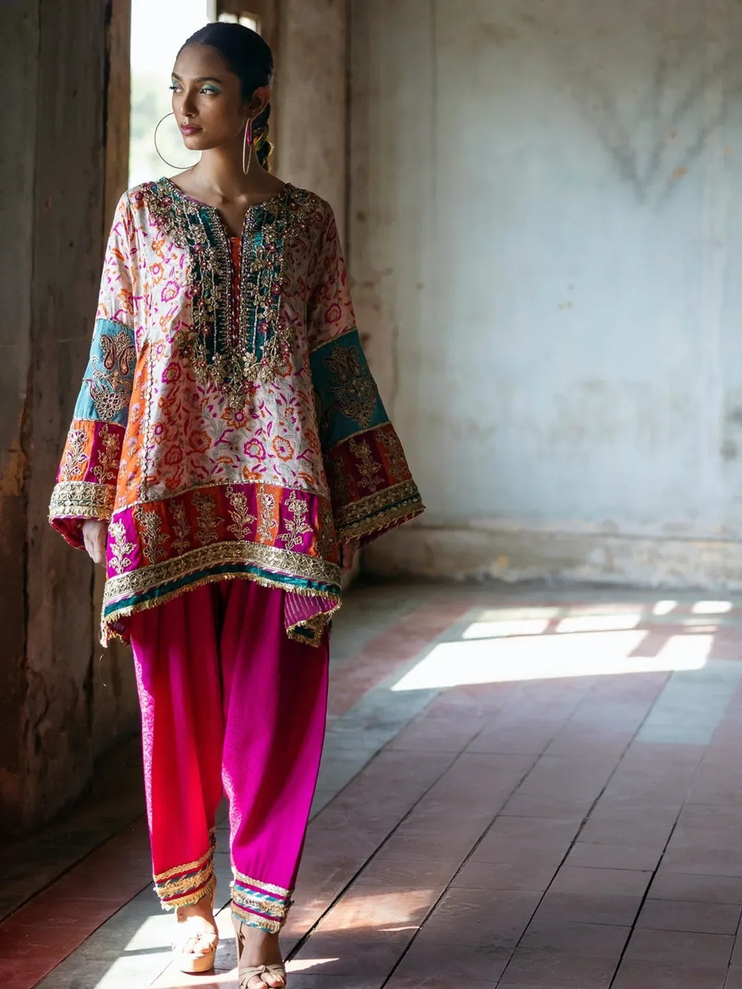 This vibrant A-line short shirt in a multicolored block print is a celebration of artisanal elegance. The velvet neckline brings a touch of luxury, beautifully adorned with resham work and hand embellishments of gold dabka, nakshi, pearls, and colored sequins. Exaggerated sleeves feature hand block-printed borders enriched with gota, finished with velvet trim and delicate gota detailing. Paired with a hot pink silk shalwar complete with gota finishes, this ensemble effortlessly blends traditional artistry with a bold, contemporary flare.