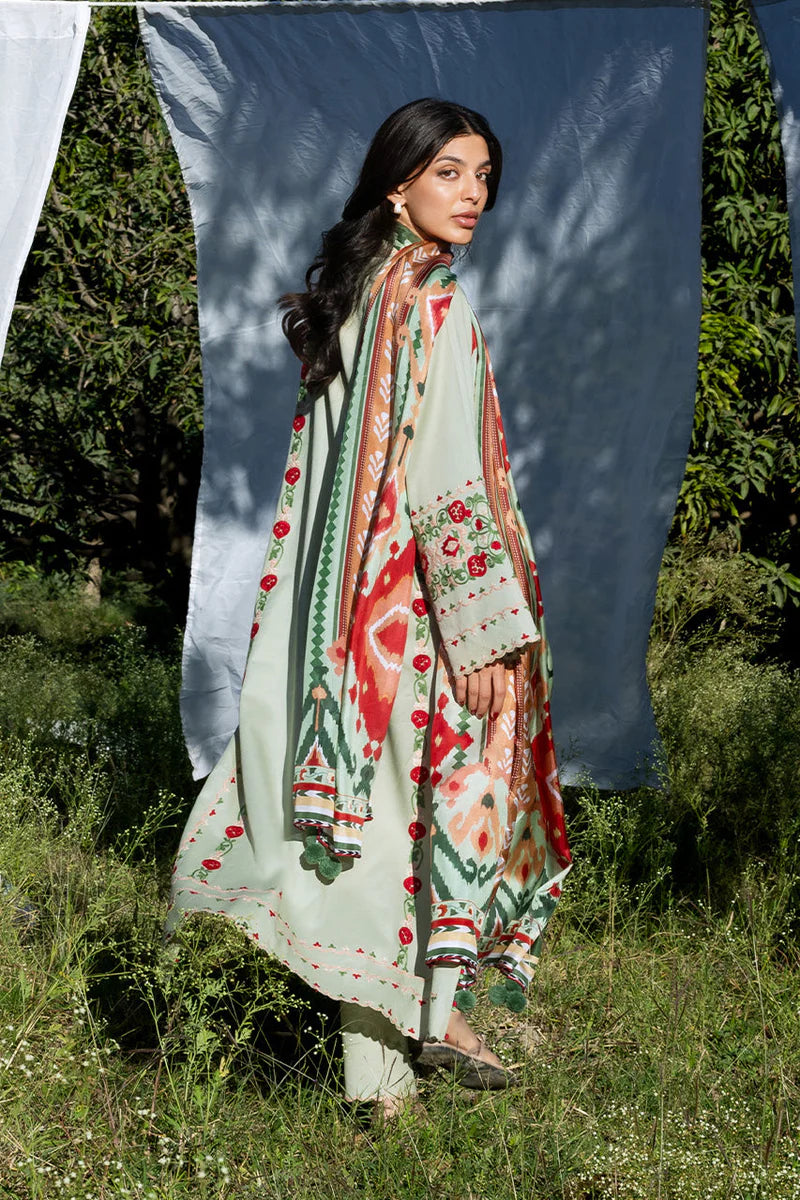 Vibrant folk elements come together in this soft pistachio jacquard lawn shirt, detailed with floral and geometric aari embroidery in accents of crimson, ivory, and sage. Delicate floral embroidery highlights the neckline, while scalloped edging traces the sleeves and hem. The look is paired with matching jacquard lawn culottes finished with scalloped edges. A printed medium silk dupatta completes the ensemble, featuring bold folkloric motifs.