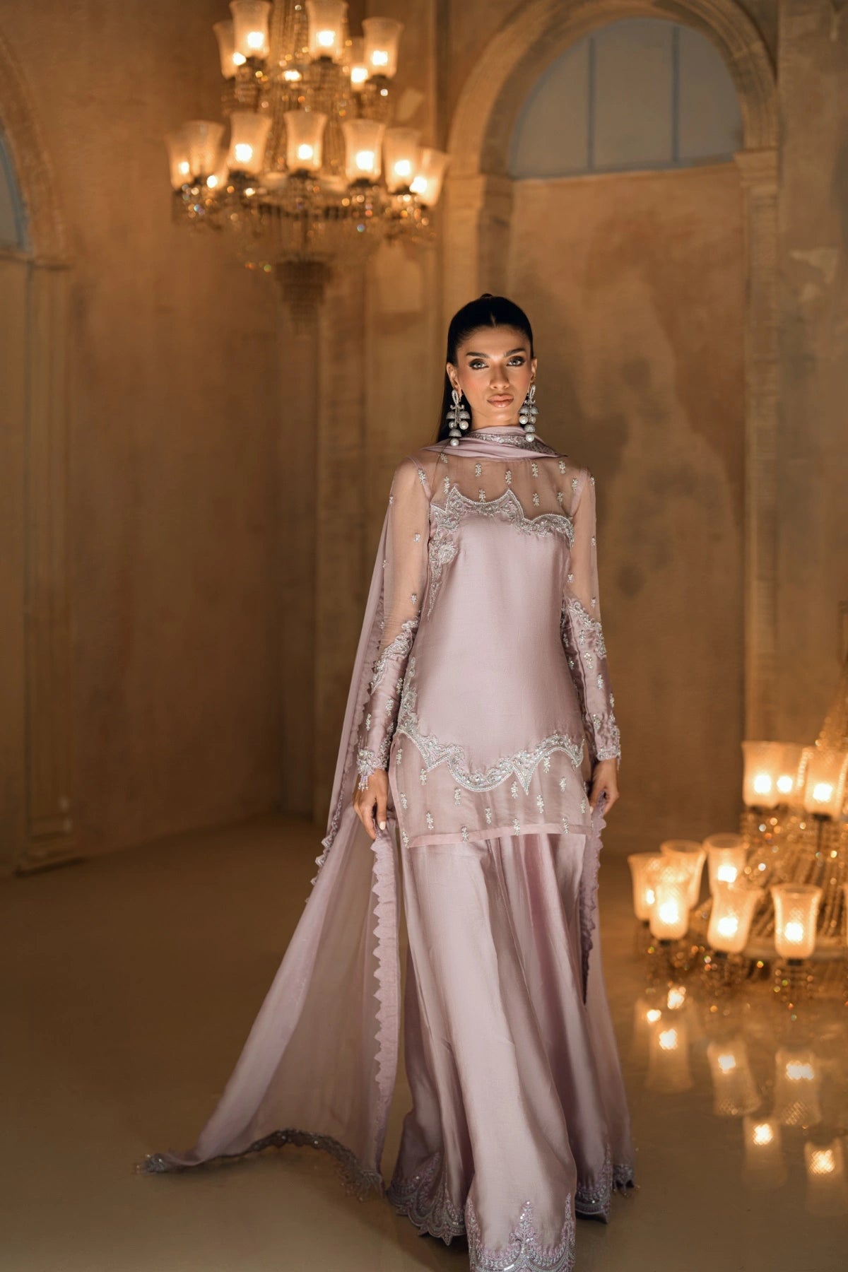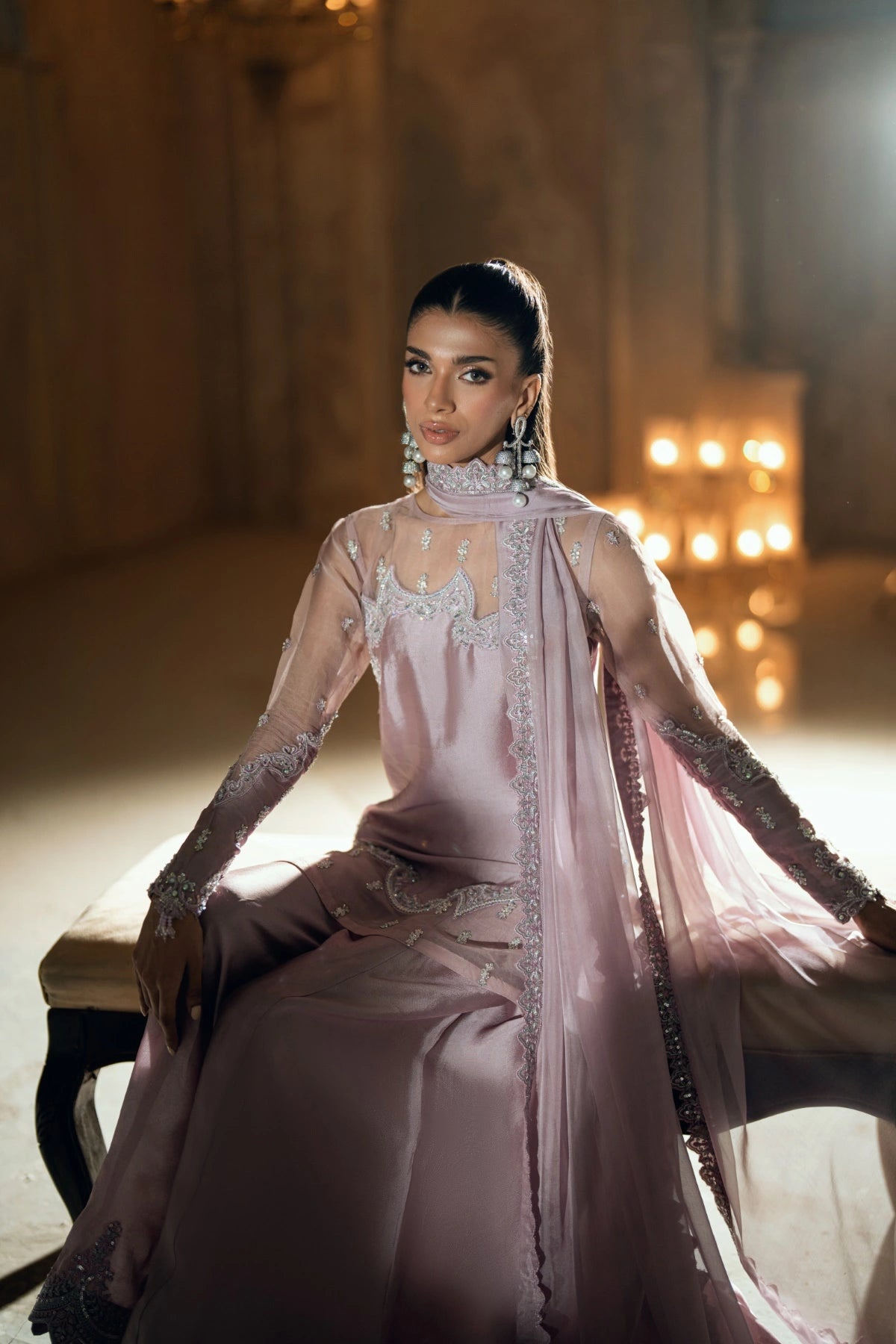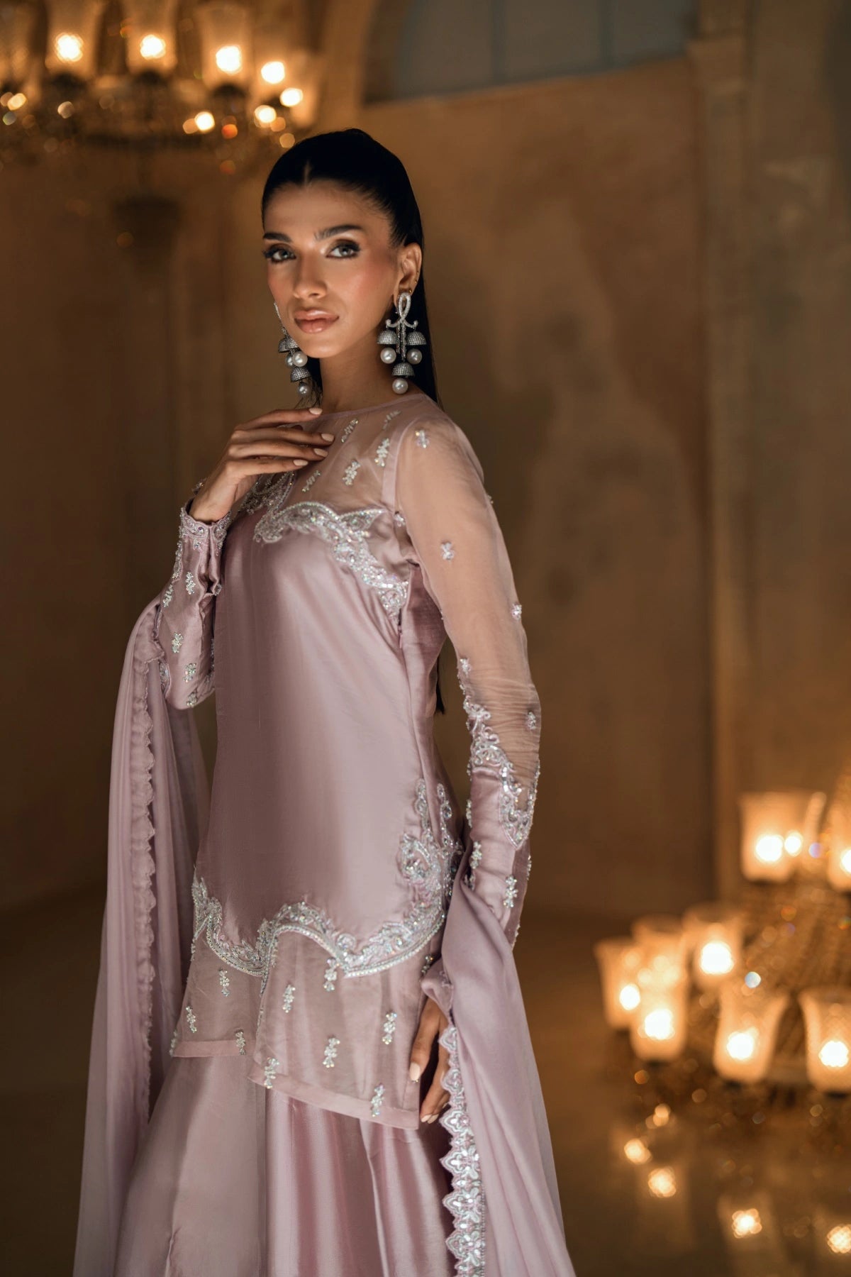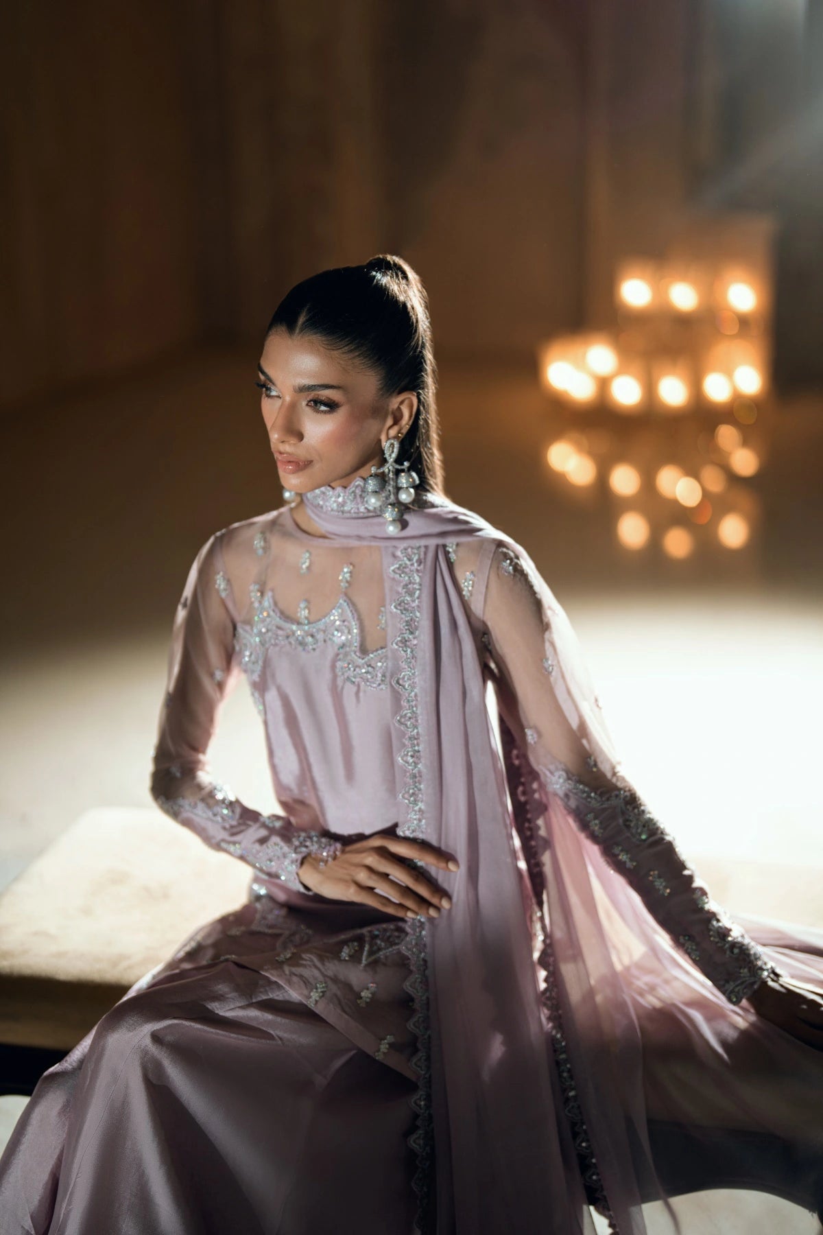 Crafted from premium sheesha silk, this elegant ensemble features a short shirt enriched with intricate hand embroidery. Shimmering cut dana, crystals, and stone work are delicately arranged across the surface, catching the light with every movement. A signature double butterfly hanging at the back adds a poetic flourish — subtle yet distinctive, echoing the dreamlike essence of the Khuab collection.