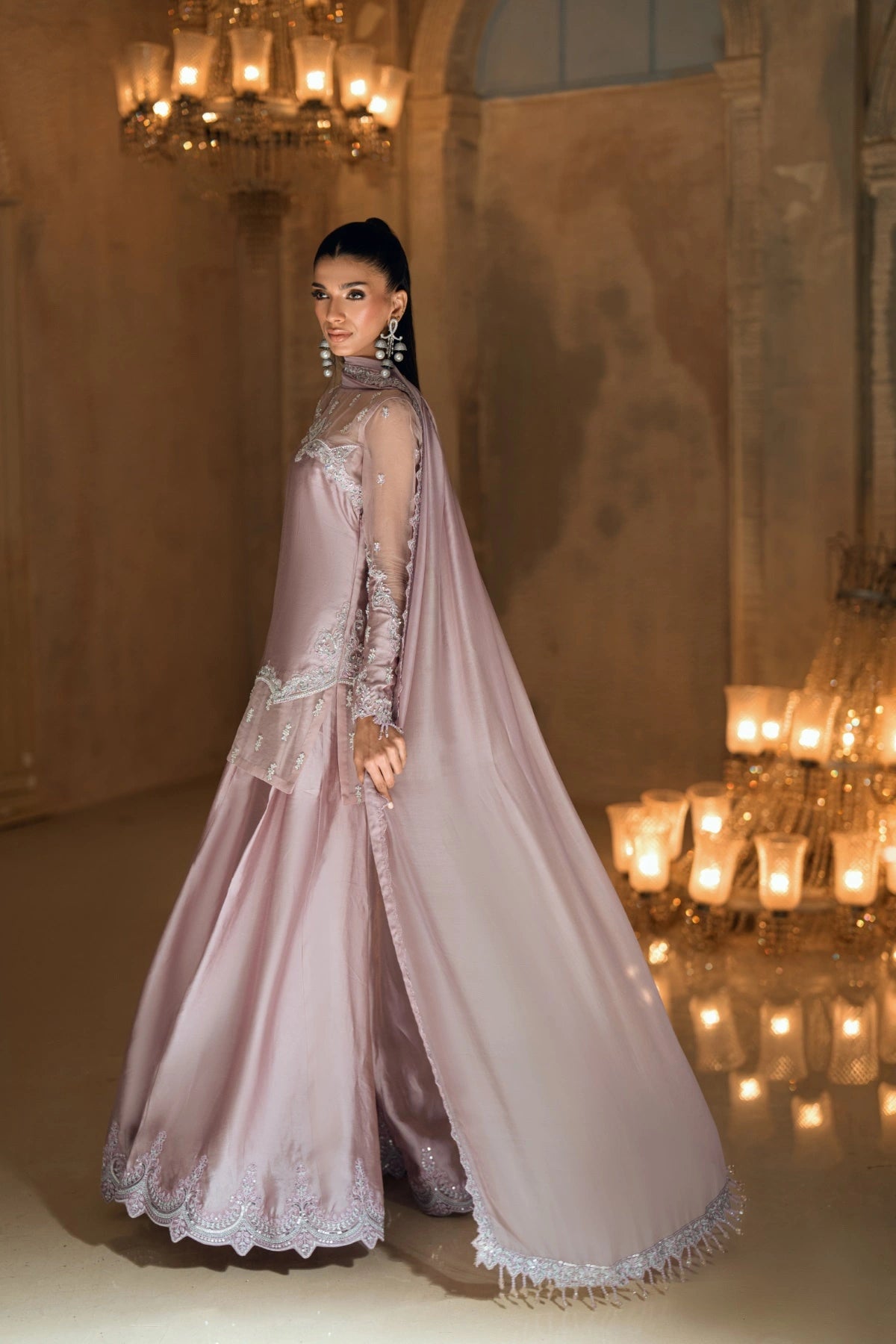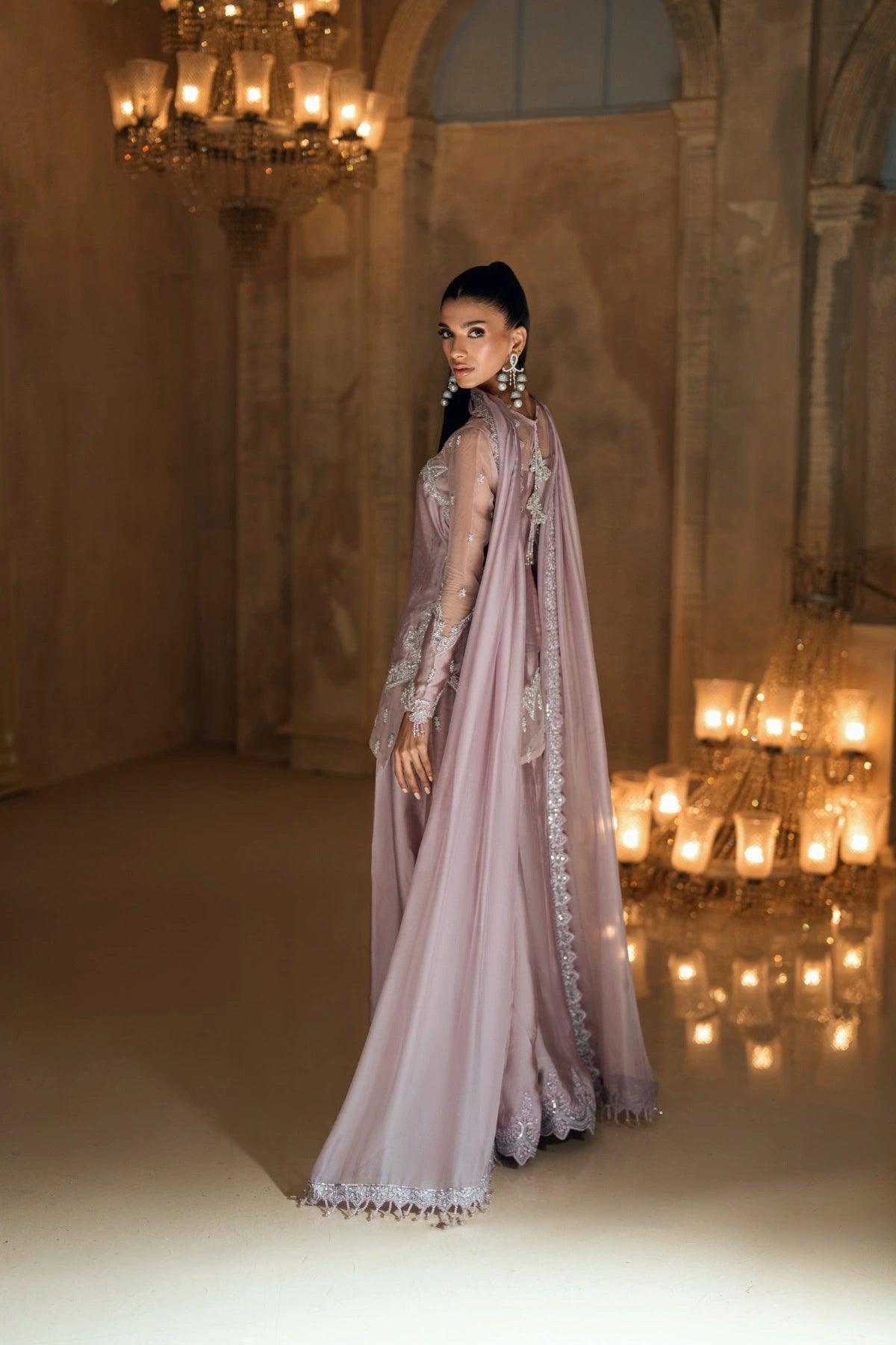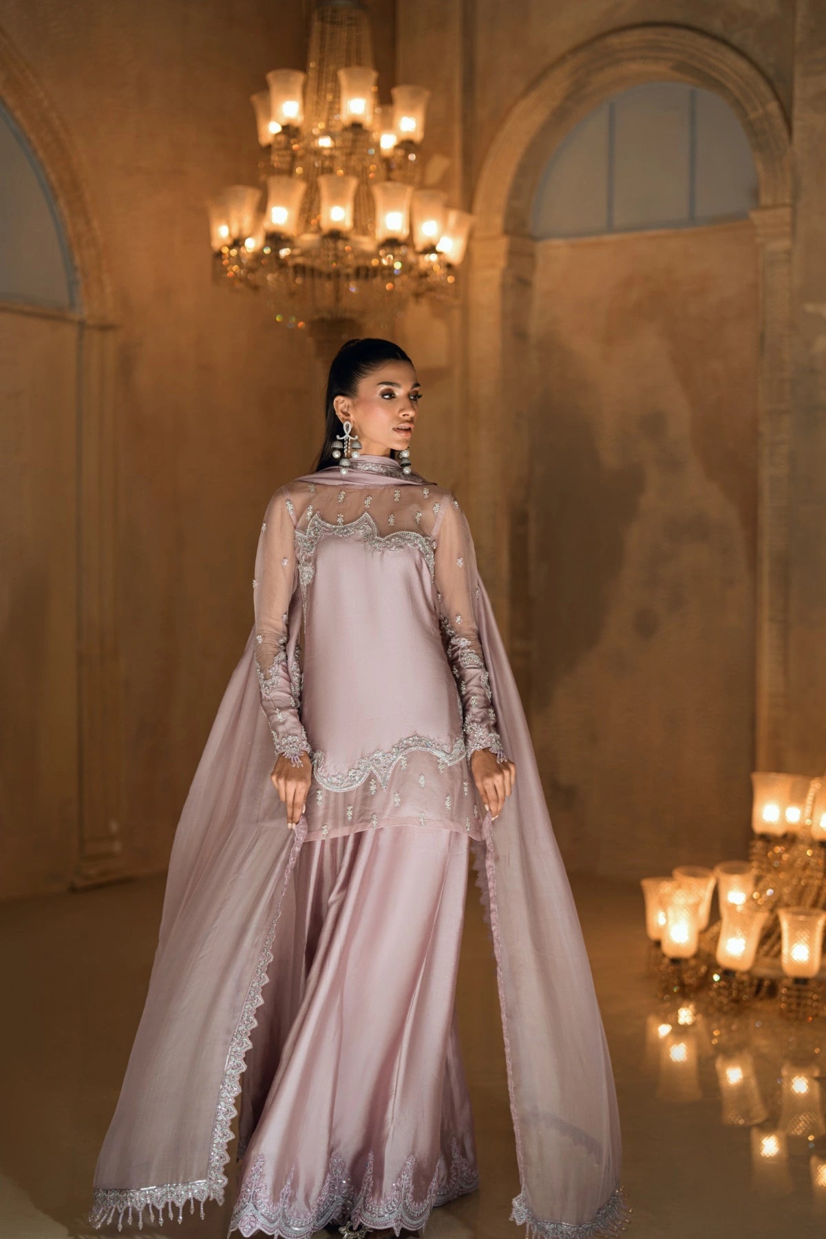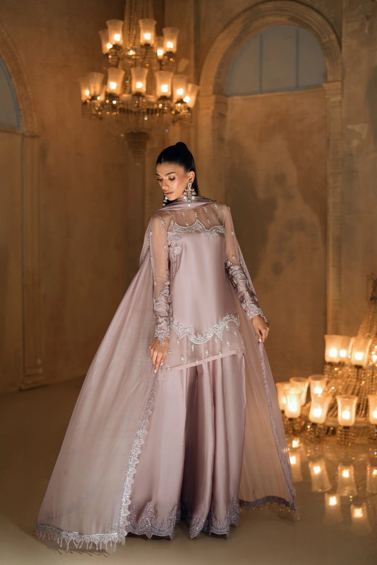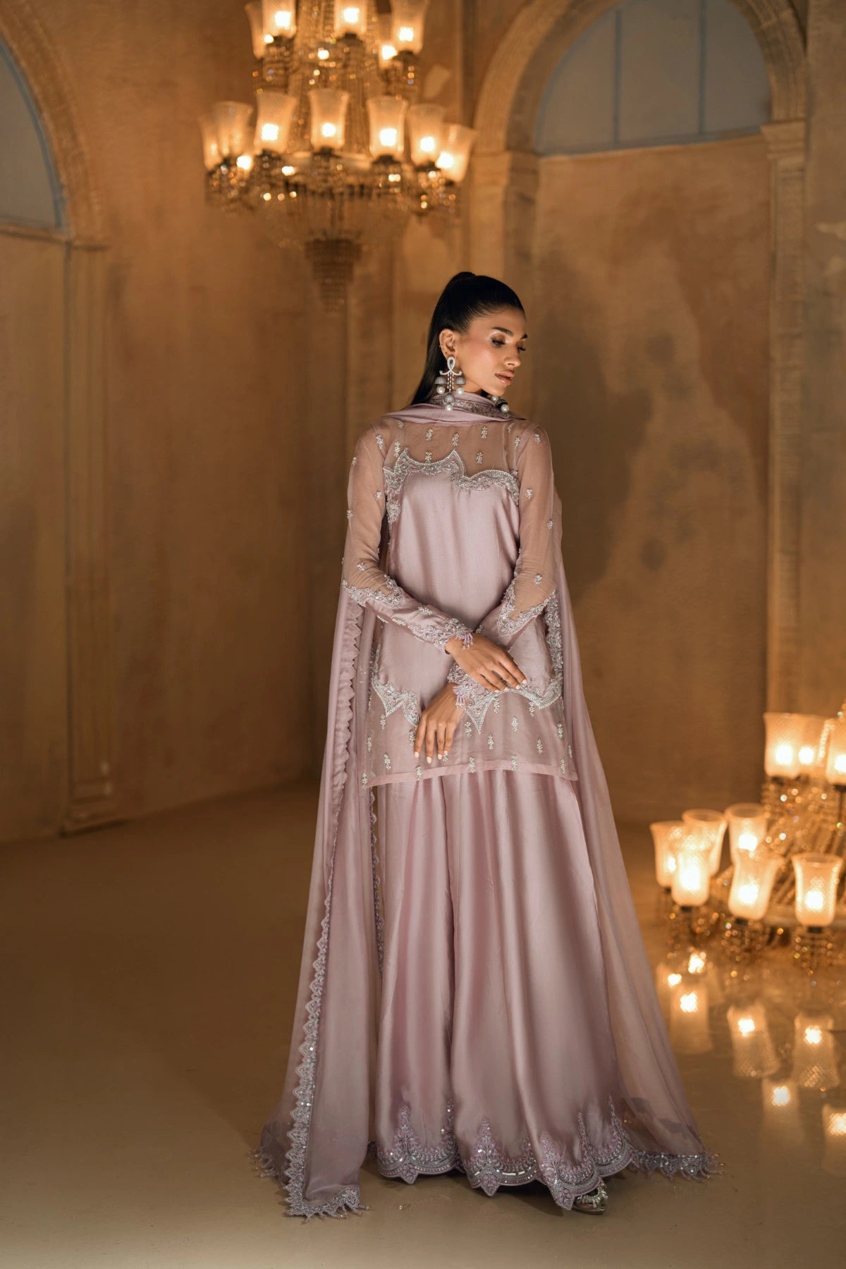 Crafted from premium sheesha silk, this elegant ensemble features a short shirt enriched with intricate hand embroidery. Shimmering cut dana, crystals, and stone work are delicately arranged across the surface, catching the light with every movement. A signature double butterfly hanging at the back adds a poetic flourish — subtle yet distinctive, echoing the dreamlike essence of the Khuab collection.