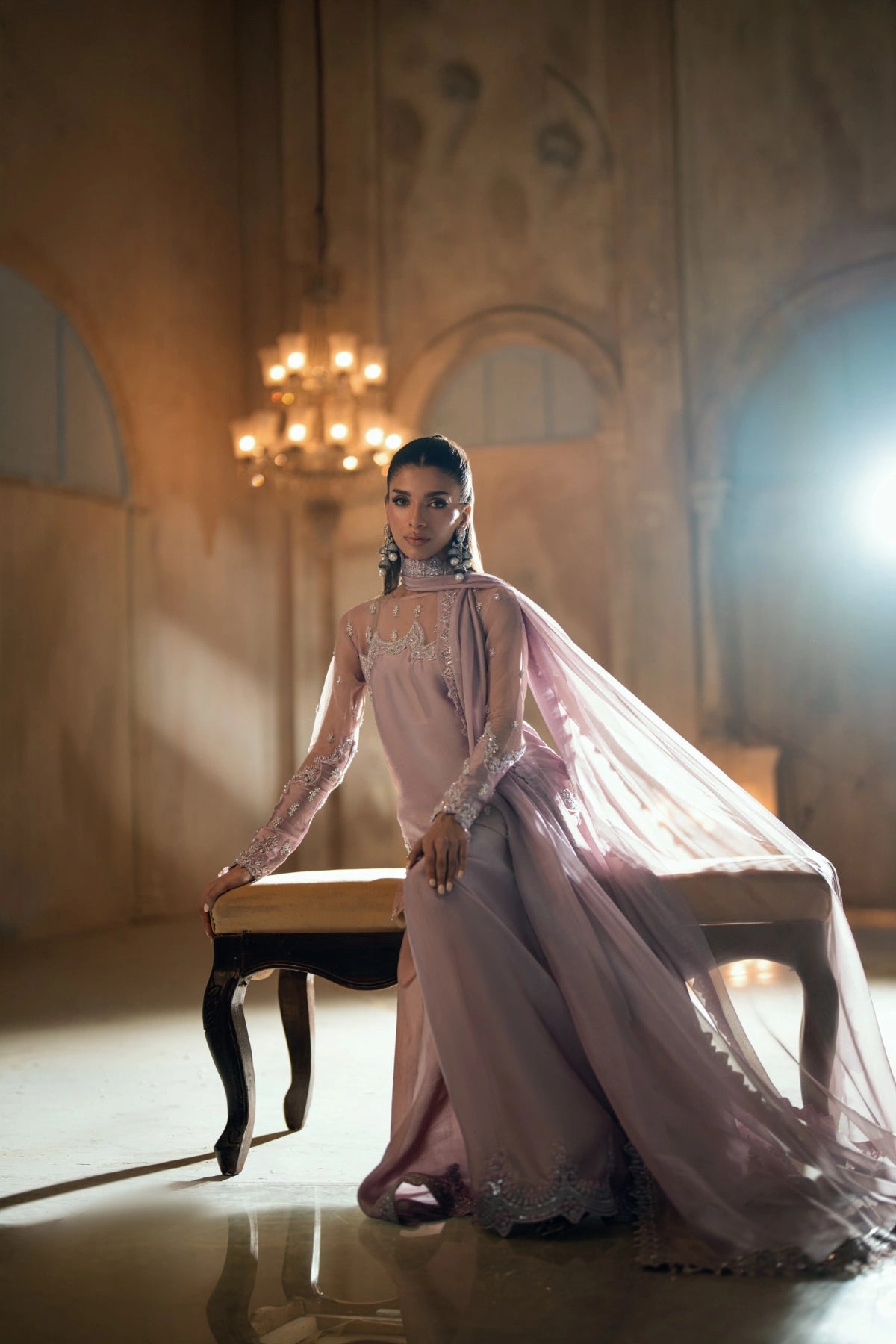 Paired with matching embroidered plazos, the silhouette remains fluid and refined. The look is completed with a pure silk chiffon dupatta, finished with a detailed four-sided border that frames the ensemble with regal elegance, making Mehmal a graceful choice for formal occasions and memorable moments.