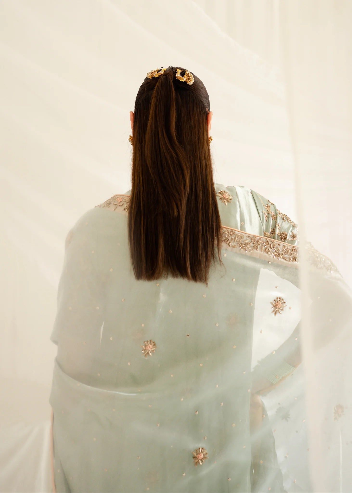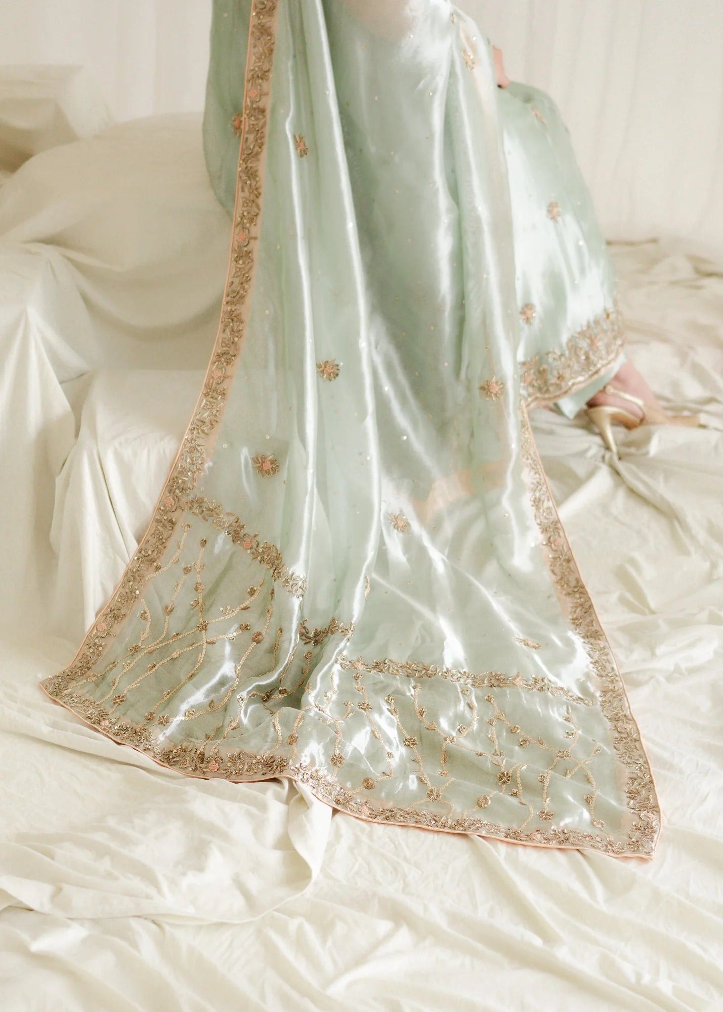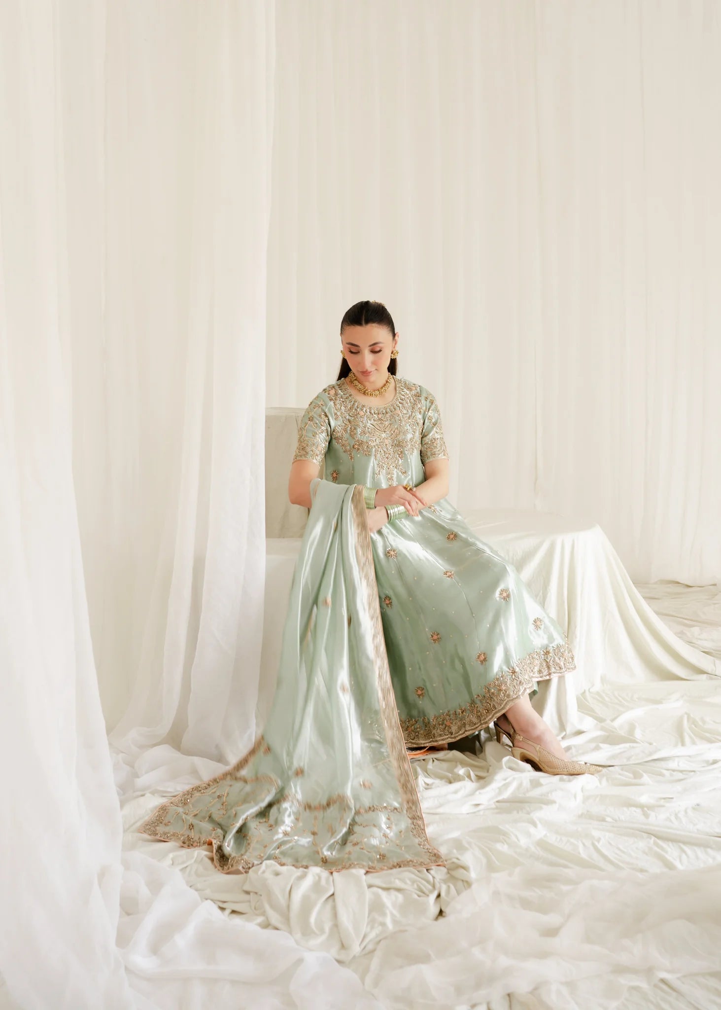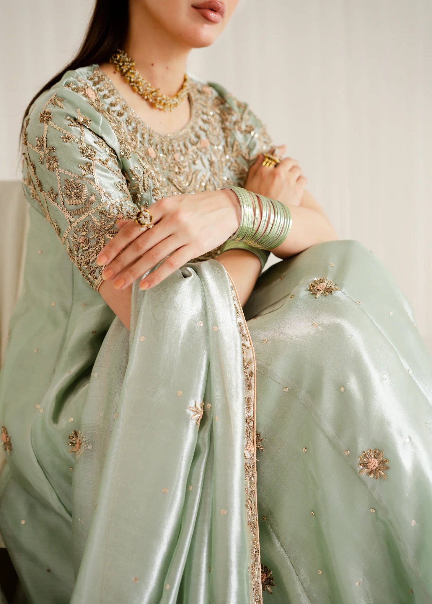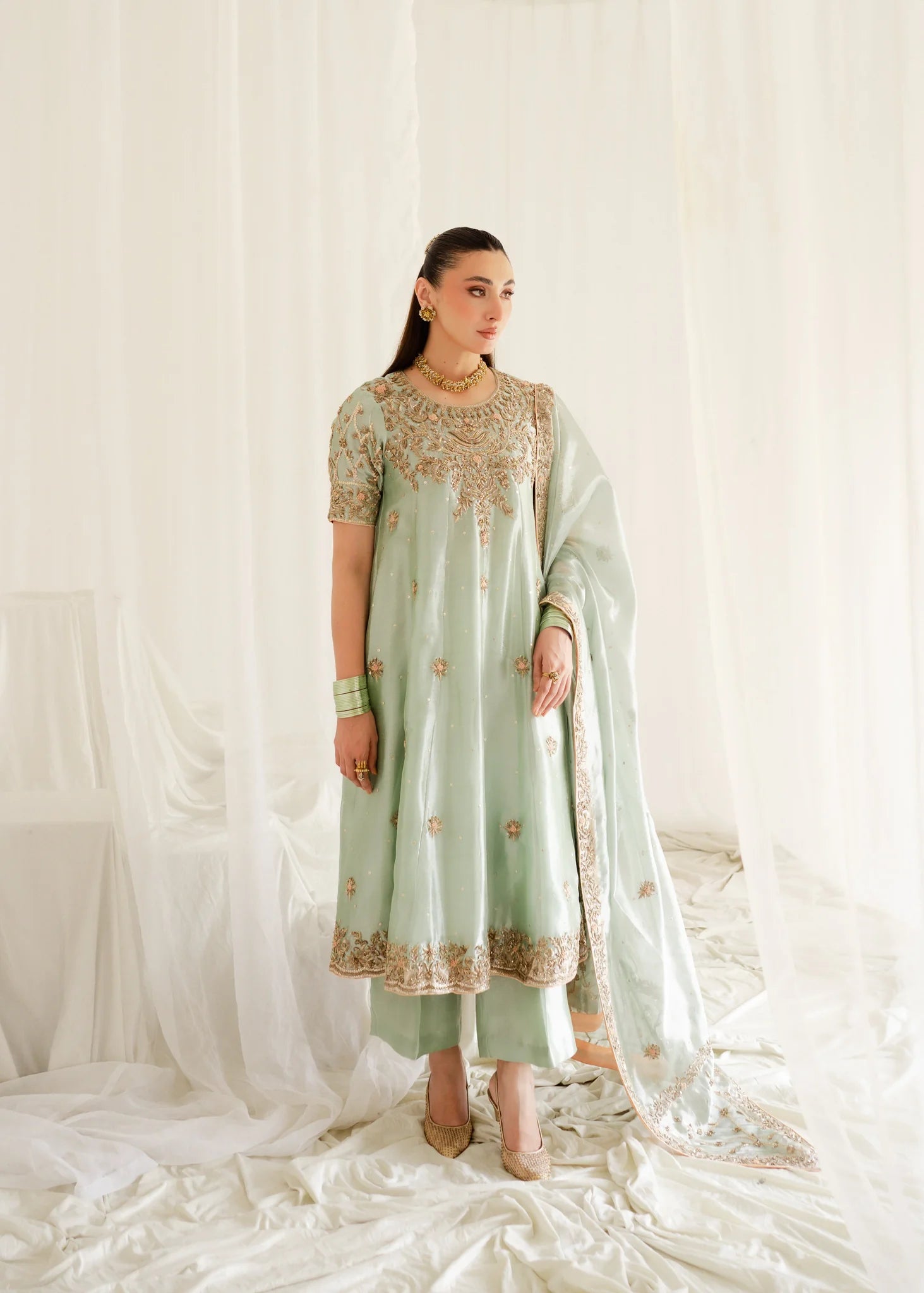An elegant emerald ensemble crafted from pure sheesha silk, adorned with hand-embroidered dull gold zari and dabka detailing on the neckline, sleeves, and hem. Paired with raw silk trousers and a soft, airy organza dupatta for a graceful finish. Aarzu perfectly blends timeless craftsmanship with understated elegance — a minimal yet captivating choice for wedding guests who appreciate simplicity with a touch of luxury.