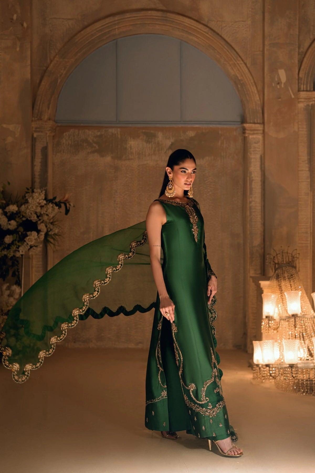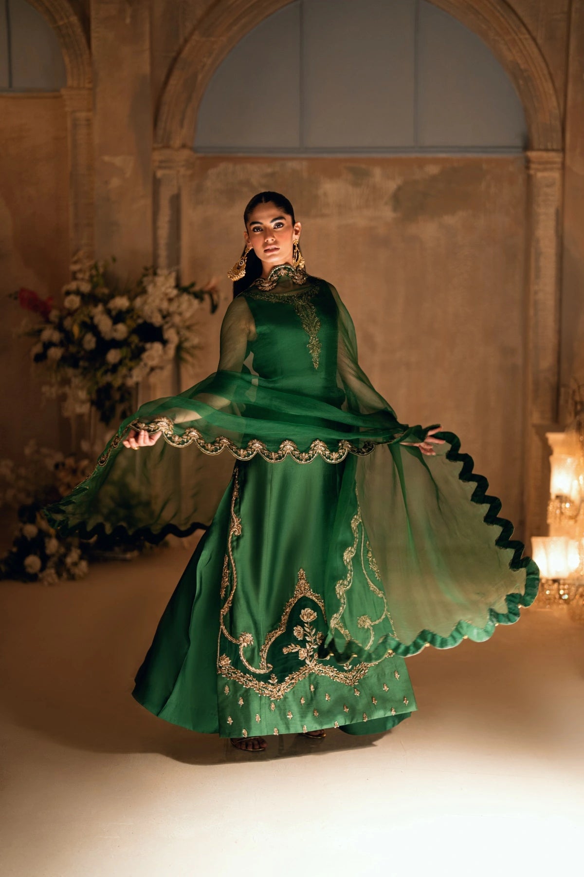 Dupatta: Green organza with scalloped gold borders and ghungroo palus