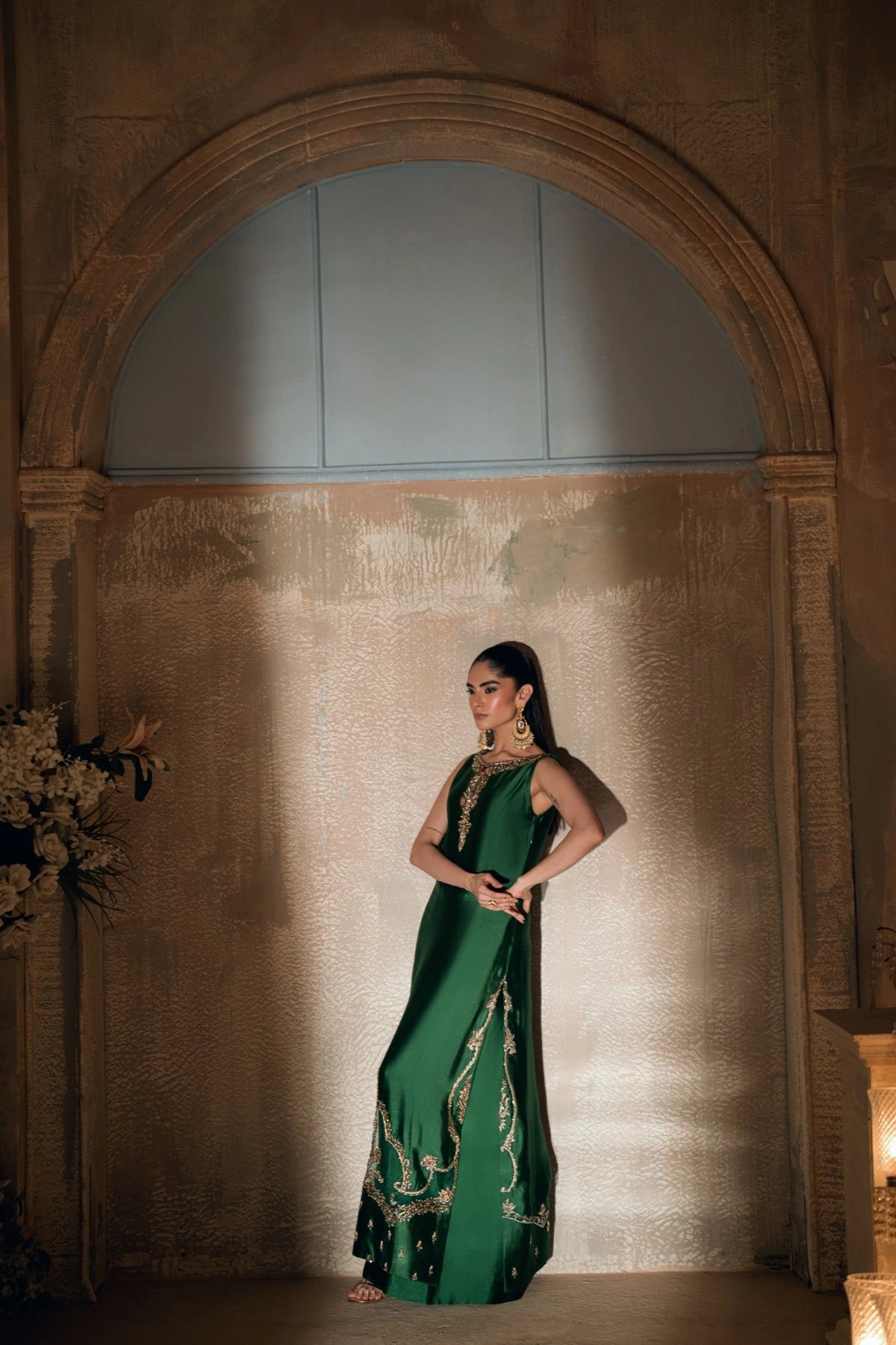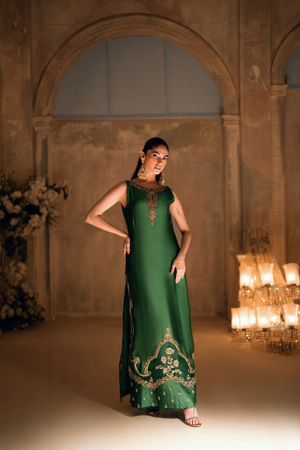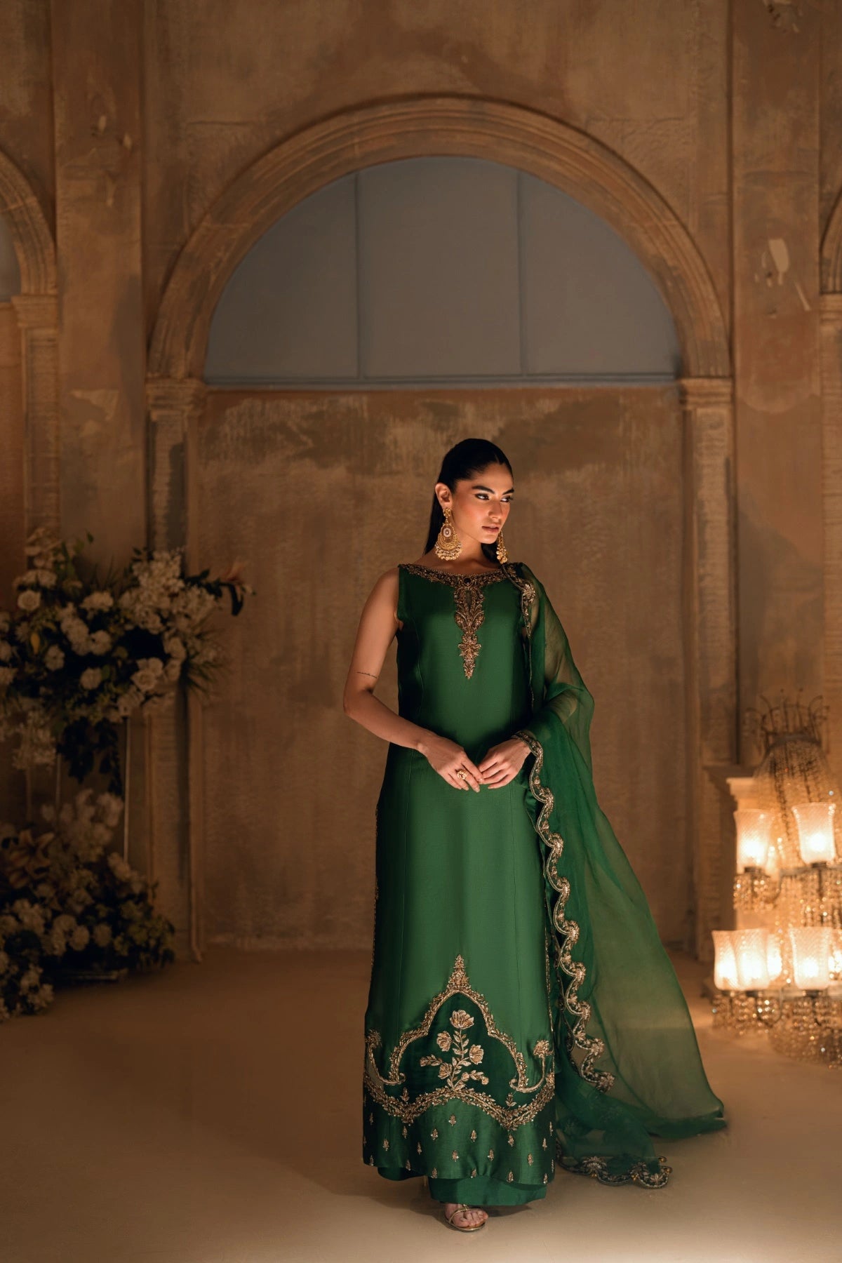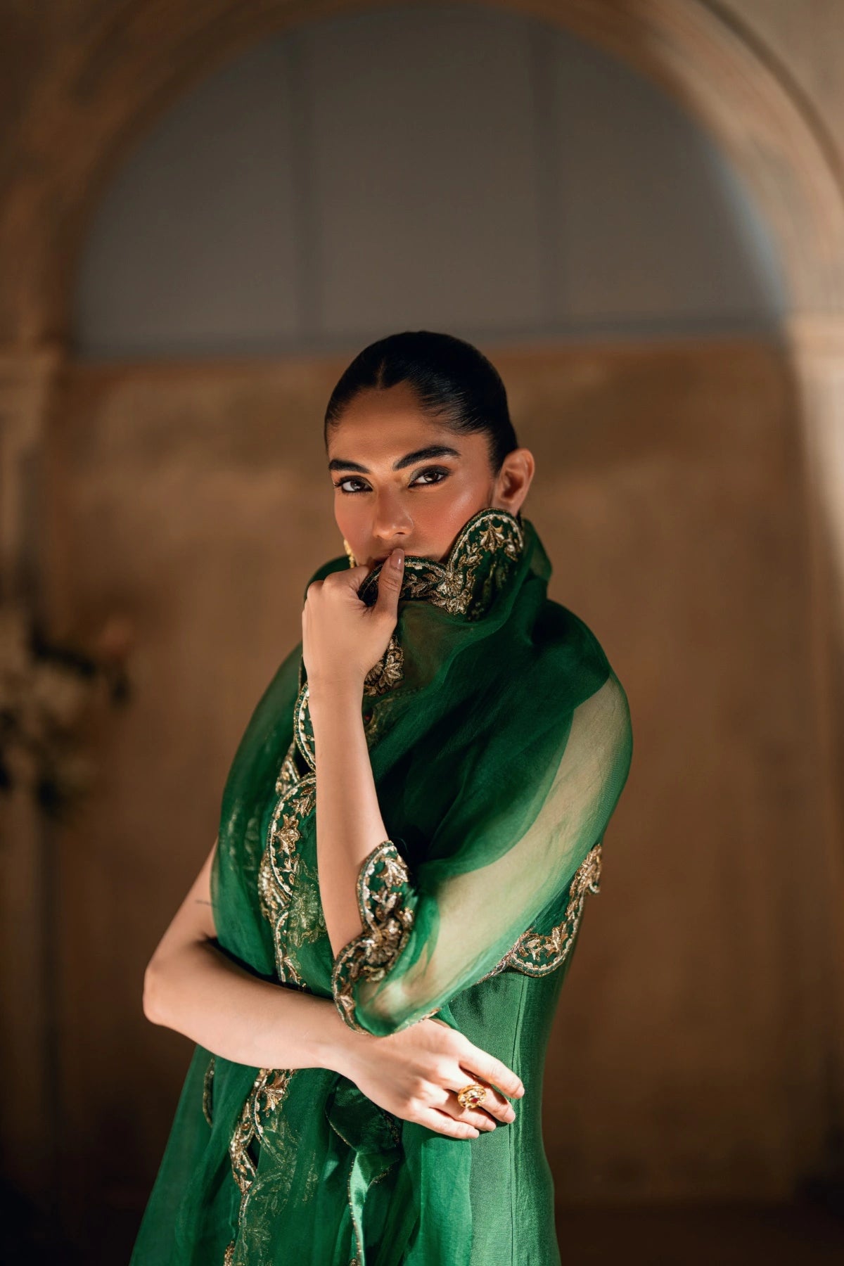 From the depths of the Khuab collection, Wajahat Mansoor presents Mehrab—an ensemble that bridges the gap between heritage architecture and modern drape. Sculpted in a commanding shade of majestic green, this long, paneled shirt is crafted from premium sheesha silk, offering a luster that feels both fluid and substantial. The design centers around a jewel-like neckline, where a singular, striking red stone rests as the heartbeat of the piece, offering a bold contrast to the verdant canvas.