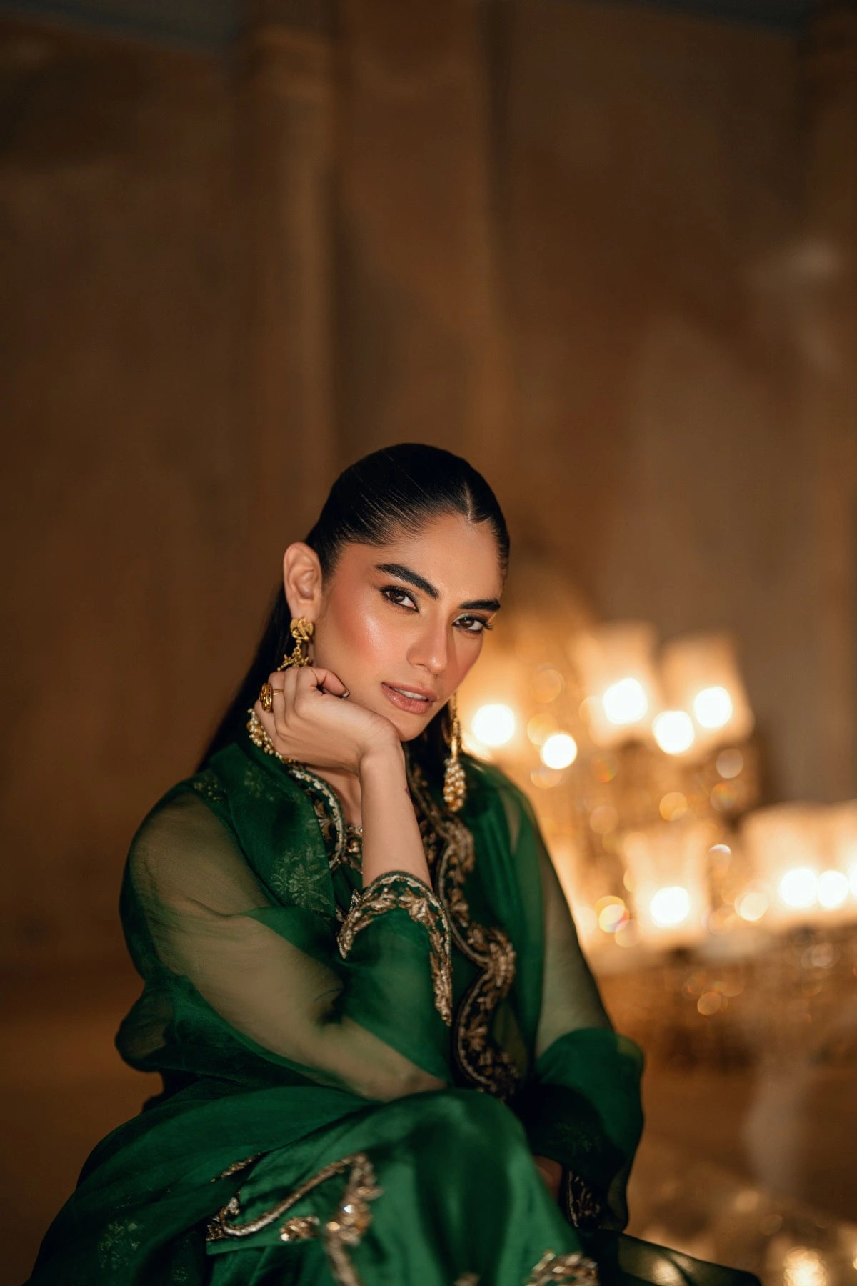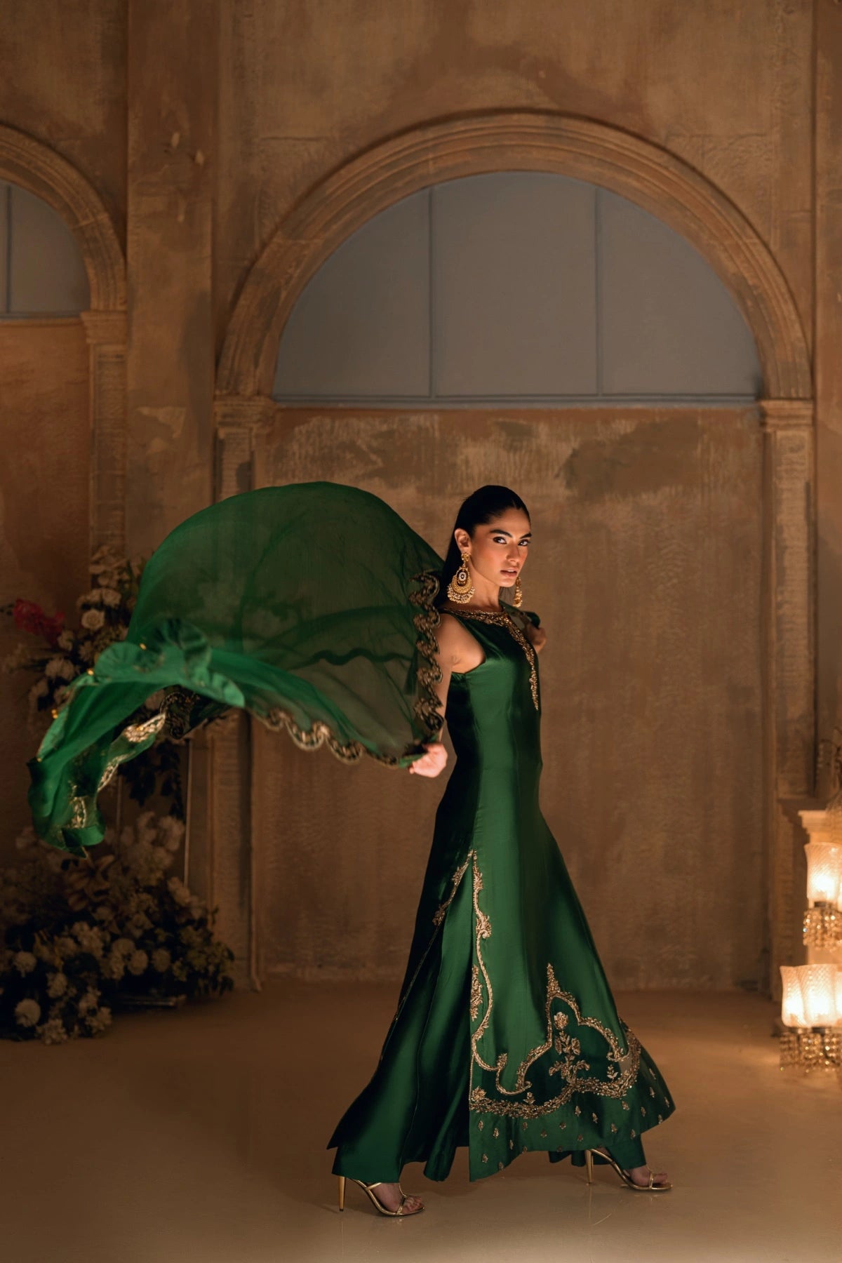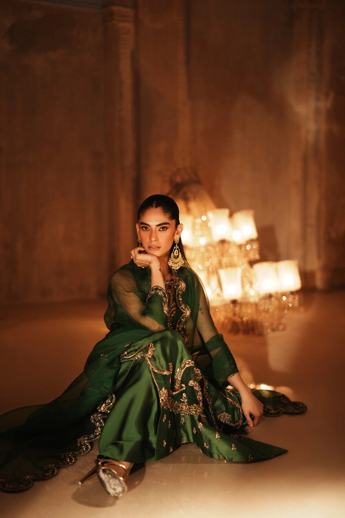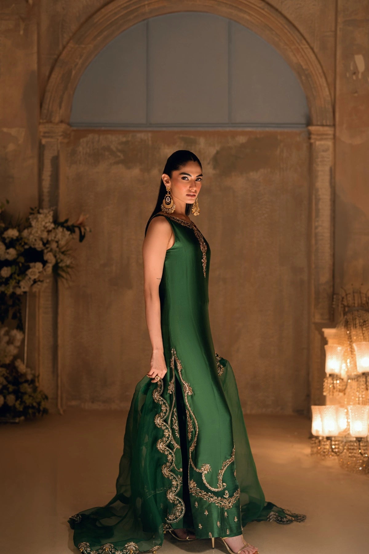 From the depths of the Khuab collection, Wajahat Mansoor presents Mehrab—an ensemble that bridges the gap between heritage architecture and modern drape. Sculpted in a commanding shade of majestic green, this long, paneled shirt is crafted from premium sheesha silk, offering a luster that feels both fluid and substantial. The design centers around a jewel-like neckline, where a singular, striking red stone rests as the heartbeat of the piece, offering a bold contrast to the verdant canvas.