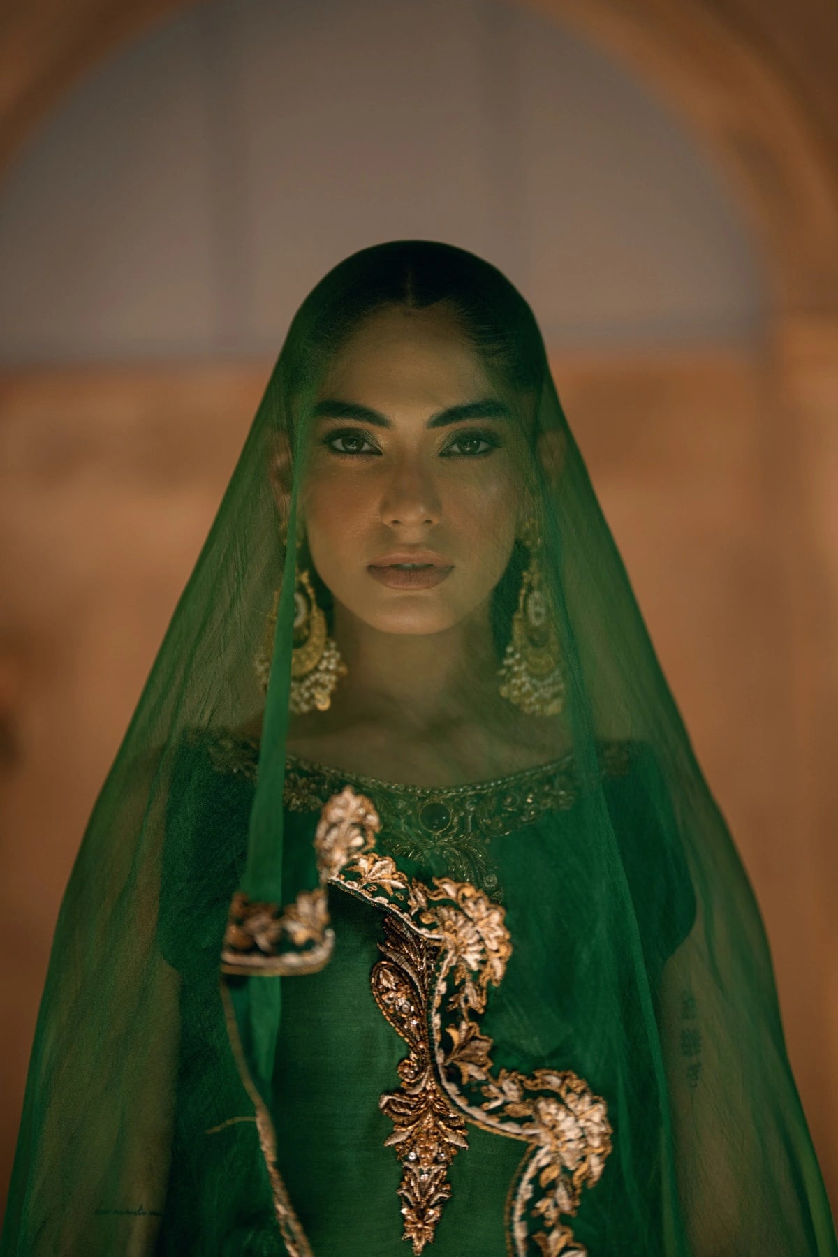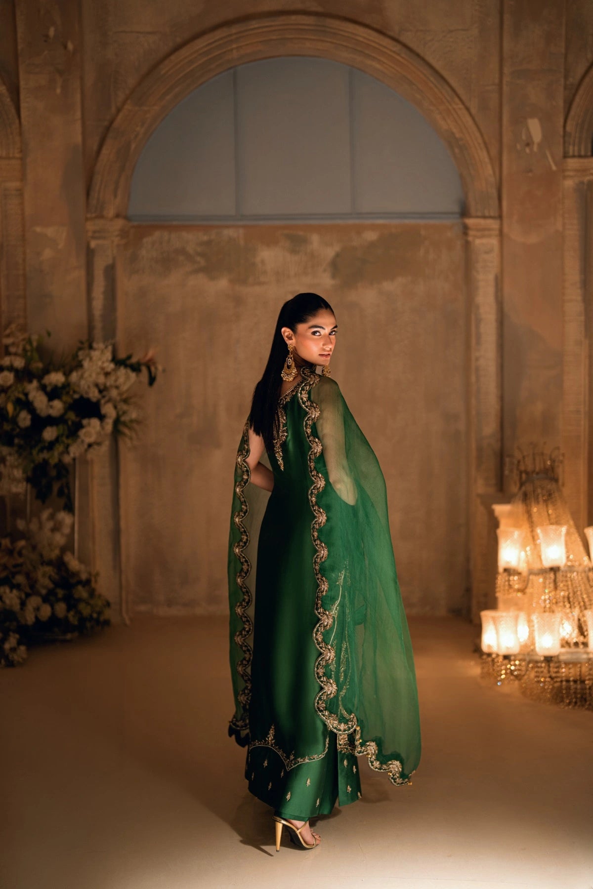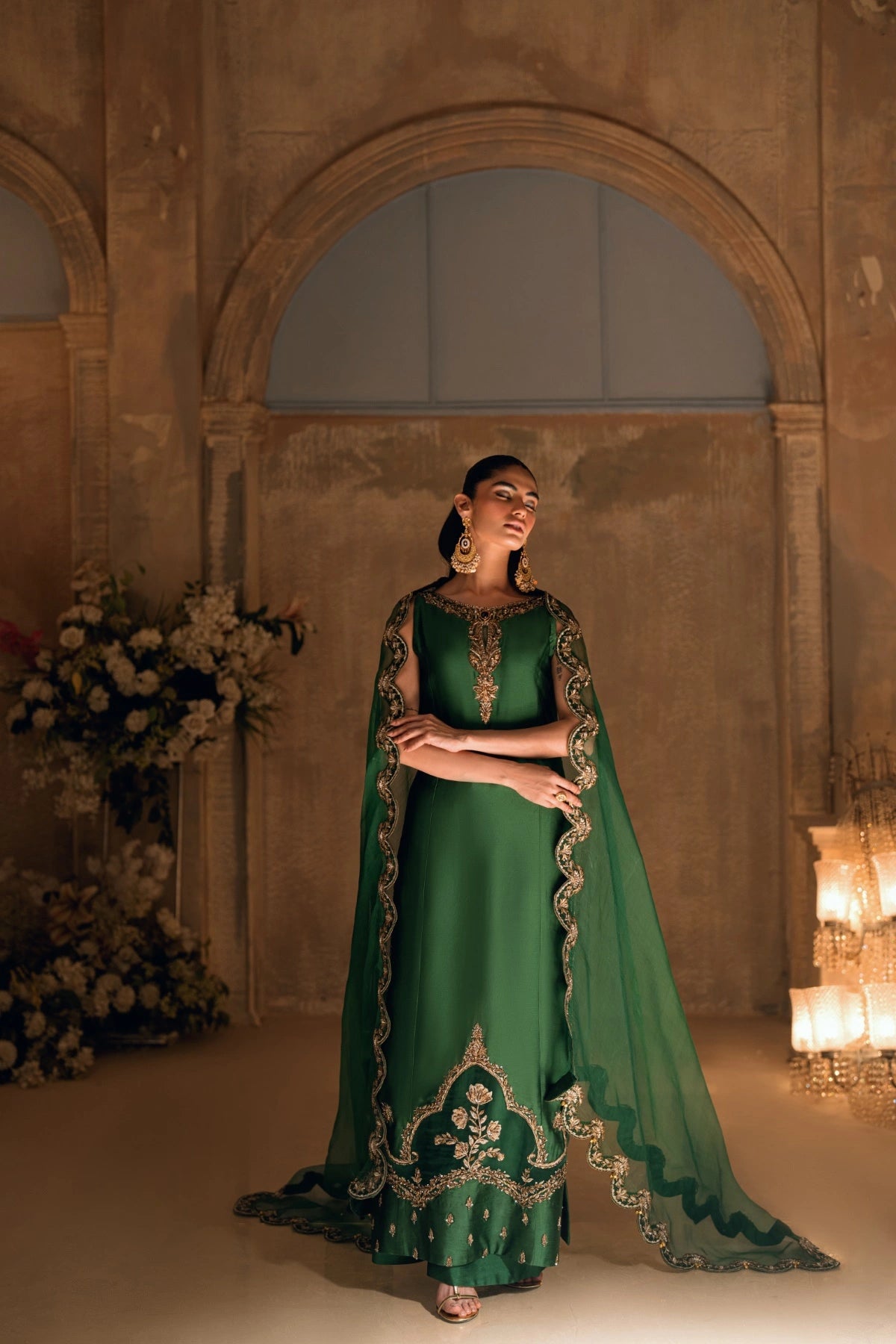 The artistry descends to the hemline, where a sheer organza panel becomes a playground for master craftsmen; it is densely encrusted with zardozi, kora, dabka, and glimmering cut dana. The back of the silhouette whispers a softer story with a keyhole cut finished with handmade ghungroo hangings. Paired with matching straight plazos and a green pure organza dupatta framed by scalloped gold borders, Mehrab is a Wajahat Mansoor signature—timeless, detailed, and undeniably majestic.