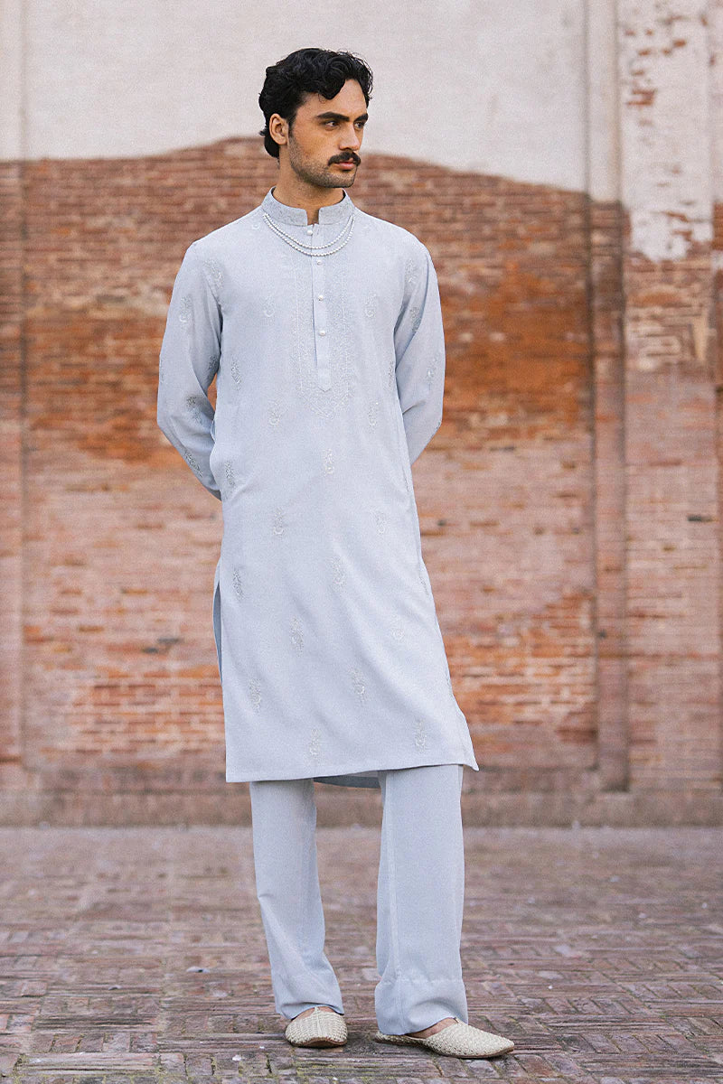 A powder blue embroidered kurta and pajama set, with floral motif patterns detailed with threadwork and sequins embellishments.