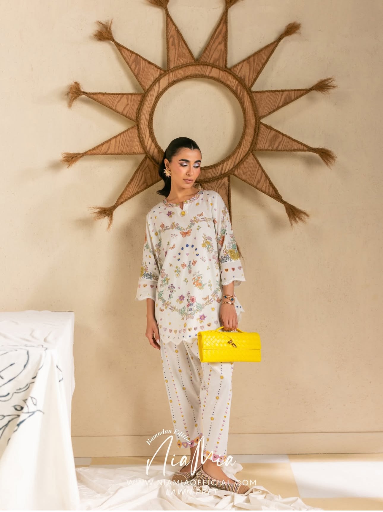 Meringue is crafted on a soft ivory lawn base, featuring a playful all-over heart and nature-inspired print. The shirt is detailed with delicate neckline detailing and scalloped hems finished with heart cutwork on the sleeves and hem. A coordinated printed lawn shalwar with heart cutwork borders completes the look