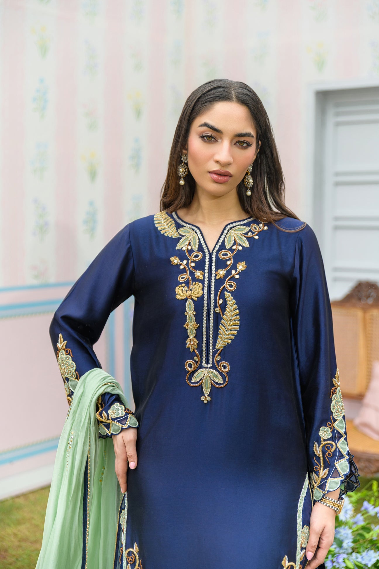 Elevate your summer wardrobe with Midnight Blue, a graceful creation from our Zarayna Festive Formal Collection. This ensemble features a soft navy blue long shirt, beautifully embellished with intricate dabka, kora, and resham work in delicate shades of ice blue. Paired with straight pants for a classic silhouette, the look is completed with an icy blue pure sheesha organza dupatta adorned with ethereal kamdani detailing, adding a light, graceful charm — perfect for the season.