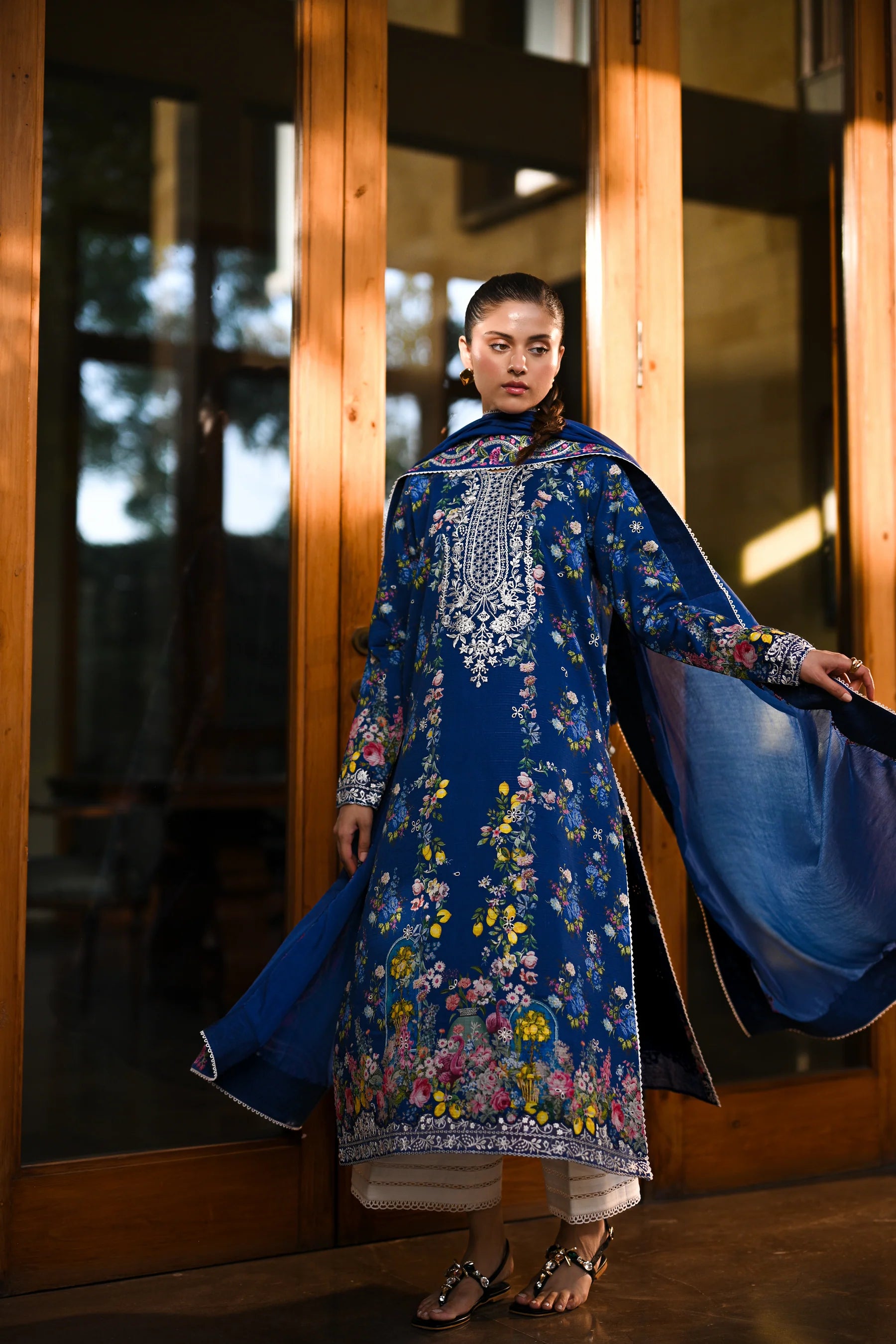 This stunning sapphire blue shirt features overall embroidery, with a beautifully detailed neckline and an organza hem adorned with a white applique patch. Elegant tassels accent the back neckline, adding a playful charm. The izaar trouser is styled with lace detailing for an extra touch of grace. Completing the ensemble is a four-sided heavily embroidered slub silk dupatta in soft green, pink, and white tones. Every detail speaks of refined craftsmanship and timeless beauty. Perfect for creating an effortlessly elegant look.