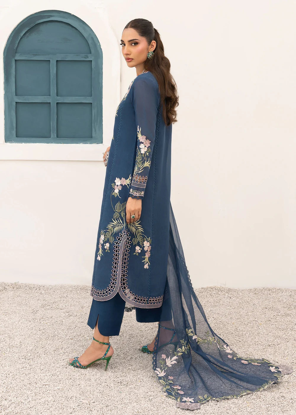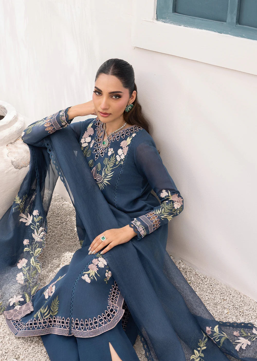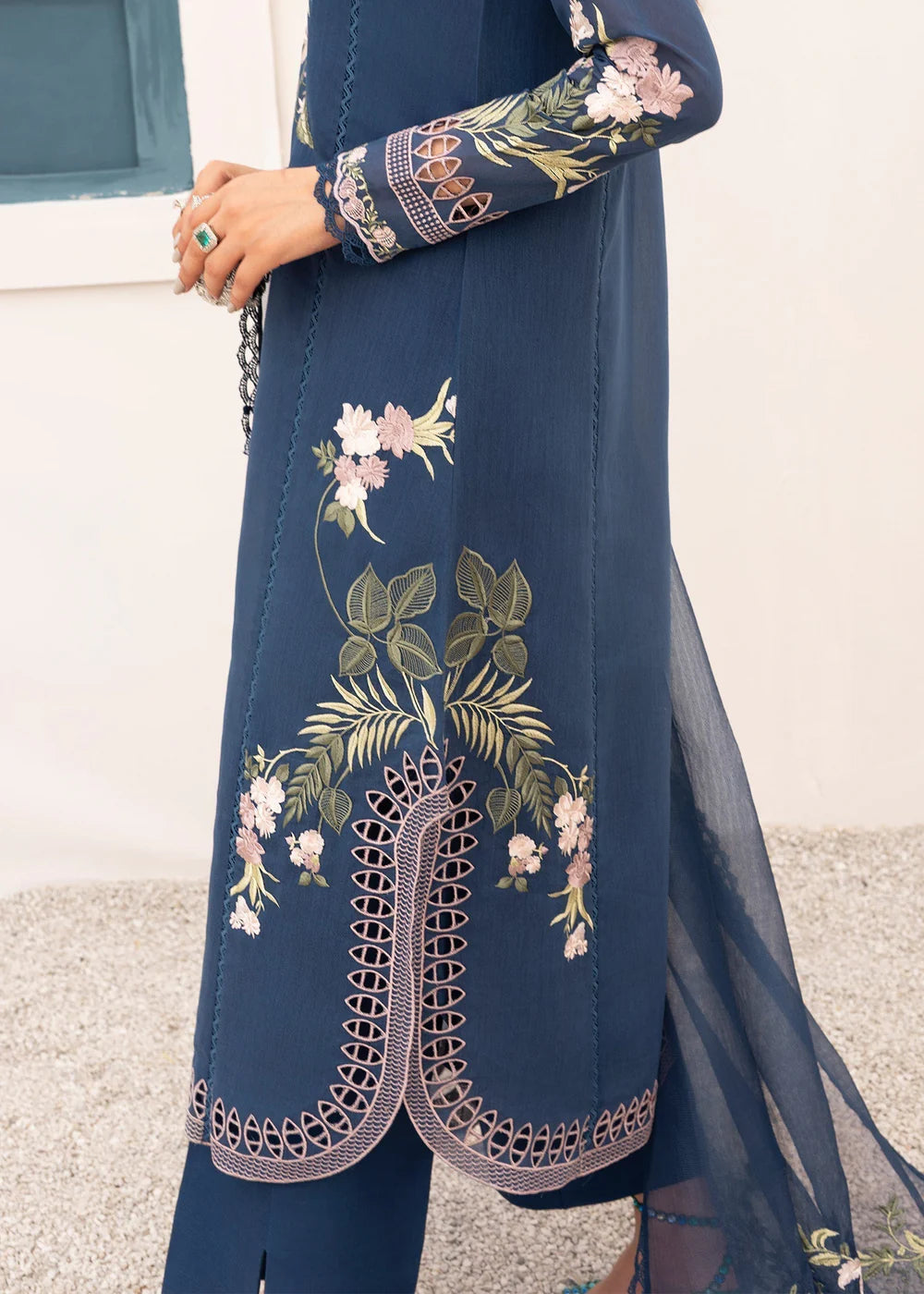 Additional Description: A Whisper of Midnight. A homage to midnight summer blooms. Set against an ink blue canvas on Khaadi cotton delicate florals in fine ghara embroidery and cutwork accents. Paired a cotton net dupatta edged in floral cut out vines, this ensemble speaks softly, yet powerfully. Crafted for the woman who leads with quiet grace and effortless beauty.