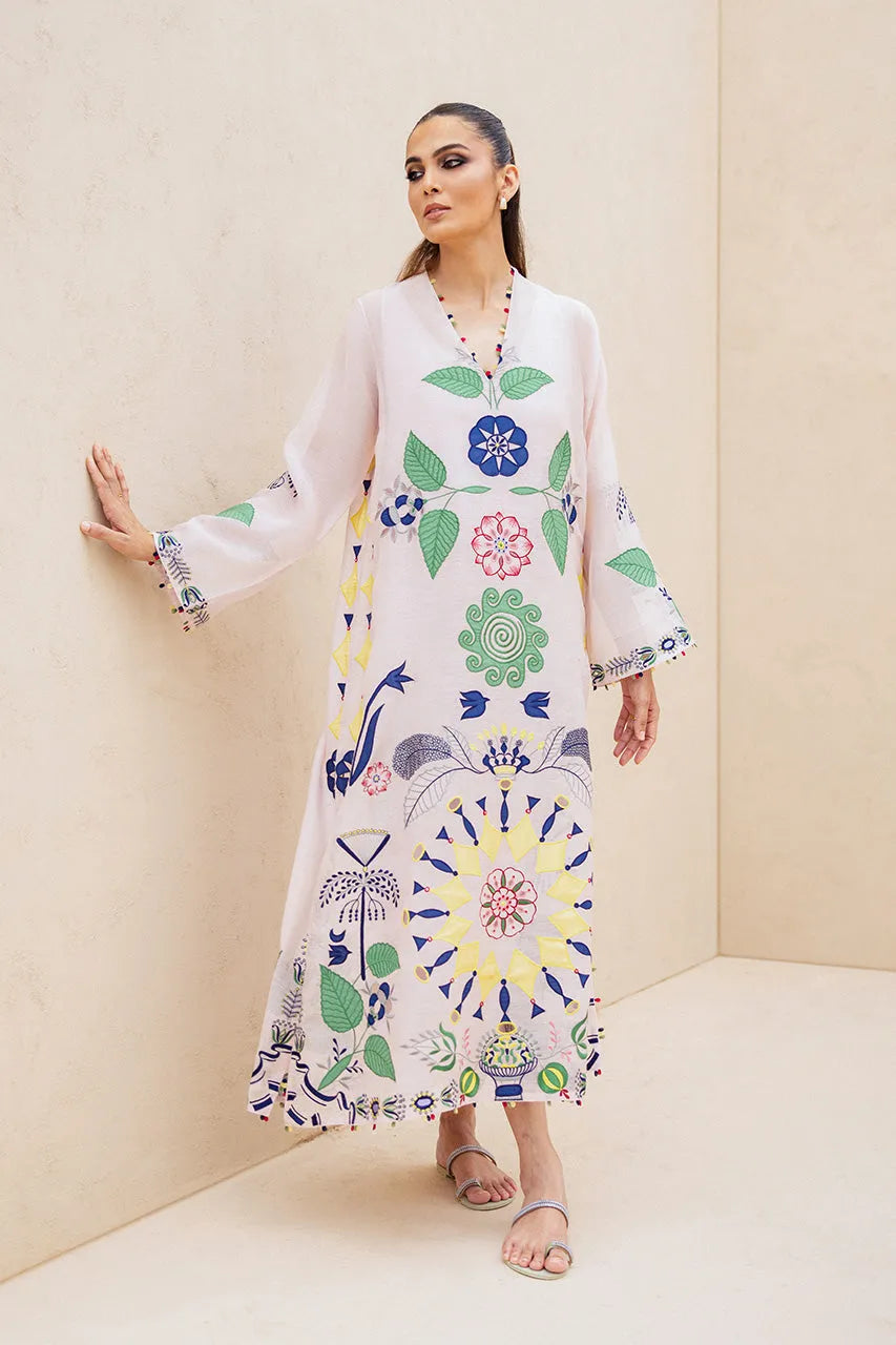 An ode to eclectic luxury, this khaddi corduroy kaftan in a soft lilac hue is cut in a flowing silhouette that embodies effortless ease. Vivid artisanal embroidery unfolds across the surface, with bold florals in sage, navy, and lemon tones intertwined with geometric emblems, creating a tapestry of modern folk romance. Embellished detailing accents the neckline and sleeves, while playful 3D elements trace the hem for a distinctive finish.