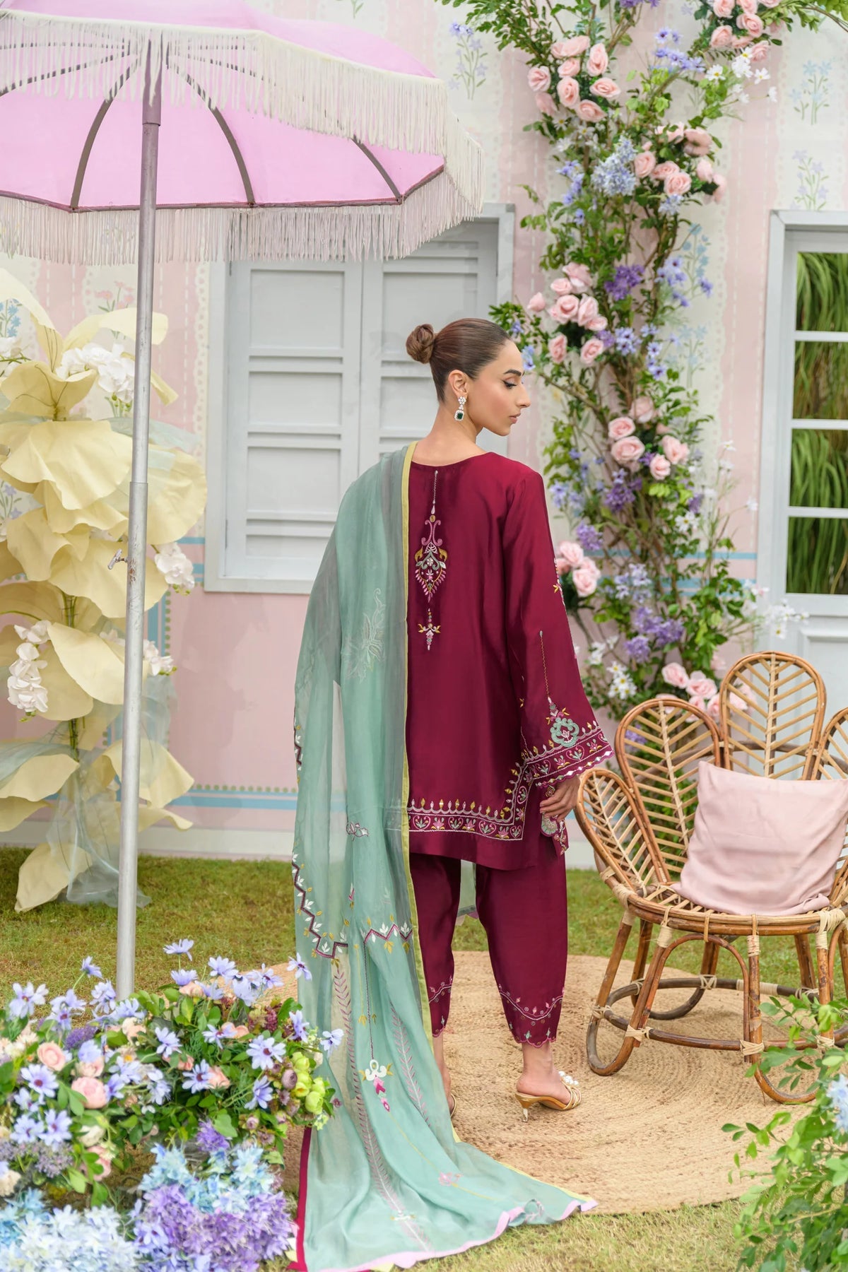 From Our Zarayna Festive Collection is a striking cherry red ensemble paired with a contrasting mint blue dupatta, crafted in pure sheesha silk for the short shirt and skinny shalwar, and pure sheesha organza for the dupatta.The outfit is richly adorned with intricate applique, mirror work, and machine embroidery, blending traditional charm with a modern edge. The dupatta features delicate all-over embroidery, adding to its festive appeal. Includes an unattached inner for added comfort and coverage.
