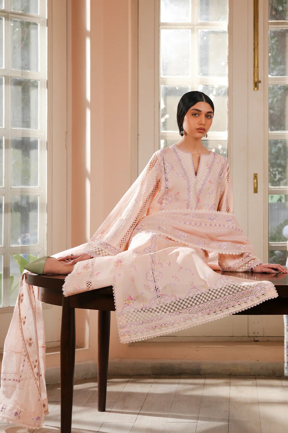Soft and radiant in a tropical peach printed base, this ensemble blends botanical-inspired elements with intricate craftsmanship. The shirt is delicately embroidered with botanical inspired elements on fine chicken kari, tracing floral motifs that add texture and airy elegance to the silhouette. Subtle pastel accents run through the print, giving the piece a fresh, garden-like charm. A cotton net embroidered dupatta drapes lightly over the look, sheer and detailed, enhancing the softness of the palette. The trousers echo the gentle tone, tailored wide with embroidered finishing and lace accents at the hem, completing the outfit with a refined, cohesive grace.