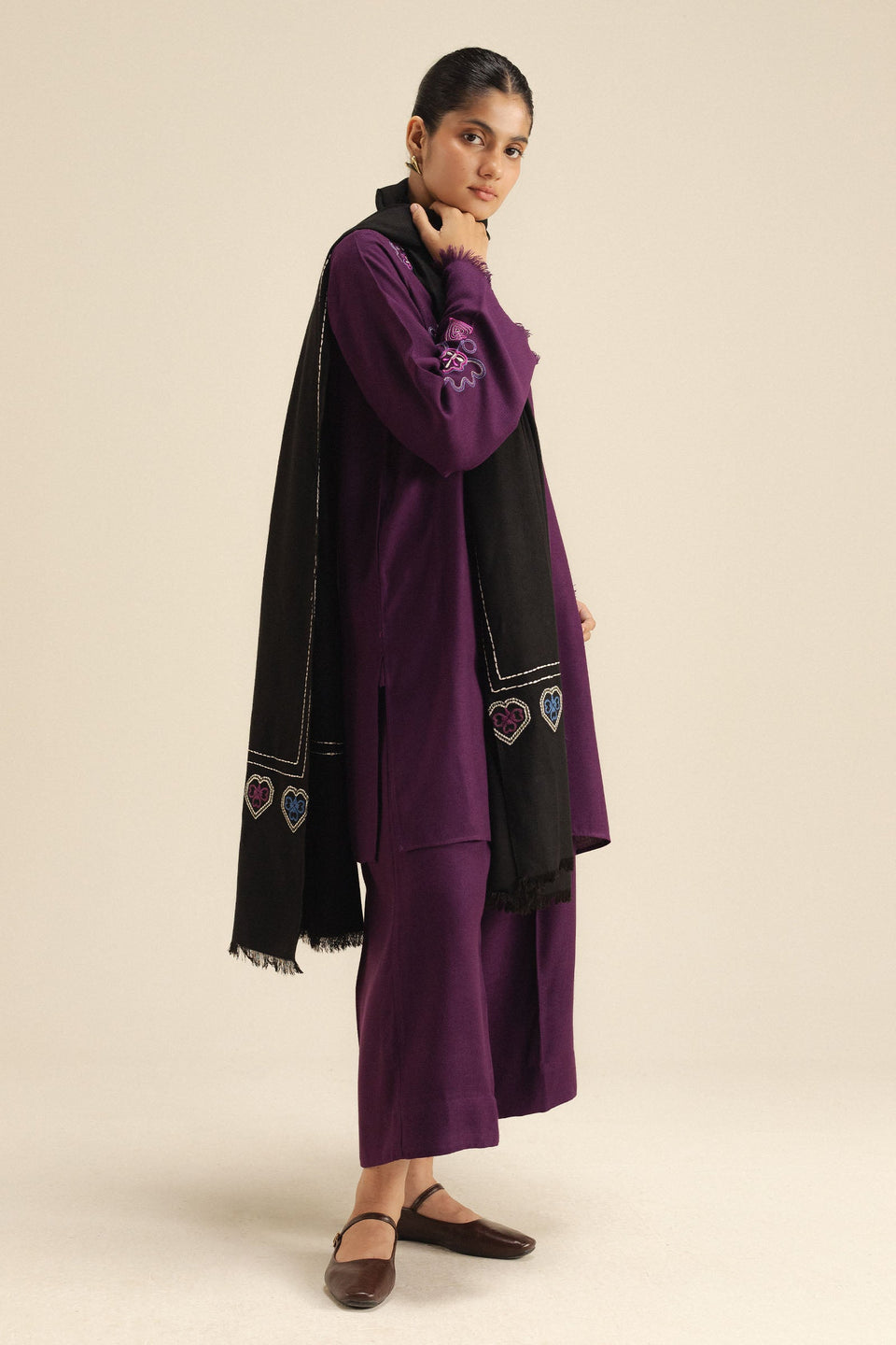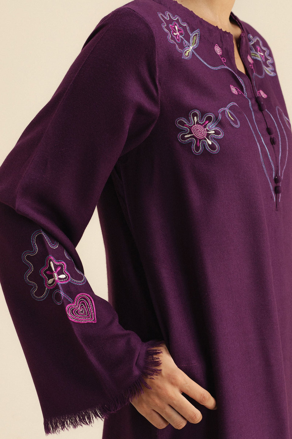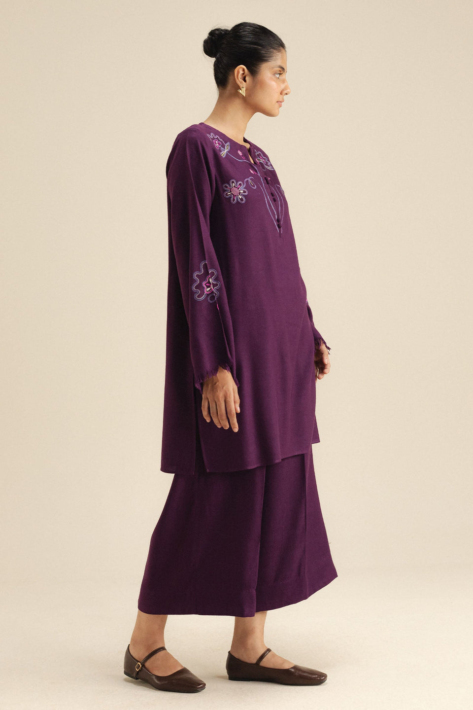 A plum wool peach outfit highlighted with playful embroidery in accent hues on the neckline and sleeves, paired with culottes for a chic finish.