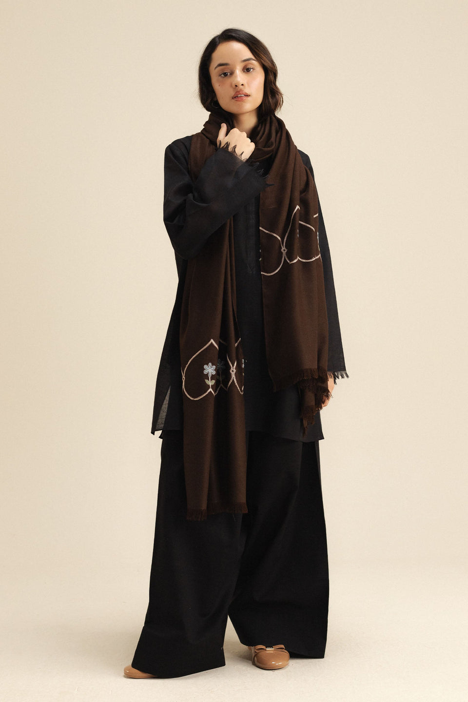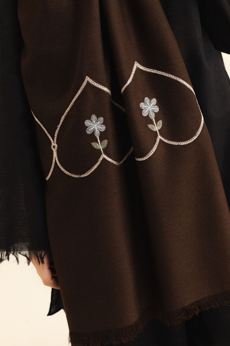 A brown wool peach shawl featuring heart-shaped embroidery on the pallu, a versatile piece to pair with any outfit.