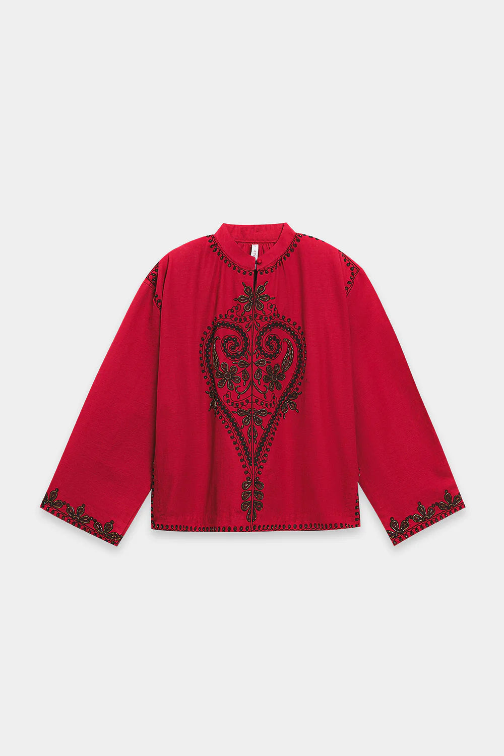 Make a vibrant statement in this rich crimson embroidered shirt, featuring a striking heart-shaped artisanal motif as its centerpiece. The intricate black threadwork flows along the neckline, shoulders, and cuffs, offering a bold contrast against the fiery fabric. Its relaxed silhouette and band collar ensure a perfect blend of tradition and modern flair.