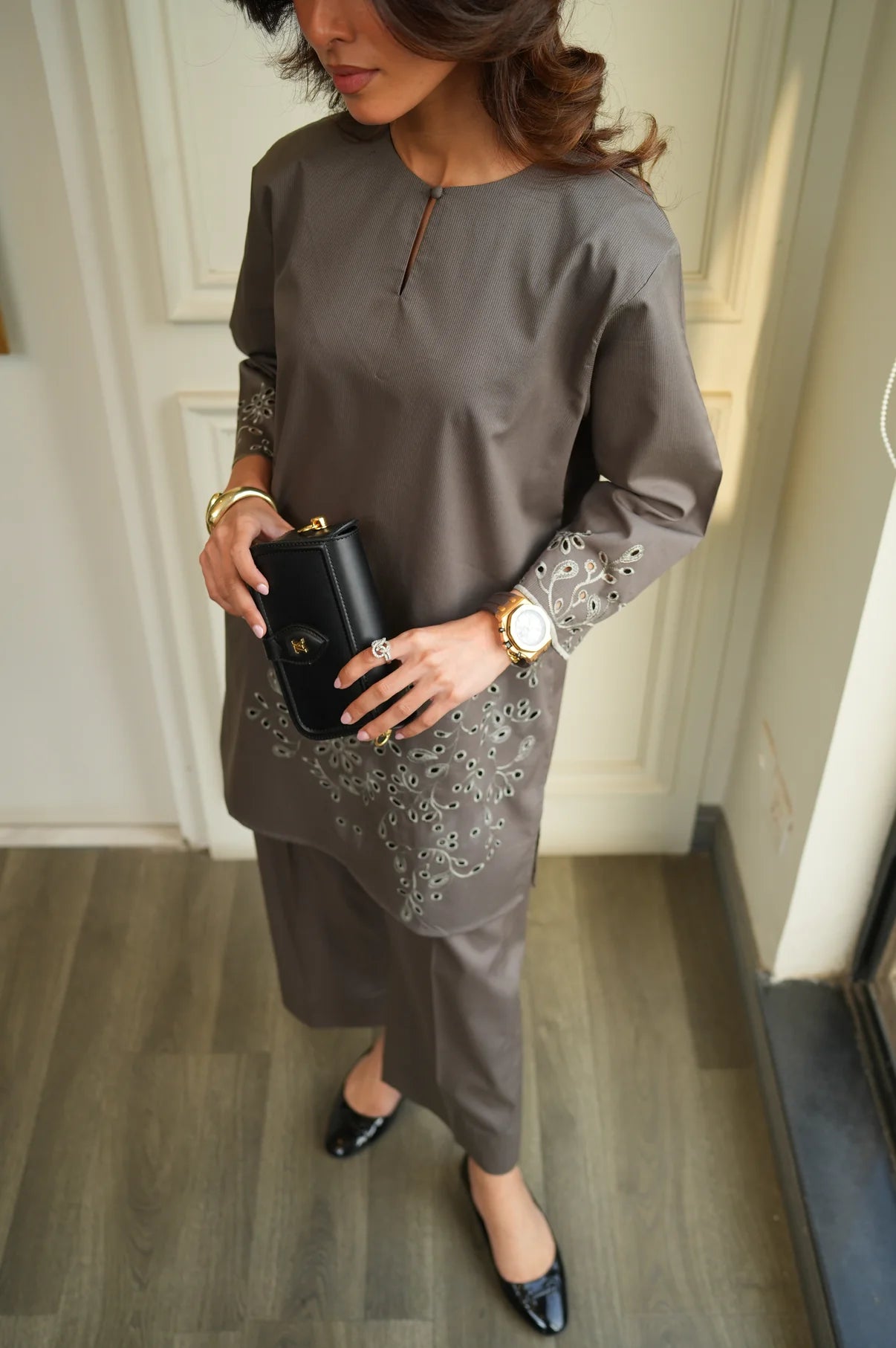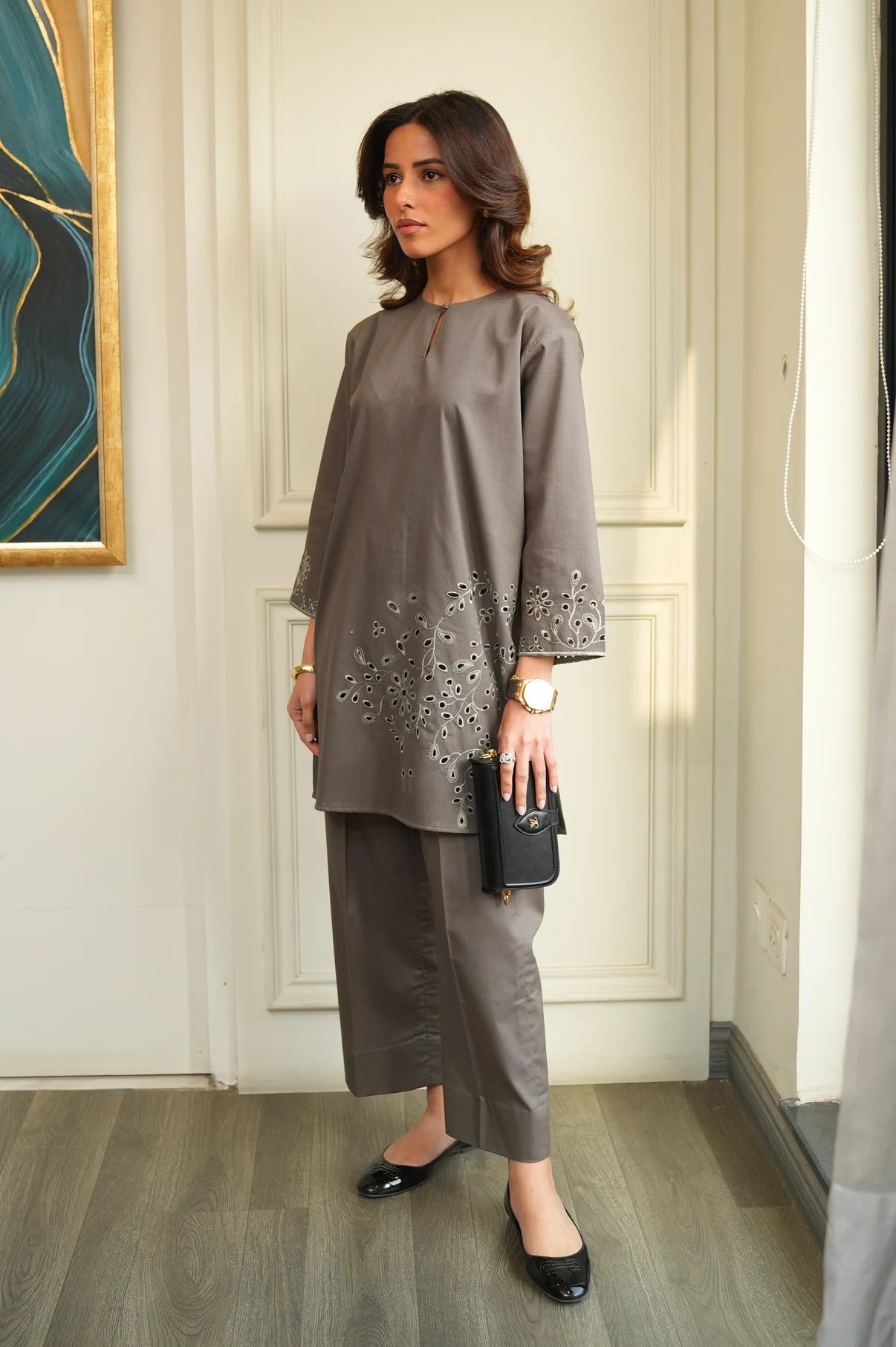The Muted Grey Set is a refined 2-piece outfit made in soft ribbed fabric, the shirt features a clean silhouette accented with delicate cutwork detailing along the hem and sleeves, adding subtle texture and visual interest without overwhelming the look. Paired with matching straight-cut trousers, this set offers a balanced & effortless feel.