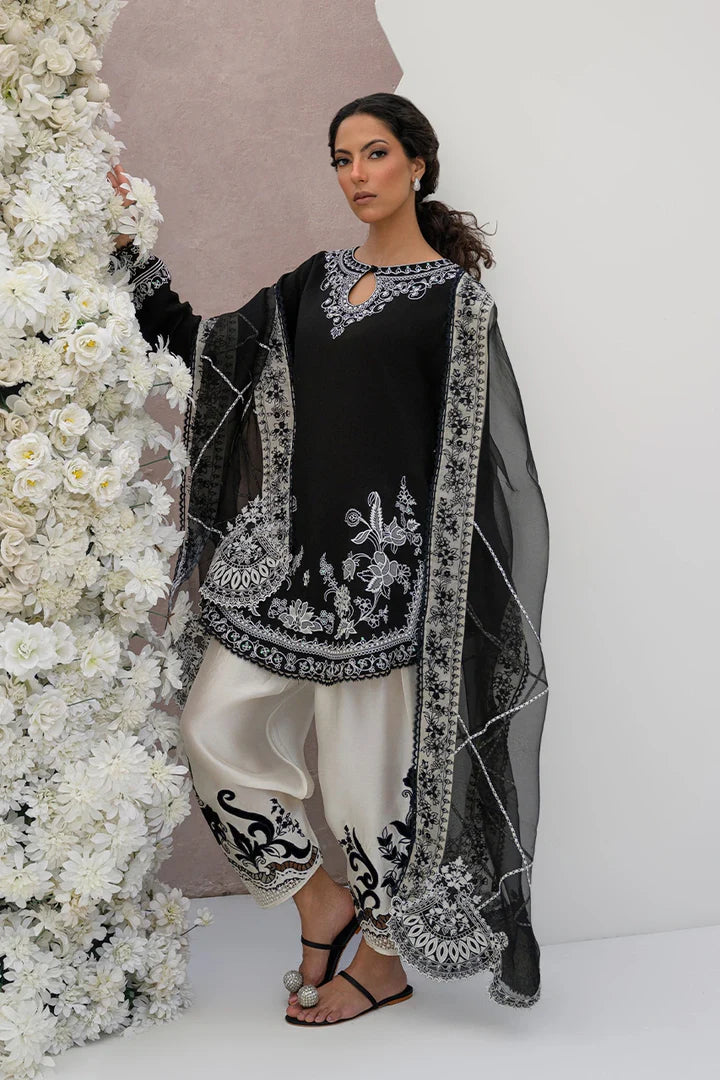 A monochrome moment you wont forget - bold, elegant, and effortlessly statement-making. This black silk karandi shirt features striking ivory appliques, complimented by ivory resham embroidery and sequin detail. The look is further enhanced with a meticulously crafted ivory shalwar with velvet appliques and intricate cutwork. Pair it with a pure organza dupatta rich with embroidered borders along all 4 sides.