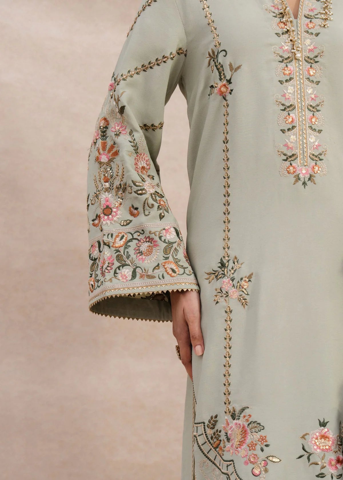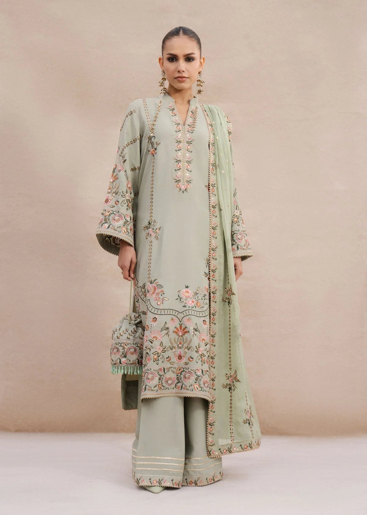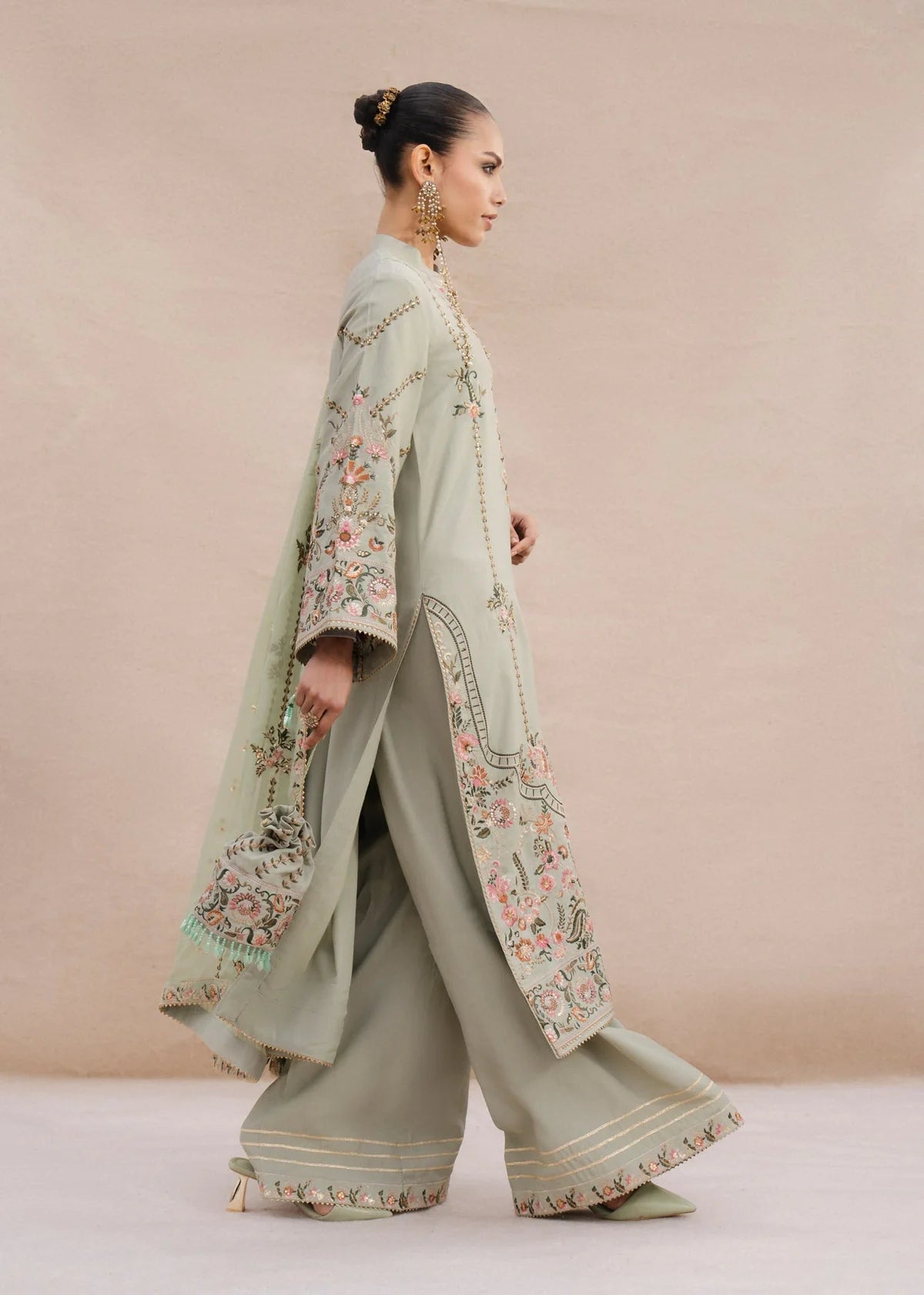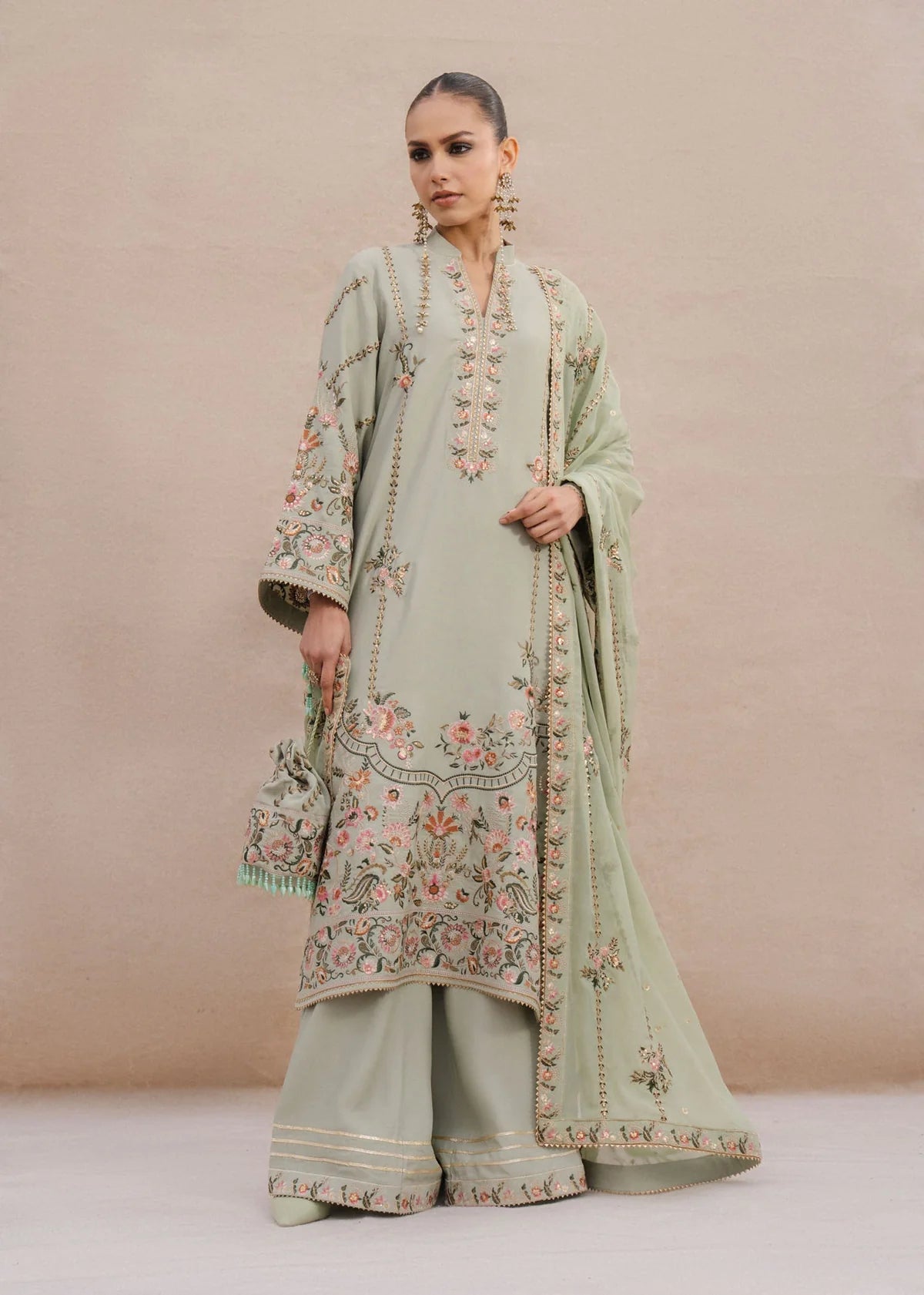 A mint-green long cotton-silk shirt paired with long azaar pants. Embroidered with resham threads in shades of pink, rust, sage green, and ivory, highlighted with matte sitara. Comes with an embroidered chiffon dupatta and subtle gota ribbon details.
