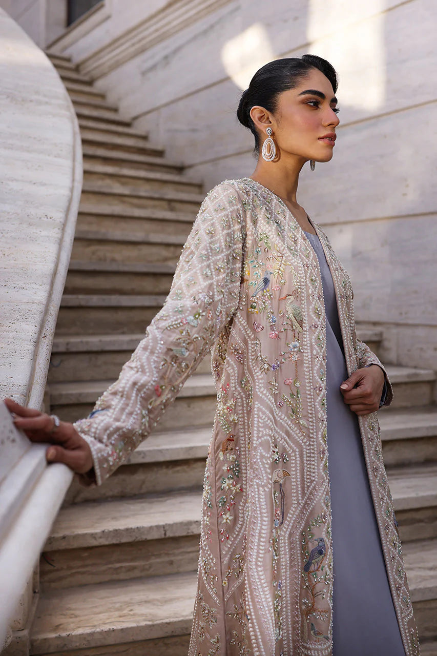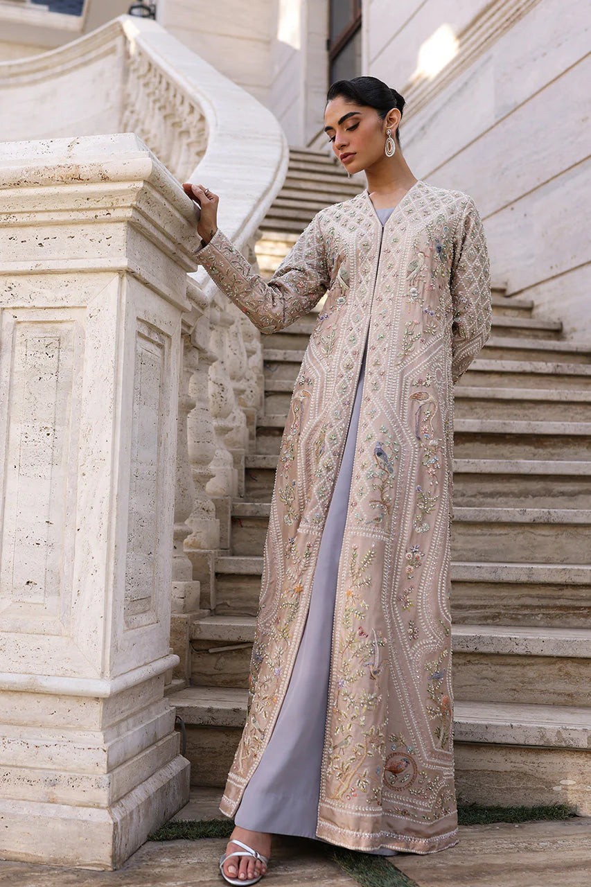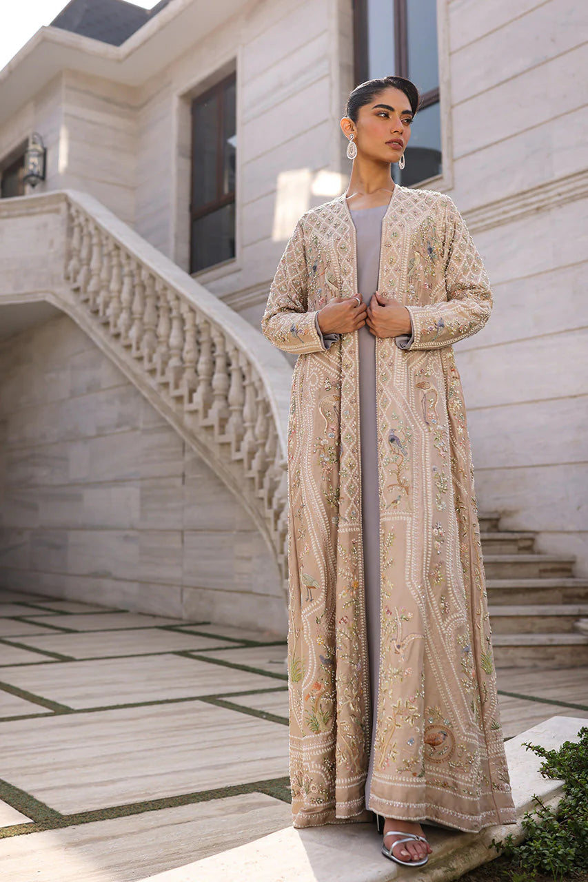 This ensemble reads like a quiet tableau. A floor-length A-line jacket in beige pure silk carries richly detailed scenes of a tranquil paradise — gardens framed by intricate geometric bands and winged creatures perched across the length and sleeves. Soft pastel hand-embroidery in resham, layered with delicate beadwork and touches of silver and white, brings the surface to life without disrupting its fluid fall. Grounding the narrative, a grey georgette kaftan and matching shella offer calm contrast, allowing the jacket’s story- driven handwork to remain the focus.