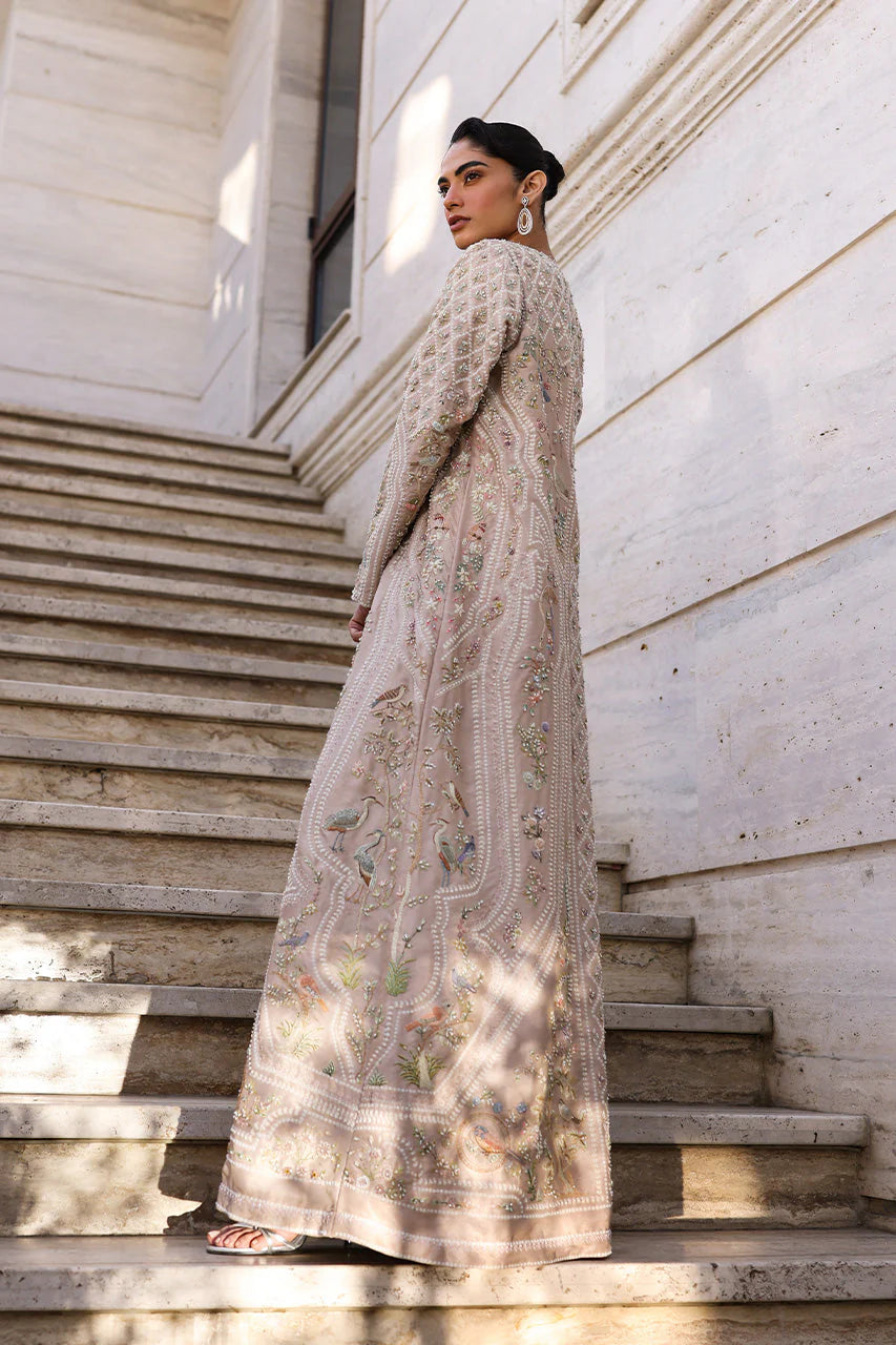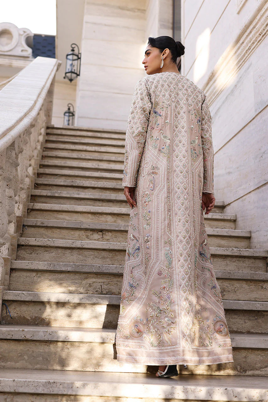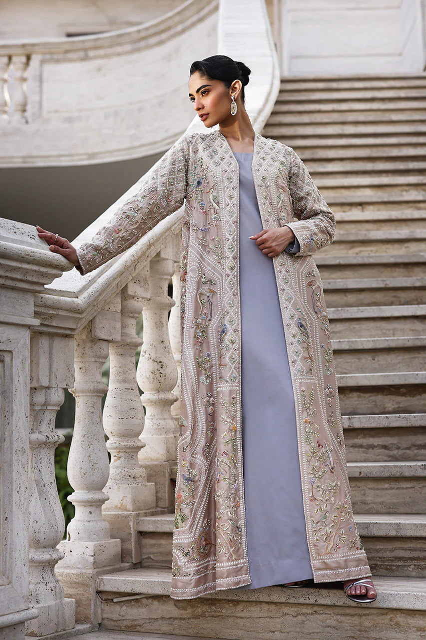 This ensemble reads like a quiet tableau. A floor-length A-line jacket in beige pure silk carries richly detailed scenes of a tranquil paradise — gardens framed by intricate geometric bands and winged creatures perched across the length and sleeves. Soft pastel hand-embroidery in resham, layered with delicate beadwork and touches of silver and white, brings the surface to life without disrupting its fluid fall. Grounding the narrative, a grey georgette kaftan and matching shella offer calm contrast, allowing the jacket’s story- driven handwork to remain the focus.