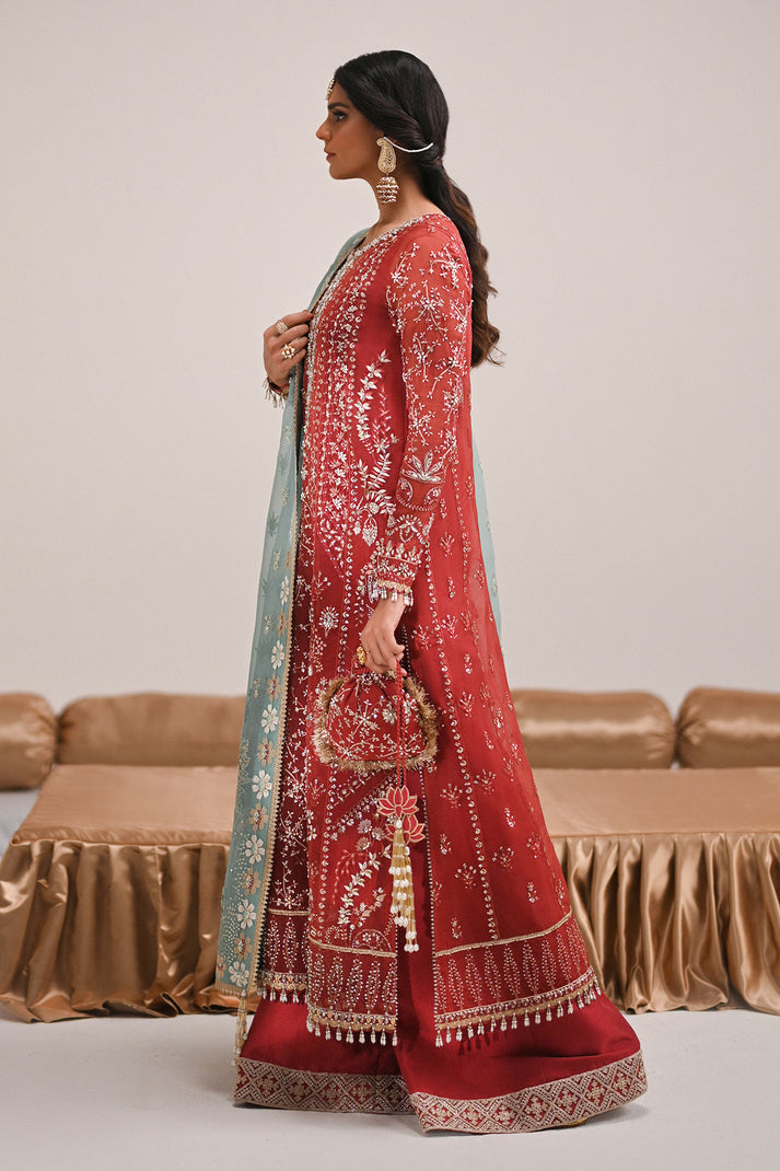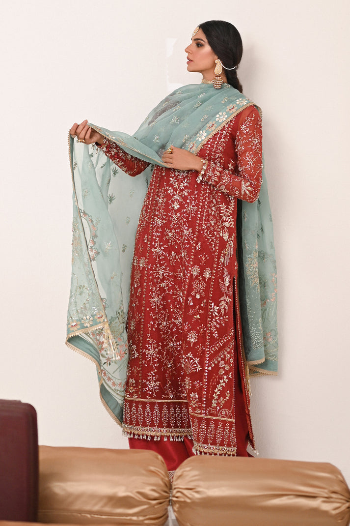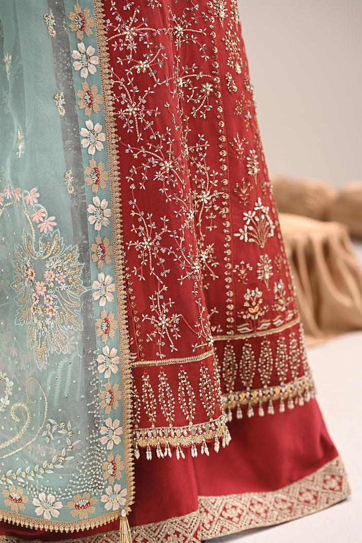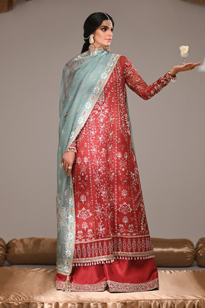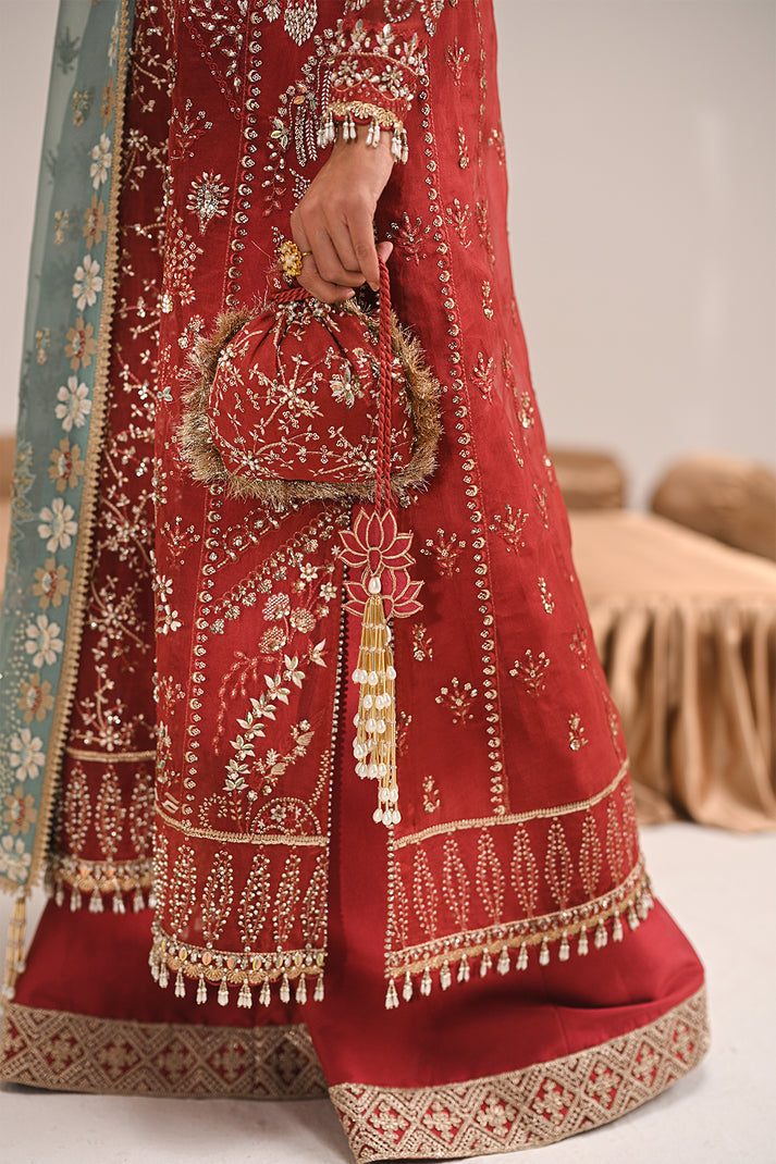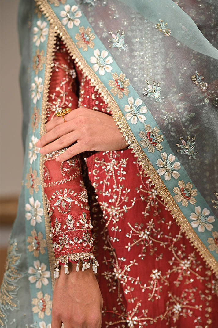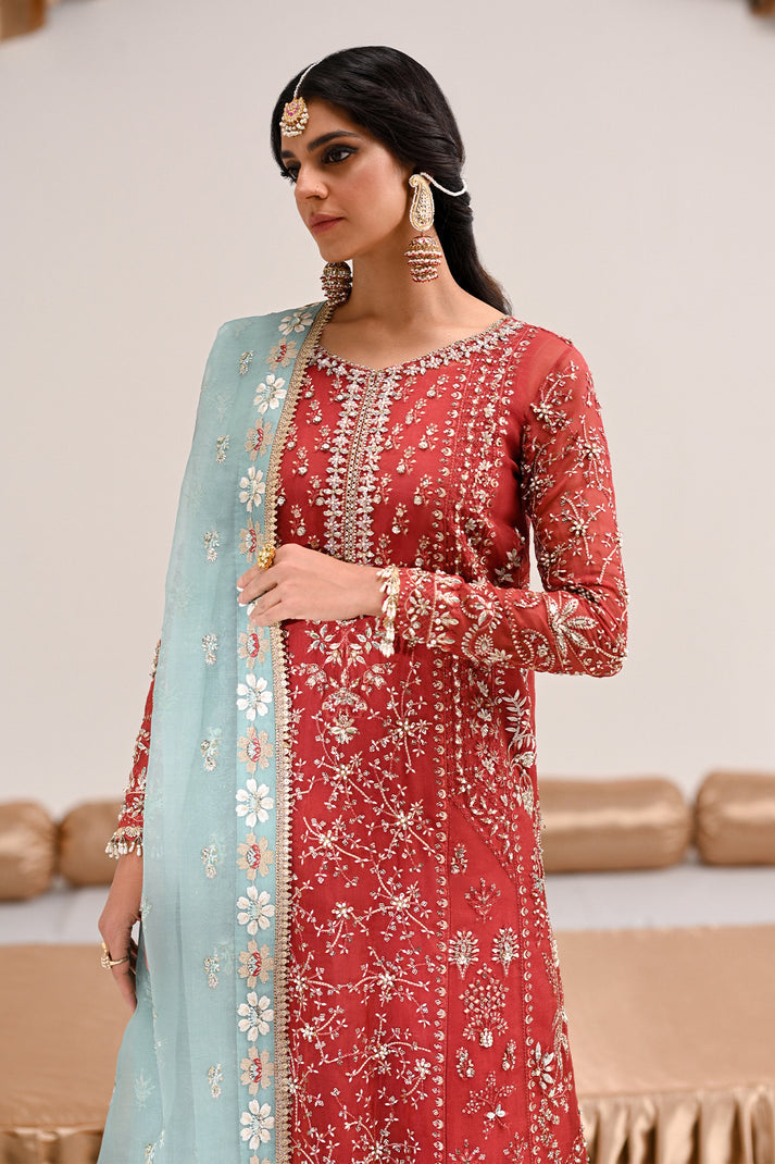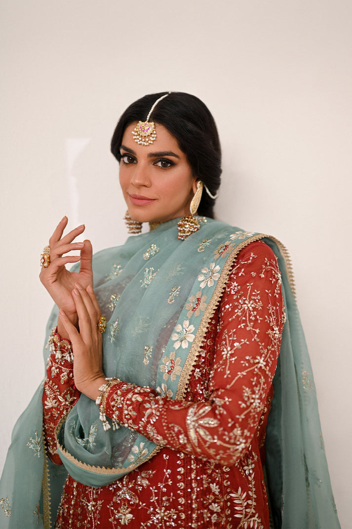 An exquisite rust organza kurta adorned with intricate resham and tilla embroidery, enhanced by delicate hand embellishments. Paired with classic azaar pants and a contrasting turquoise embroidered dupatta, this ensemble is a perfect blend of timeless tradition and modern elegance.