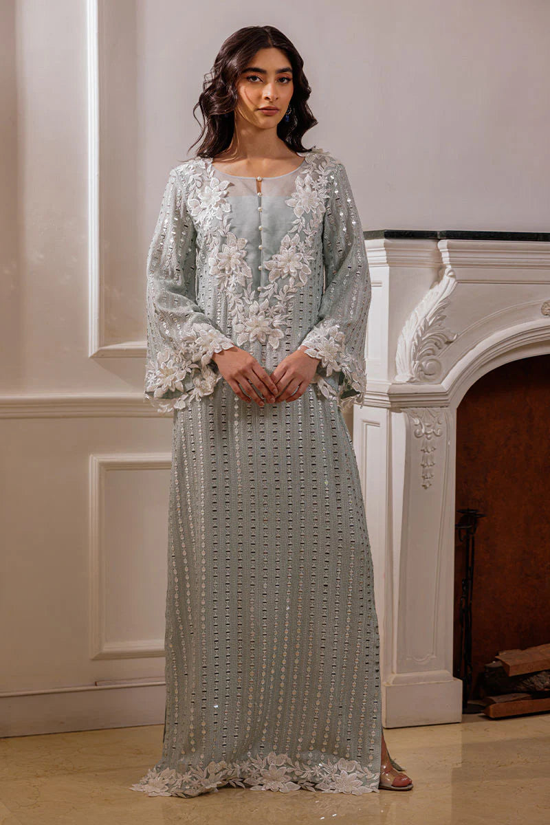 The Nikita bluish-green silk kaftaan shirt is adorned with delicate embroidery and foil work, complemented by cutwork 3D floral details on the neckline. Pearls embellish both the front and back neckline, as well as the sleeves, adding a luxurious touch. The design includes a side slit for an elegant finish.