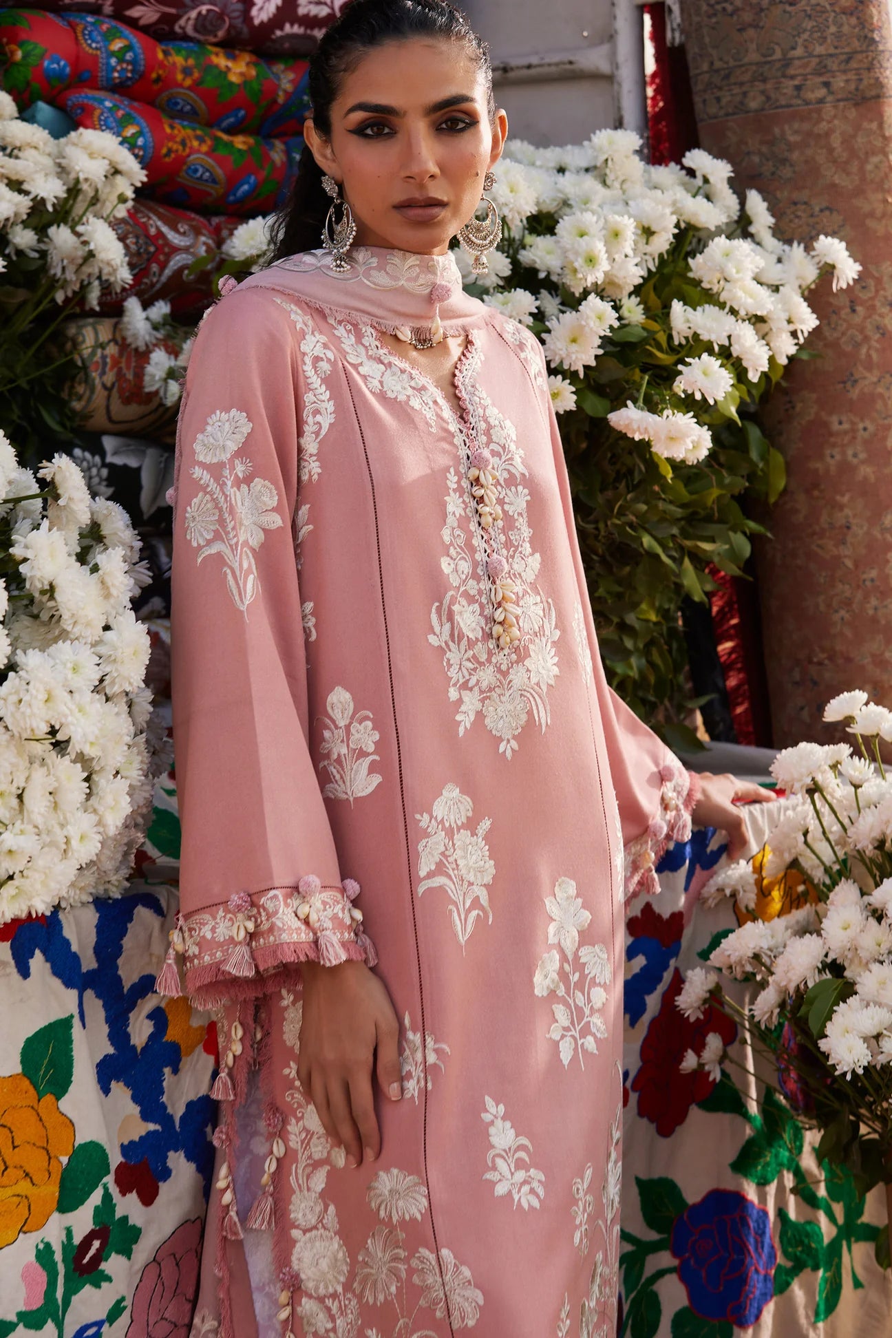 *Nira* — Woven on premium winter karandi, this soft rose ensemble exudes warmth, refinement, and quiet femininity. The fabric’s natural texture gives the outfit a rich, grounded feel, while the delicate ivory florals unfurl across the shirt like hand-painted winter blooms. Subtle threadwork, airy vines, and thoughtfully placed motifs add depth and movement, creating a soft yet striking visual story. Finished with graceful borders and a serene palette, *Raina* embodies an elegant winter mood — gentle, poetic, and beautifully crafted for the woman who loves understated luxury.