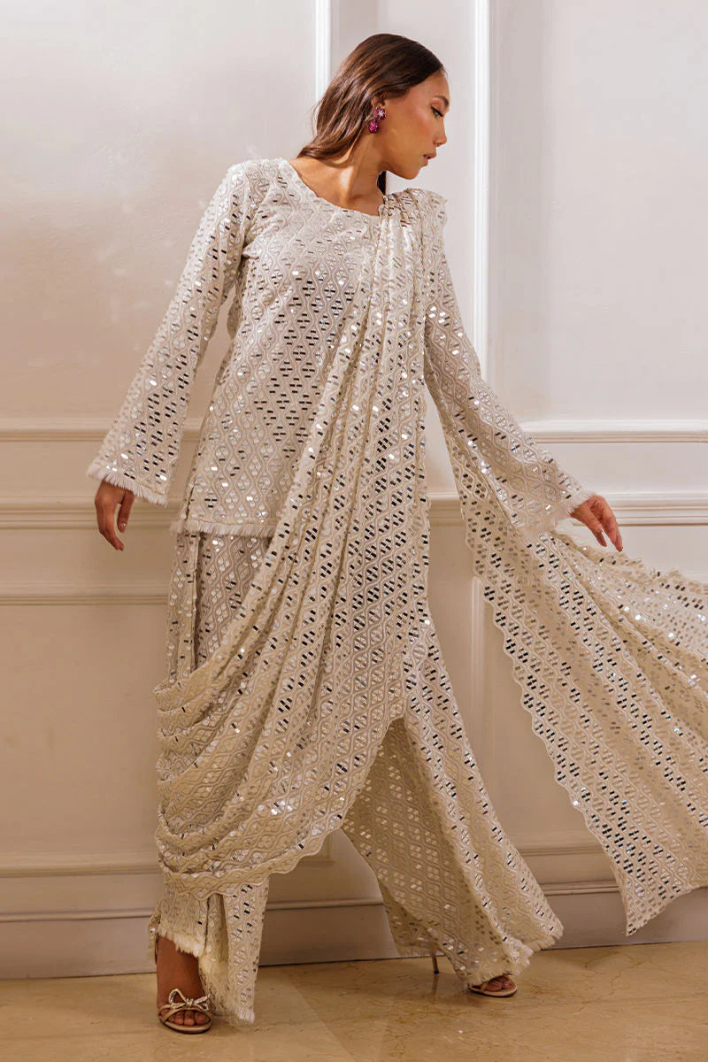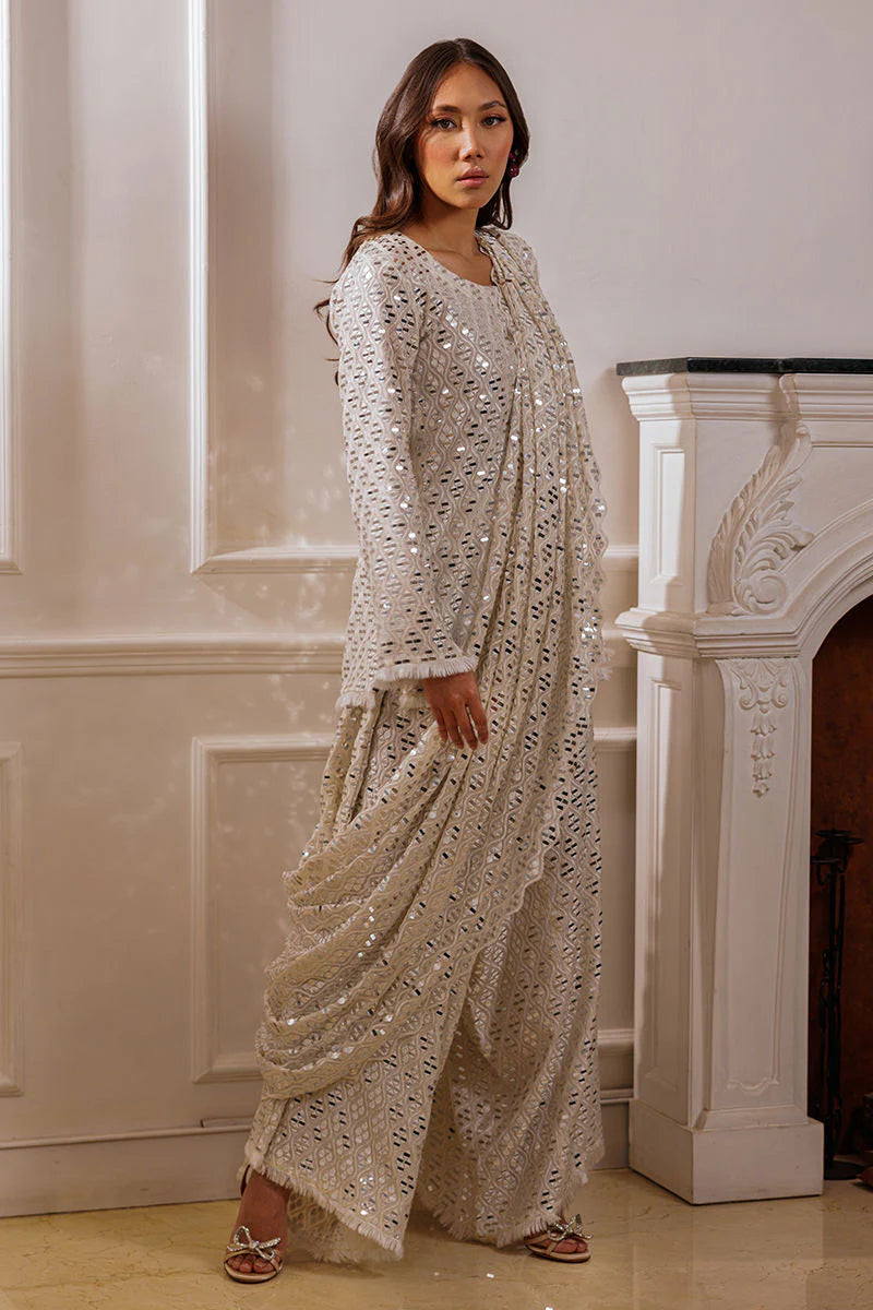 The Nireen ensemble features an ivory shirt adorned with intricate thread and foil work throughout, complemented by handmade thread bail detailing on the sleeves and pants. The outfit is paired with a gracefully draped, stitched dupatta that rests effortlessly on the shoulder for a chic finish.