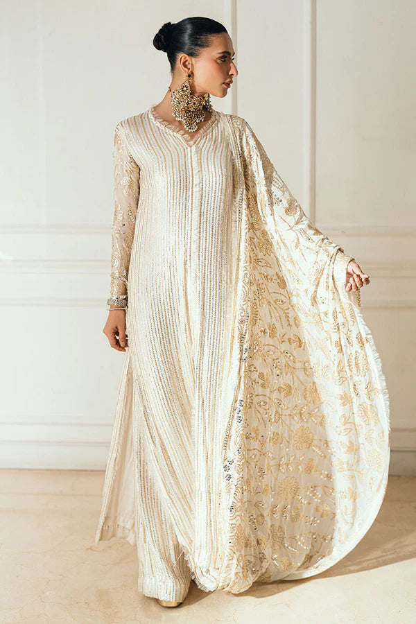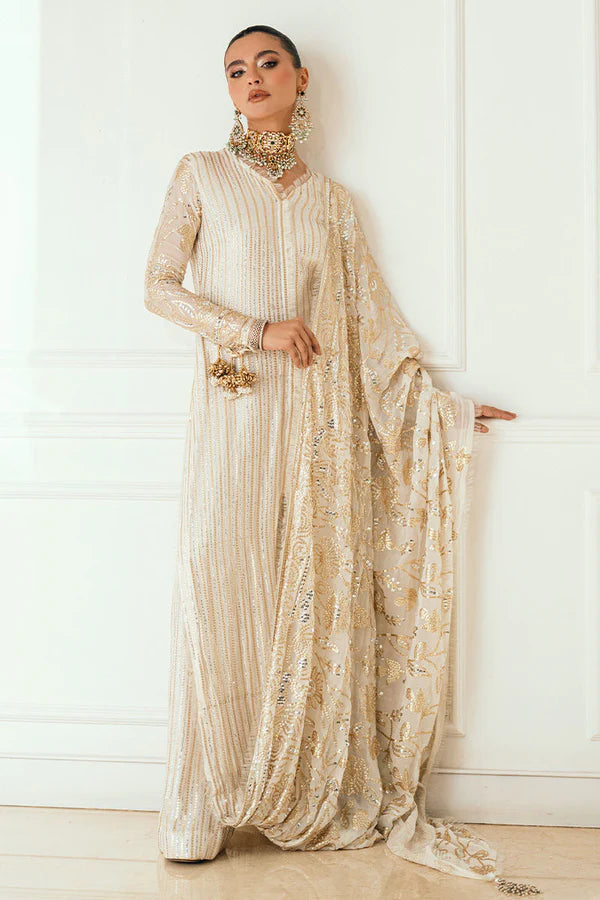 Nisha is an elegant off-white chiffon ensemble featuring intricate sequin work on both the shirt and pants. The outfit is complemented with a full sequin jaal dupatta, attached to the shirt for a cohesive and luxurious look. The shirt and pants are lined with cotton silk for comfort, while handmade threadwork on the shirt and delicate tassels on the sleeves add refined detailing.