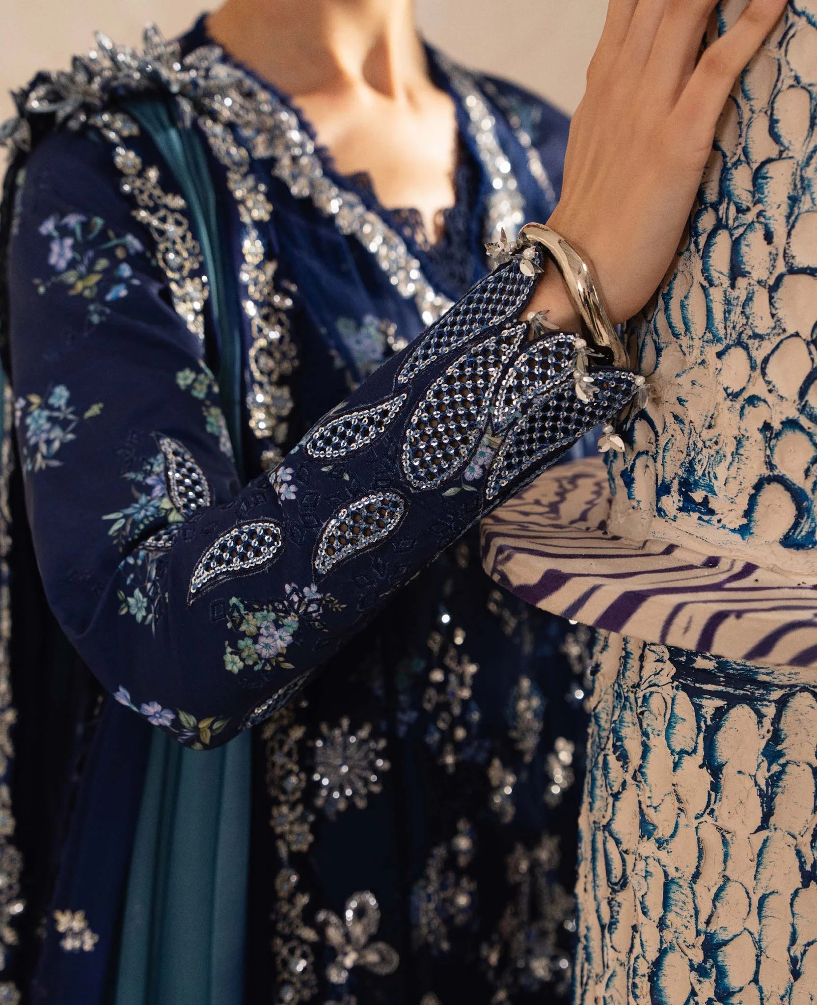 An elegant formal ethnic ensemble exuding a regal, contemporary charm. Crafted on a deep navy blue net base, the outfit is elevated with intricate silver embroidery that forms a luminous contrast. The long, straight-cut kurta features finely detailed embellishment along the neckline, sleeves, and hem, with dense floral and ornamental motifs cascading across the front. It is paired with a printed raw silk dhakka shalwar with coordinated printed lining, adding depth and texture. A sheer, two-toned teal and blue dupatta with subtle embellishment completes the look, lending softness and graceful balance to the richly embroidered silhouette.