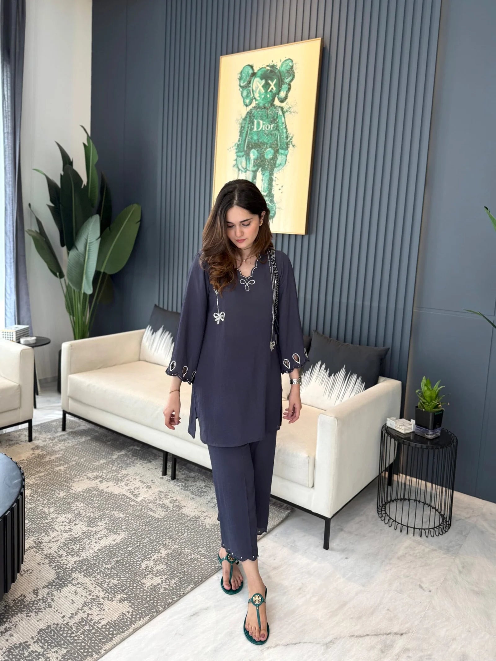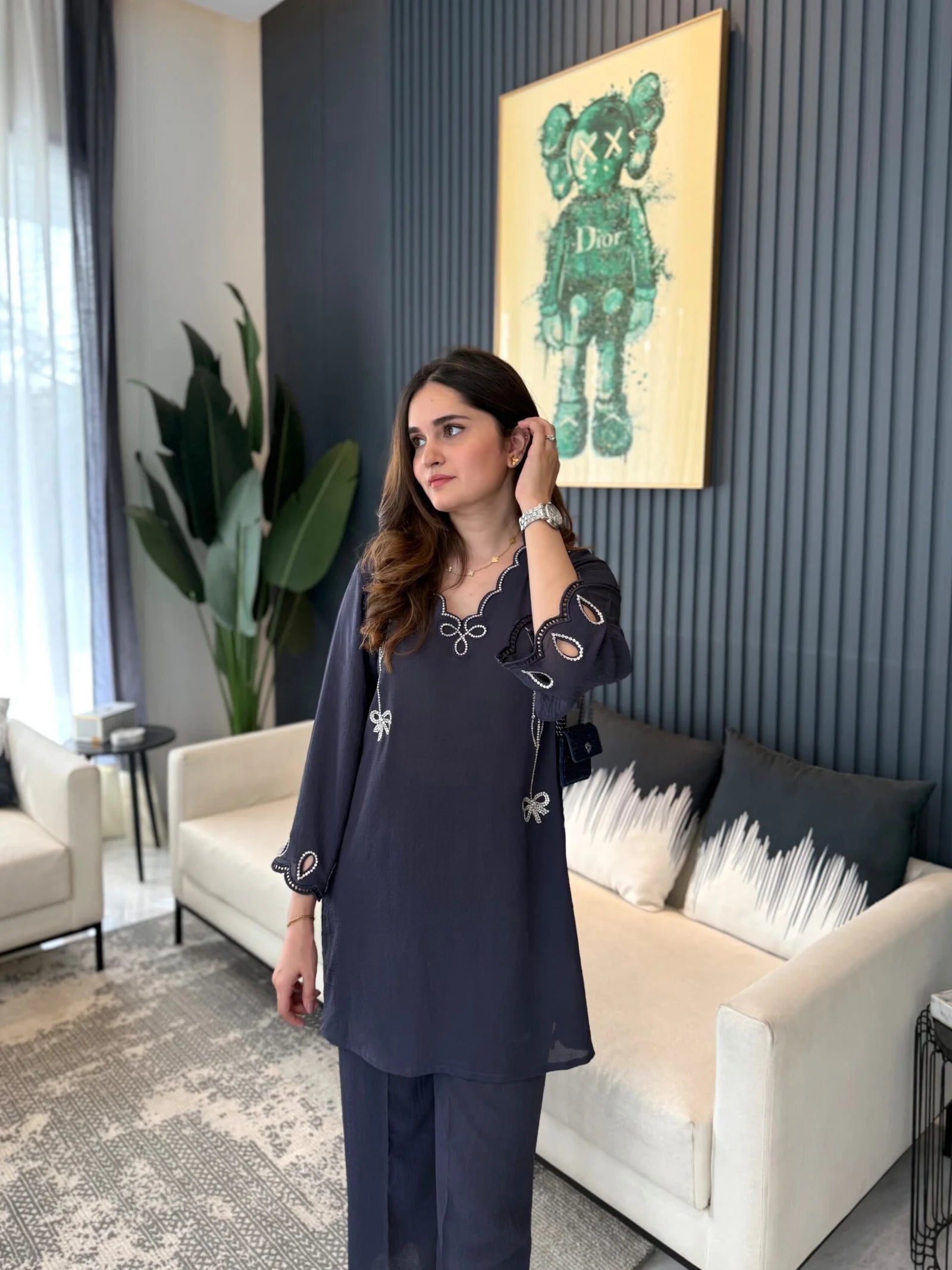 This stunning Grey Co-ord set is a masterpiece of elegance and sophistication. Crafted from luxurious fabric, the classic outfit features scalupped cutwork neckline and sleeves with intricate swarovski work. Front is further adorned with handwork hanging bows .