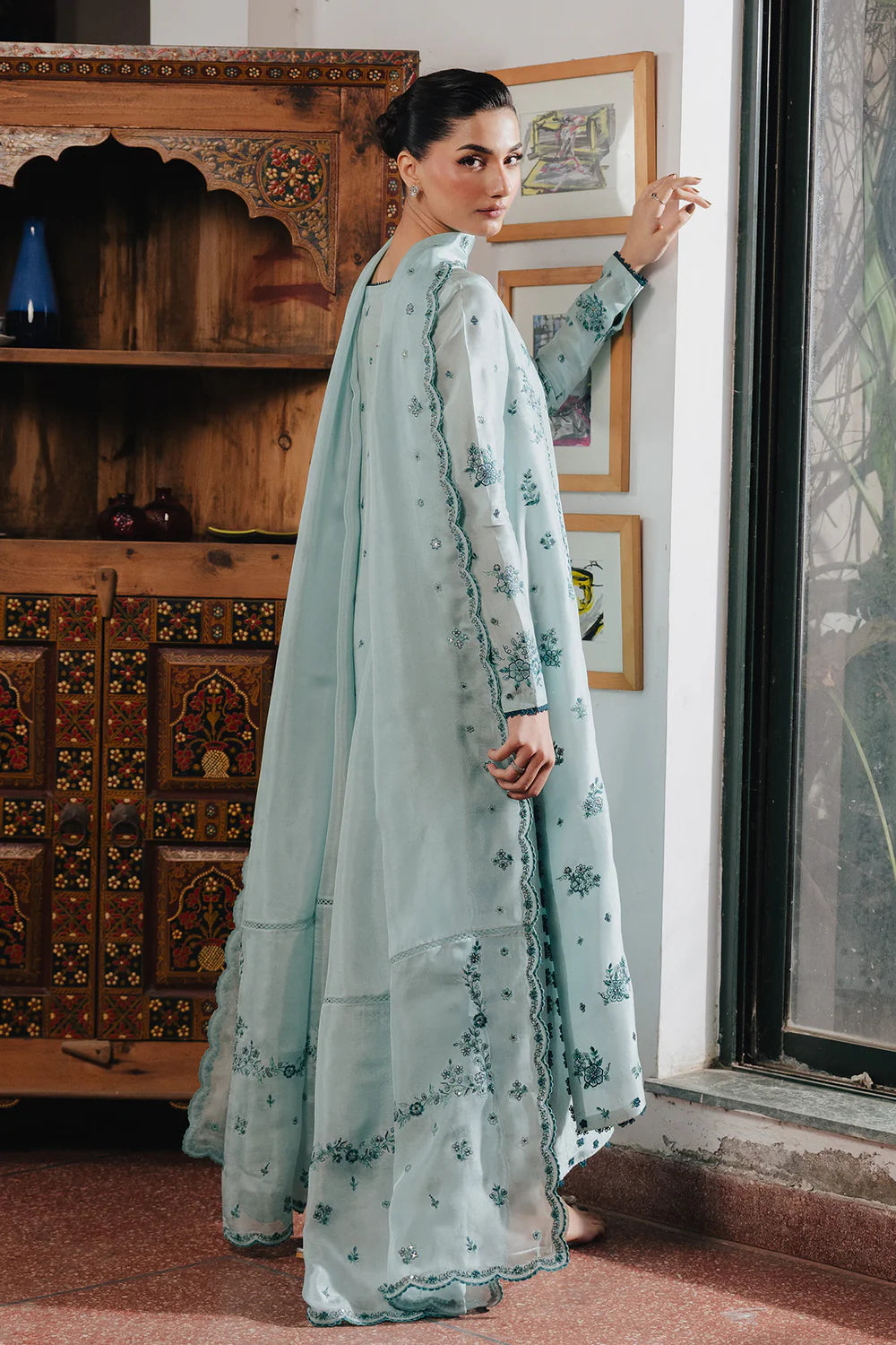 A sky blue shirt adorned with intricate embroidery, paired with loose-fit pants featuring delicate lacework and a beautifully embroidered silk dupatta.