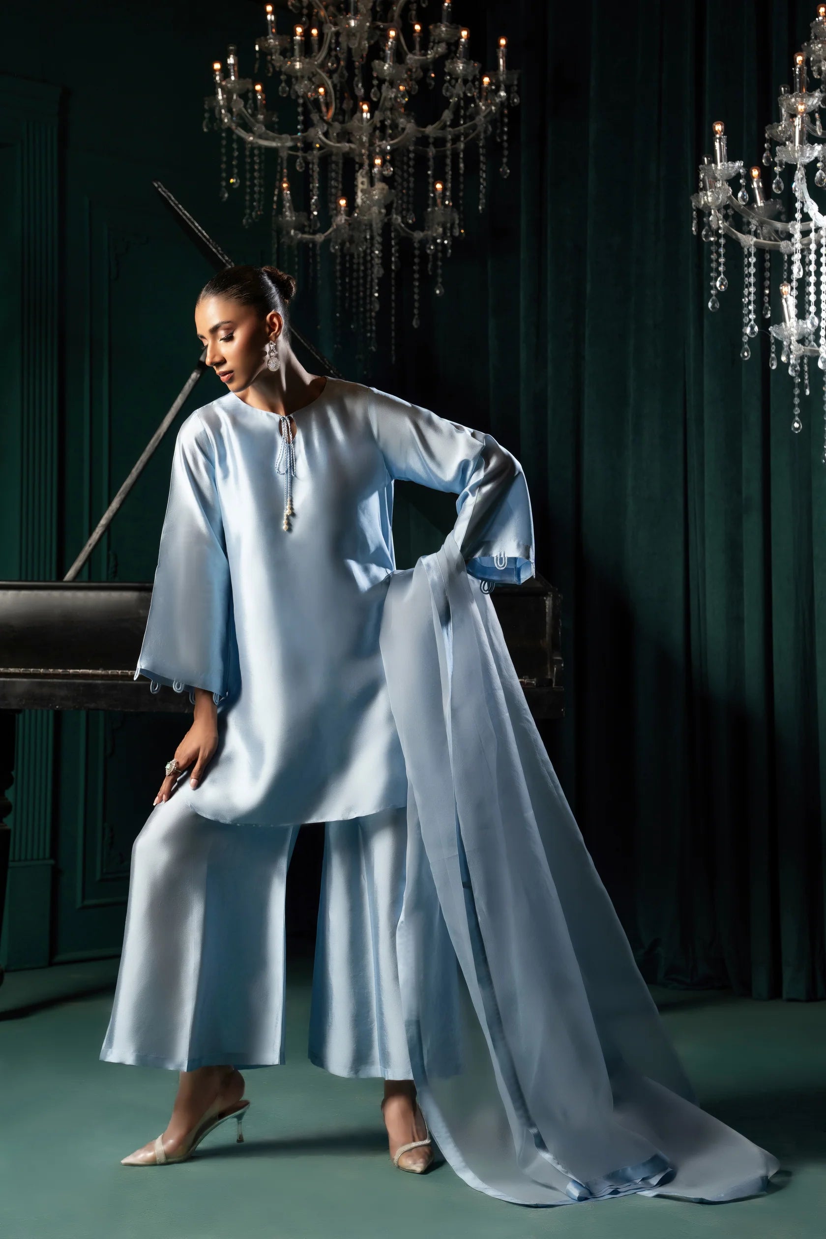 Short shirt with crew neck and keyhole. The dangling pearls give the outfit a very chic look. The bell-shaped sleeves feature fabric looping details. Paired with Dhaka pants and an organza dupatta.