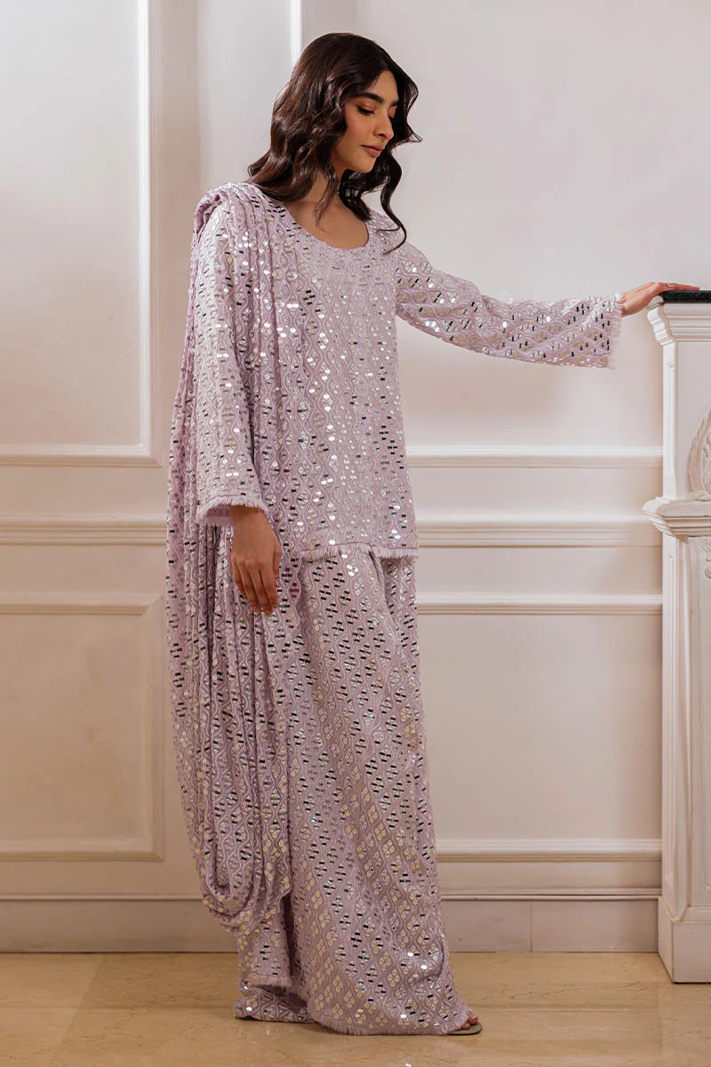 The Nyra ensemble features a lavender-hued shirt adorned with delicate thread and foil work throughout. The look is elevated with handmade thread bail detailing on the sleeves and pants. Paired with a gracefully draped stitched dupatta, designed for effortless styling, this ensemble exudes timeless elegance.