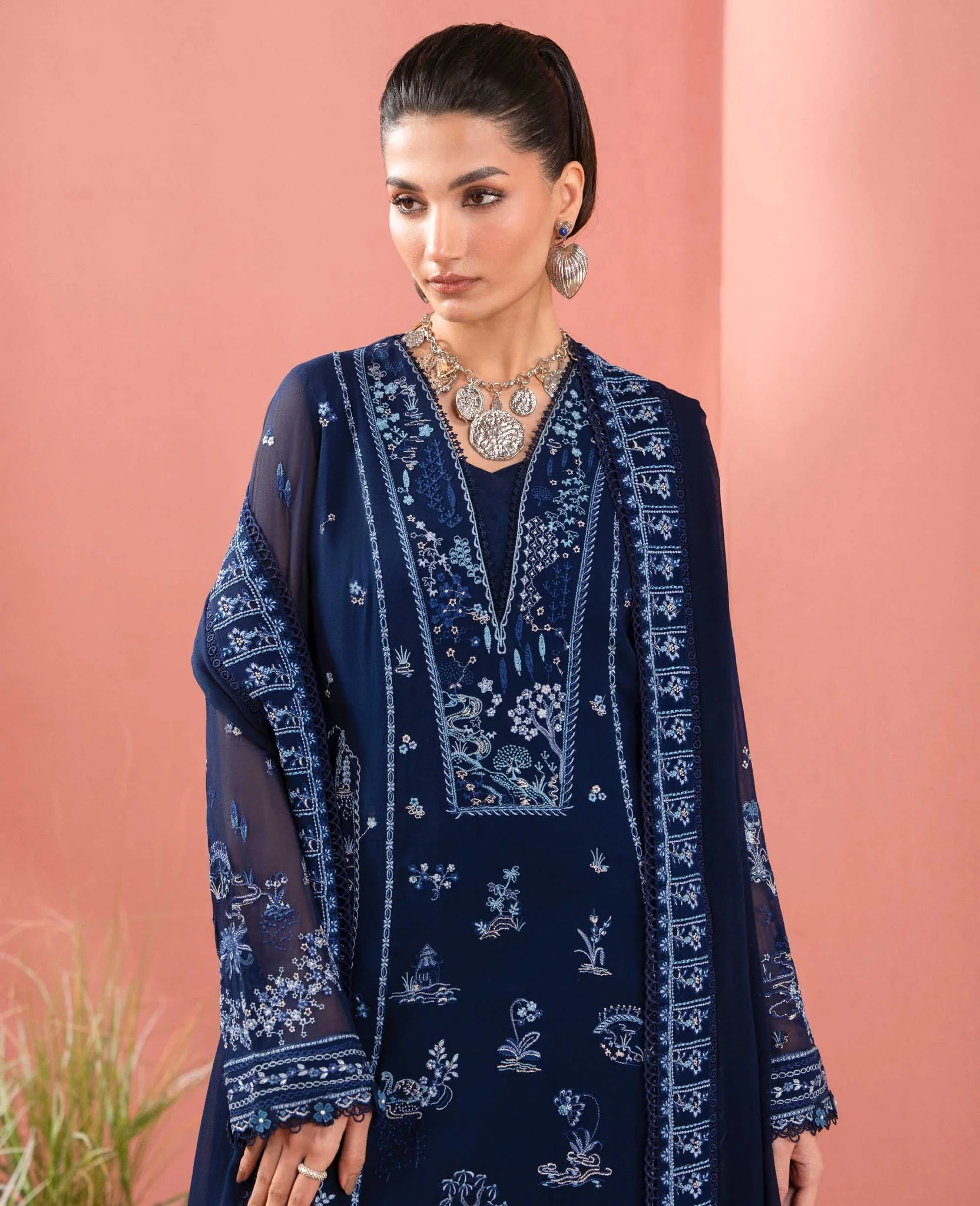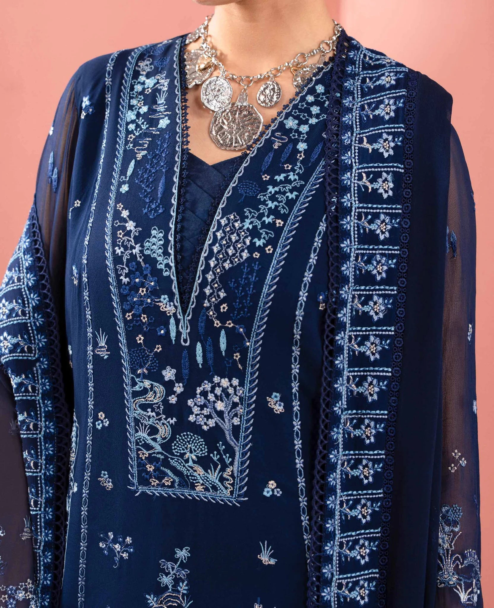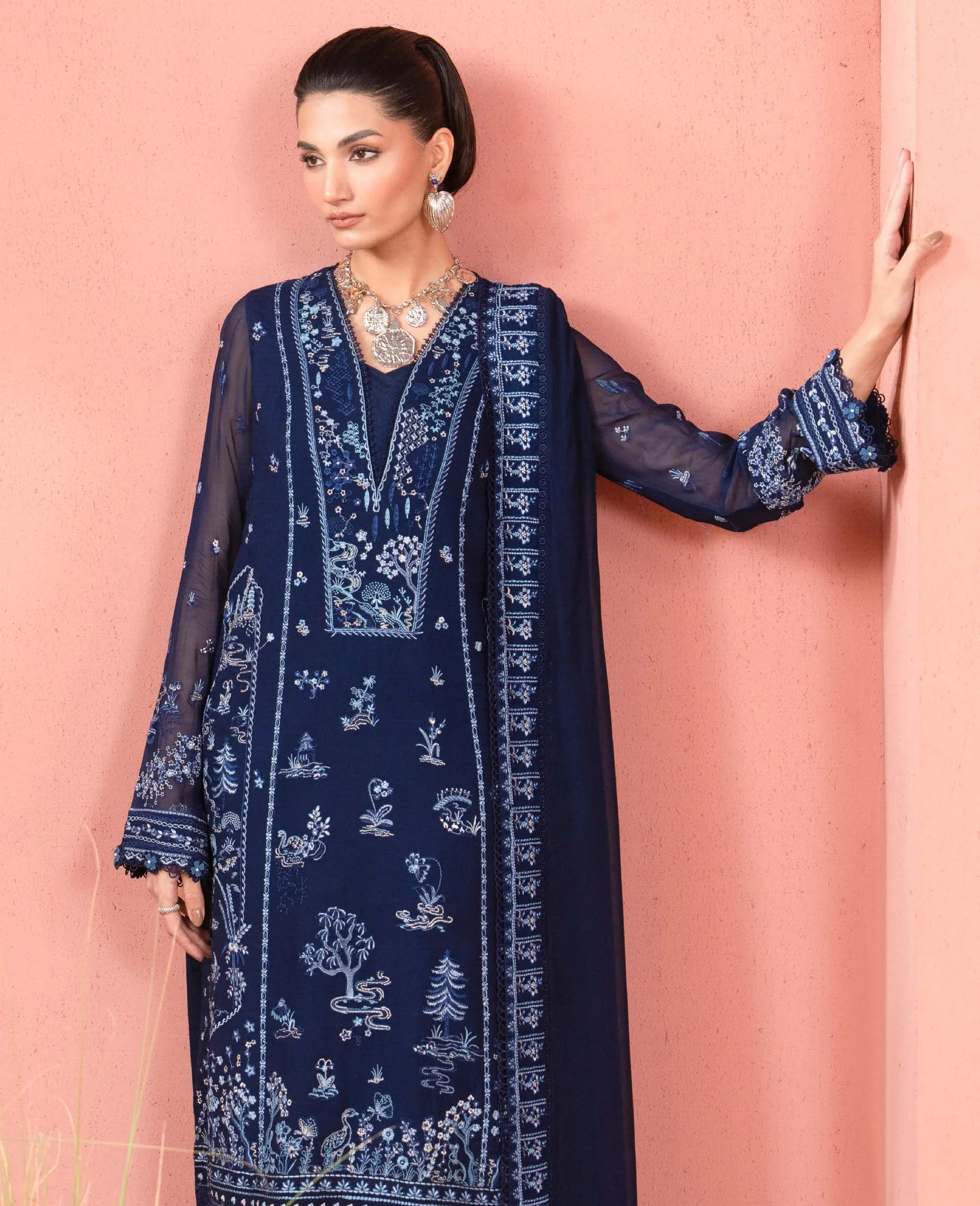 A navy chiffon dress adorned with shikargah-inspired embroidery in layered tones of blue, creating a refined monochromatic allure. Paired with a raw silk trouser and slip for structure and ease, the ensemble is completed with an embroidered chiffon dupatta that adds softness and movement. The square neckline lends a modern, statement edge, making this design effortlessly ready to wear for any occasion timeless, versatile, and thoughtfully crafted.