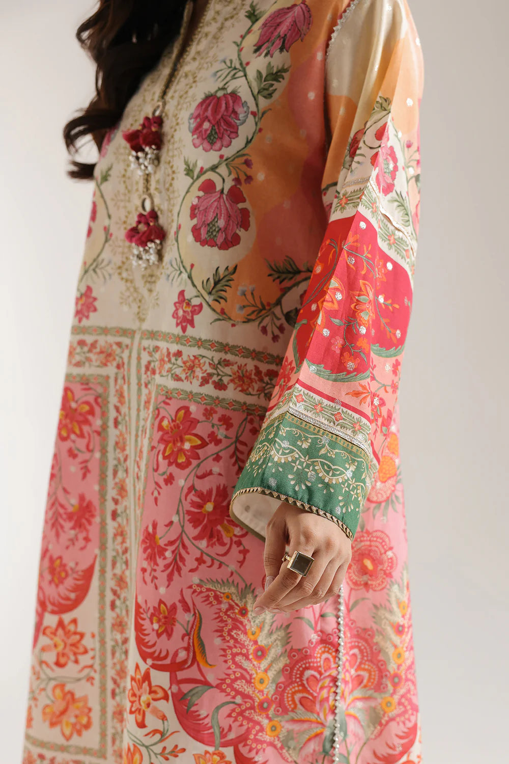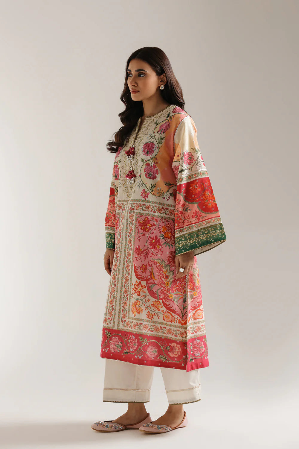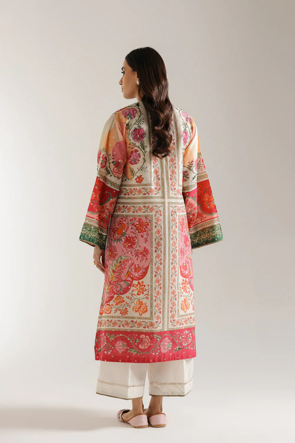 Drape yourself in luxury with this stunning printed jacquard shirt, intricately woven with shimmering zari. The rich, multi-colored floral and botanical print, in vibrant shades of pink, orange, green, and red, blooms against a delicate off-white base, creating a truly captivating visual. The exquisite zari work woven into the fabric adds a subtle yet opulent sheen, elevating the design. The shirt features a beautifully detailed neckline with ornate accents and gracefully flared sleeves adorned with complementary patterns and borders. Paired with classic white culotte, this ensemble offers a sophisticated and comfortable silhouette, perfect for festive occasions and formal gatherings.