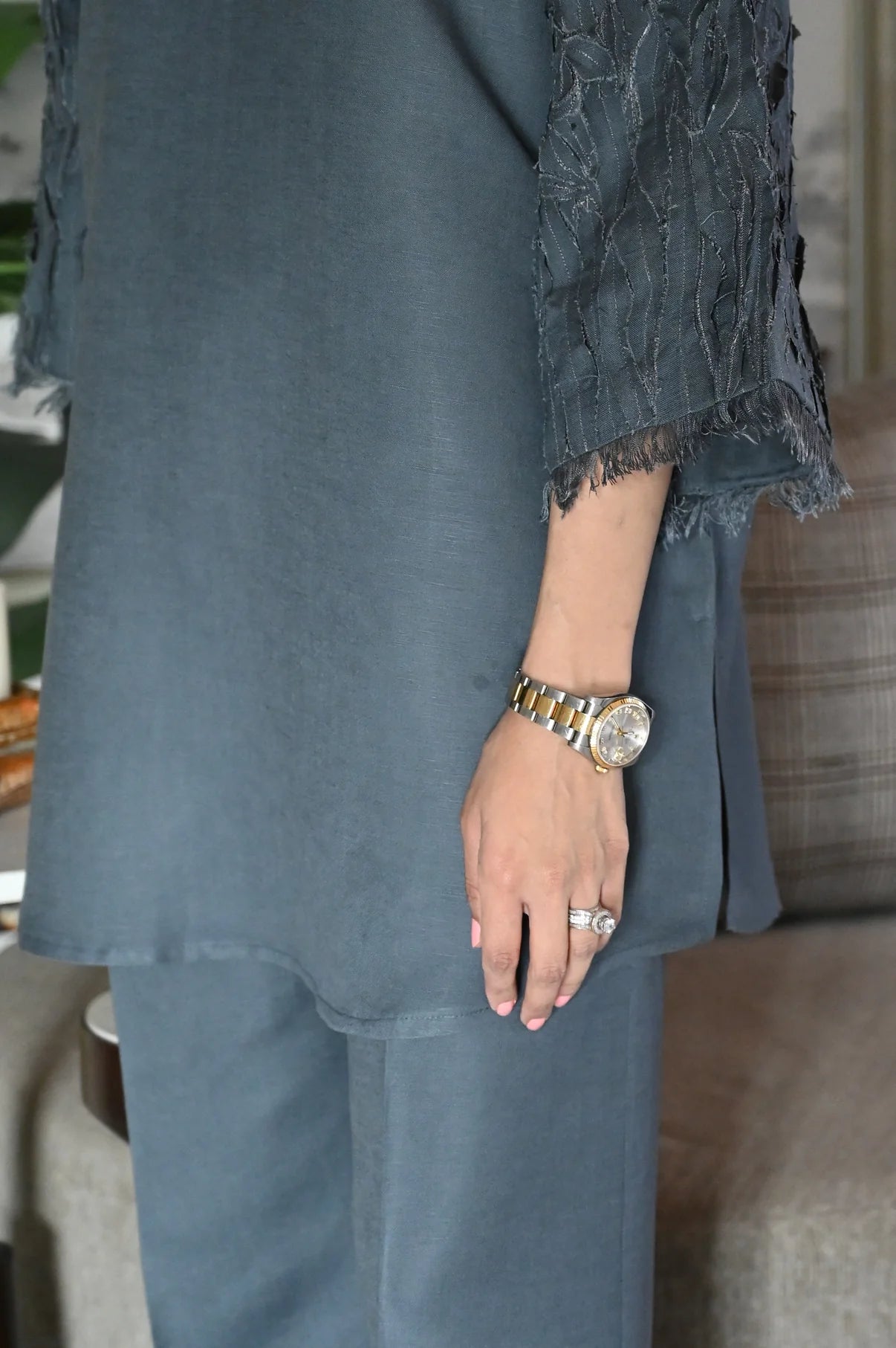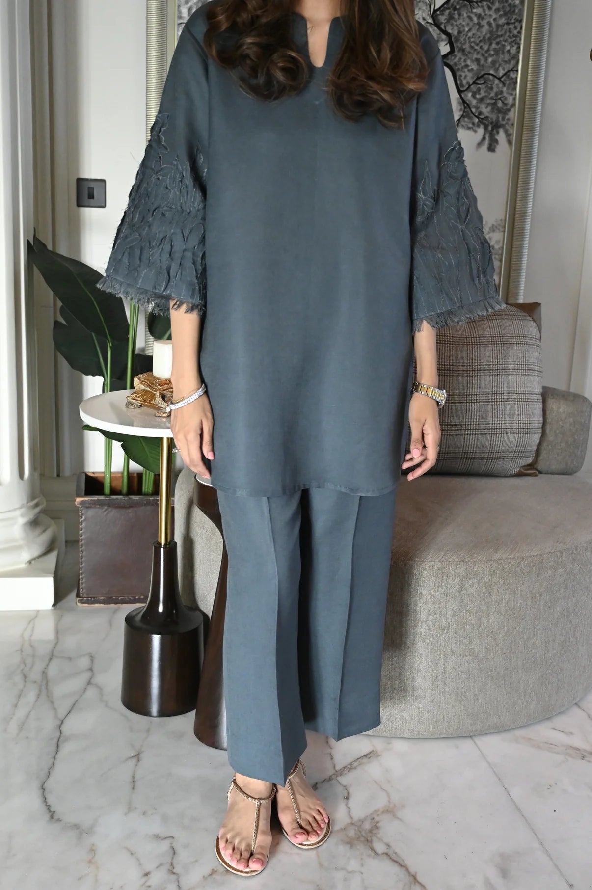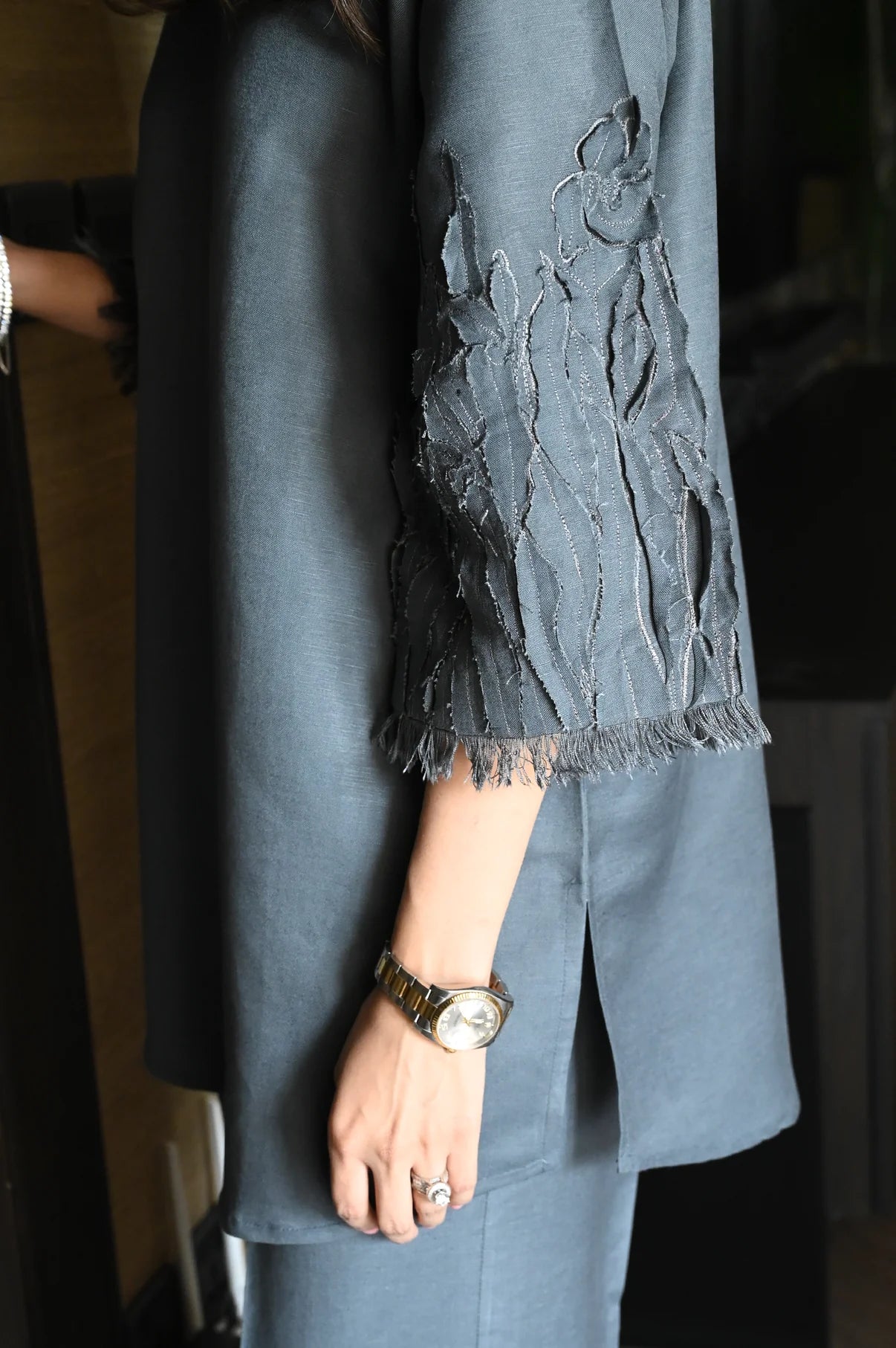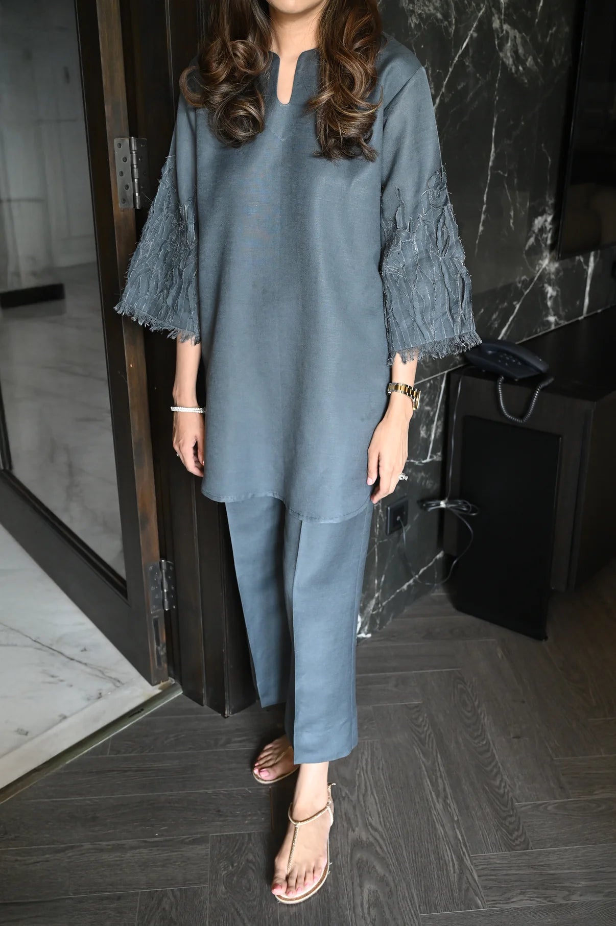A grey two-piece set featuring a straight-cut kurta with textured appliqué detailing on the sleeves, paired with wide-leg trousers.