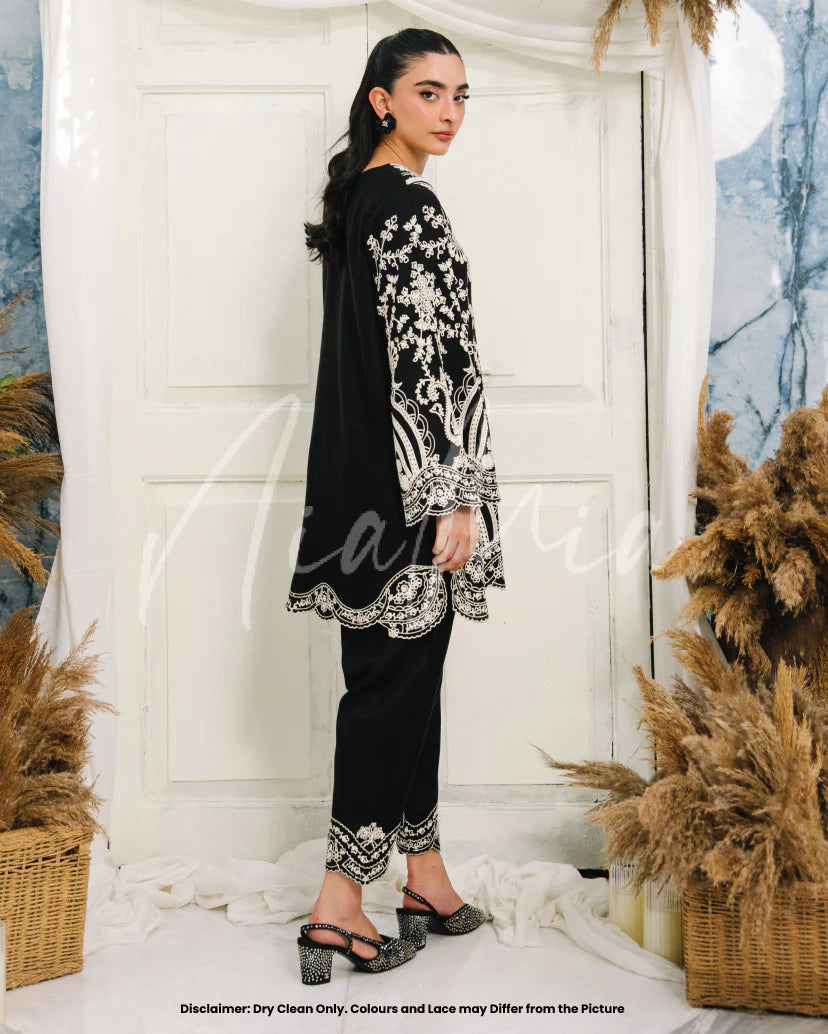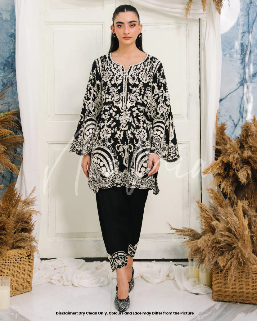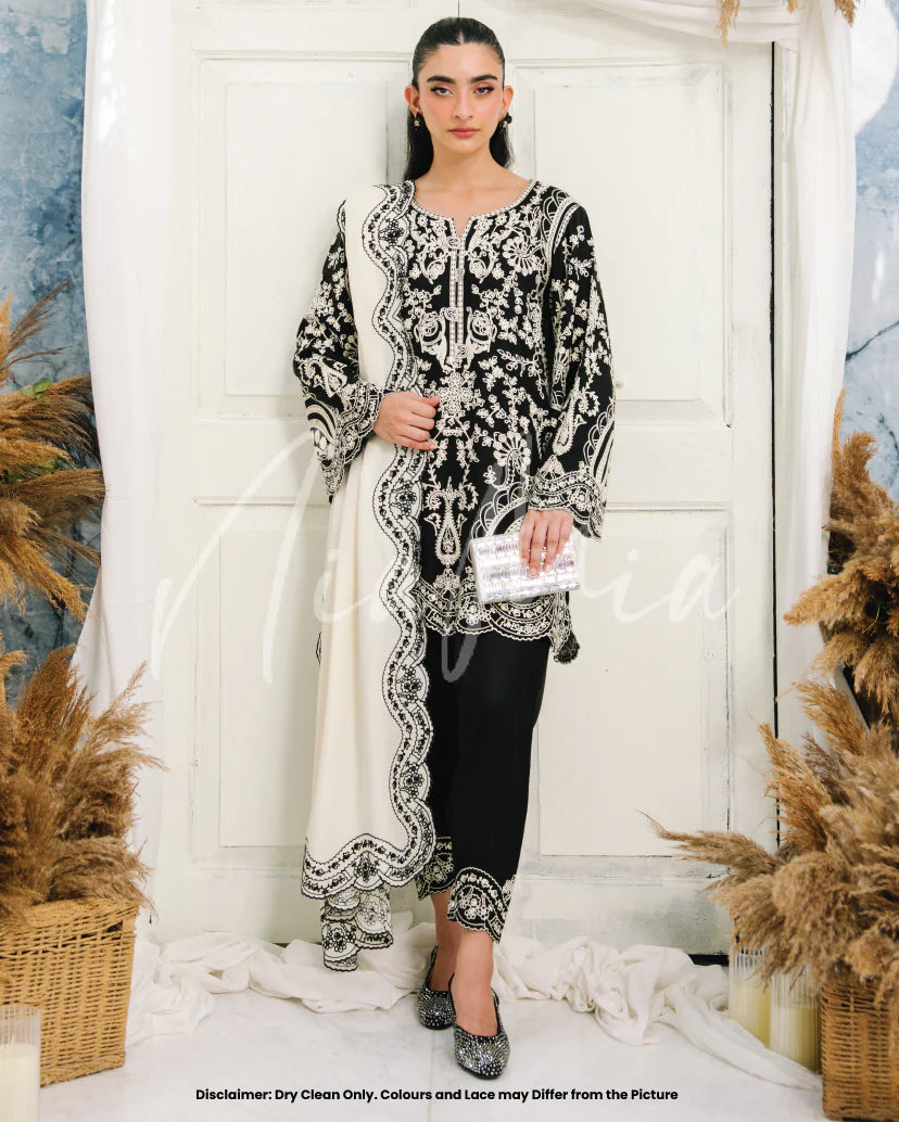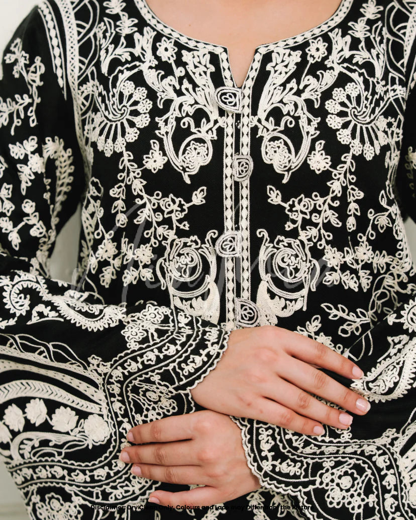 A pashmina black embroidered kurta paired with matching black skinny shalwar, featuring intricate white aari work. It’s styled with an ivory shawl edged in detailed black embroidery, adding a rich and elegant contrast.