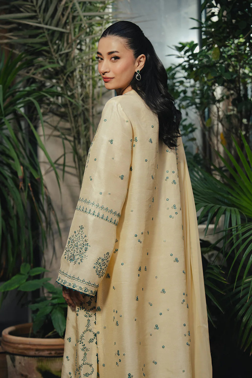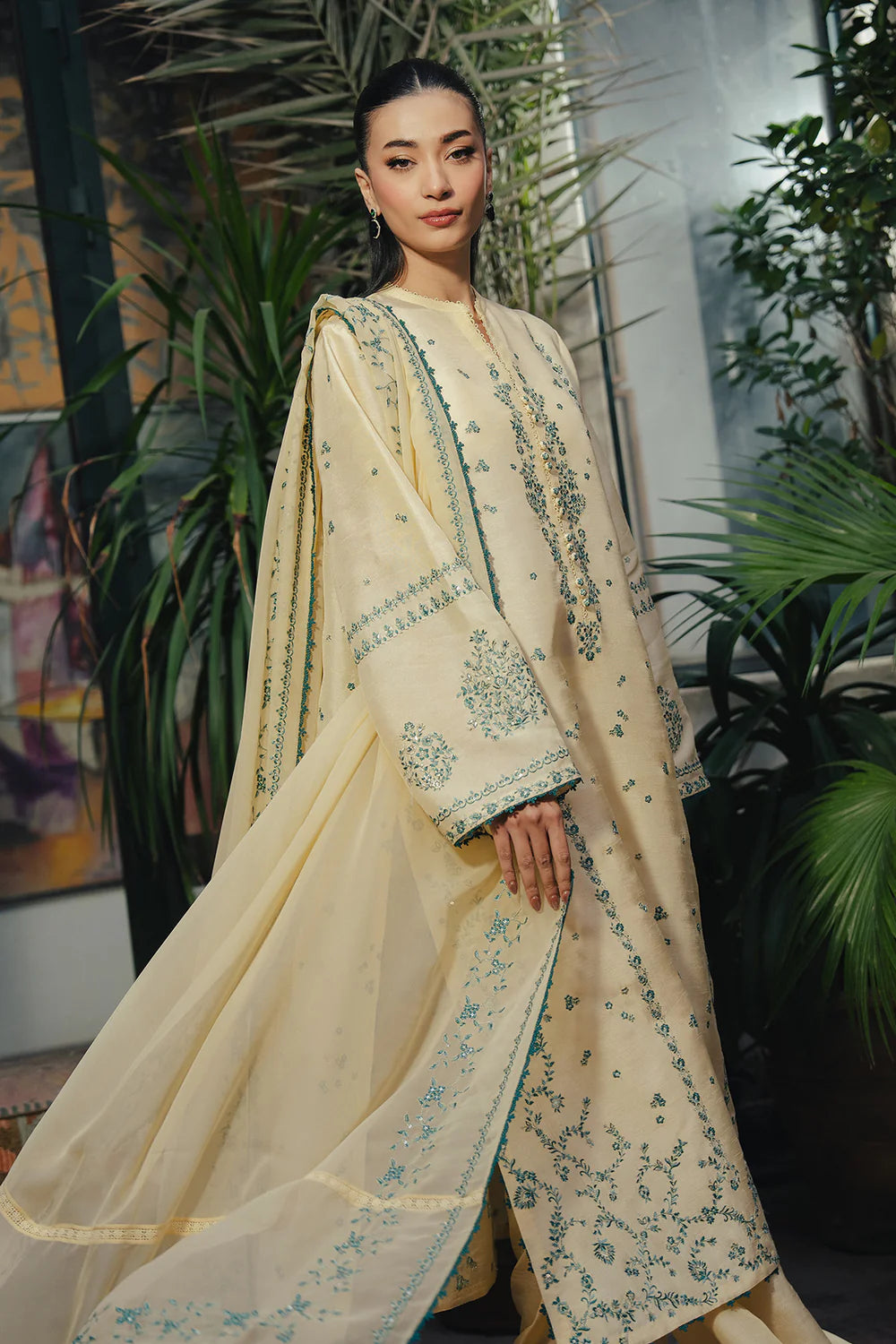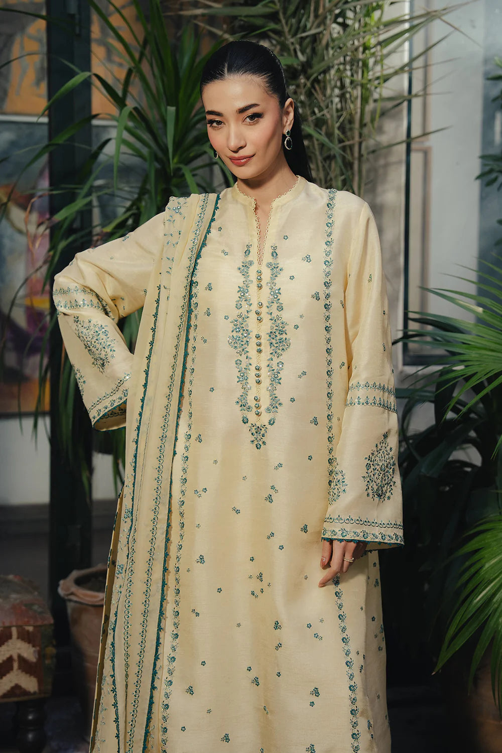 A loose-fit butter yellow shirt adorned with intricate contrasting embroidery, paired with straight embroidered pants and an embroidered dupatta.