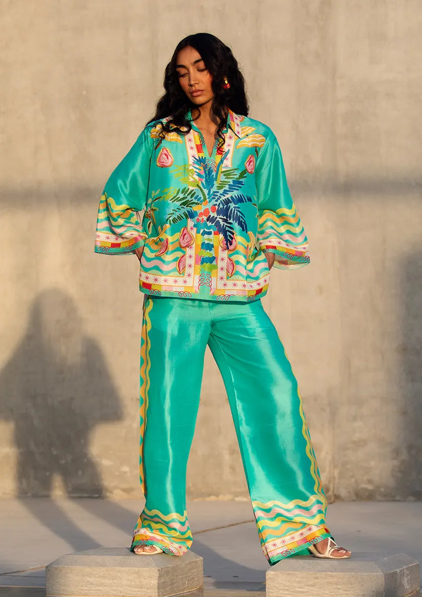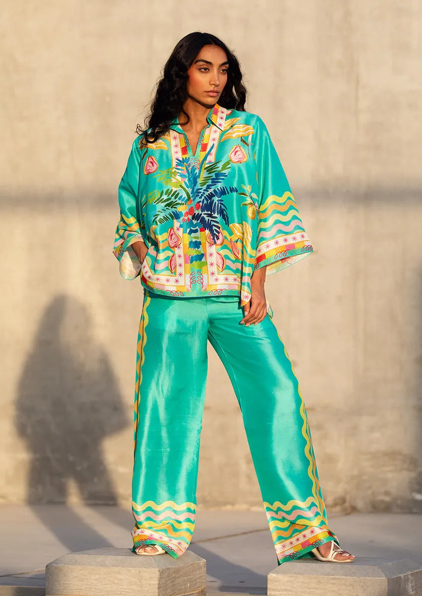 Cut from pure, weightless raw silk in a saturated turquoise hue, the Orla set channels high-summer ease with painterly precision. A lush medley of hand-rendered fruits, vines, and florals cascades down the front in expressive watercolor strokes in blush pink, lemon zest, lime, true blue, and verdant green tones.