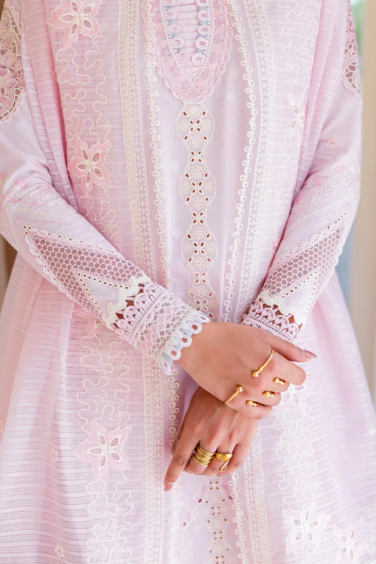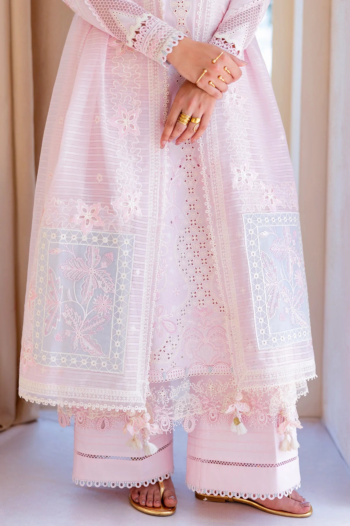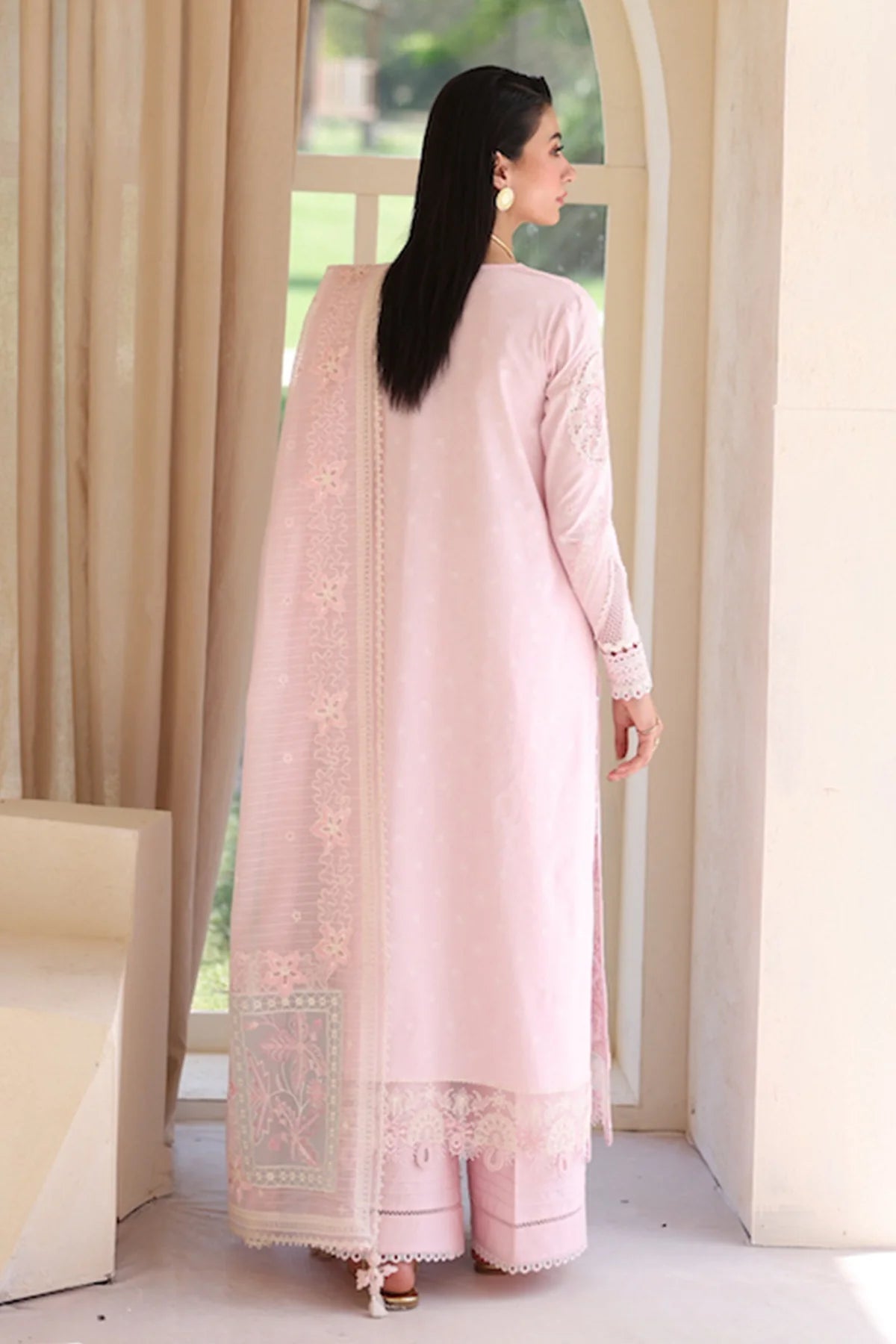 Feather showcases a jacquard weaved shirt styled with a jacquard dupatta and cotton trousers, creating a refined silhouette with soft charm.